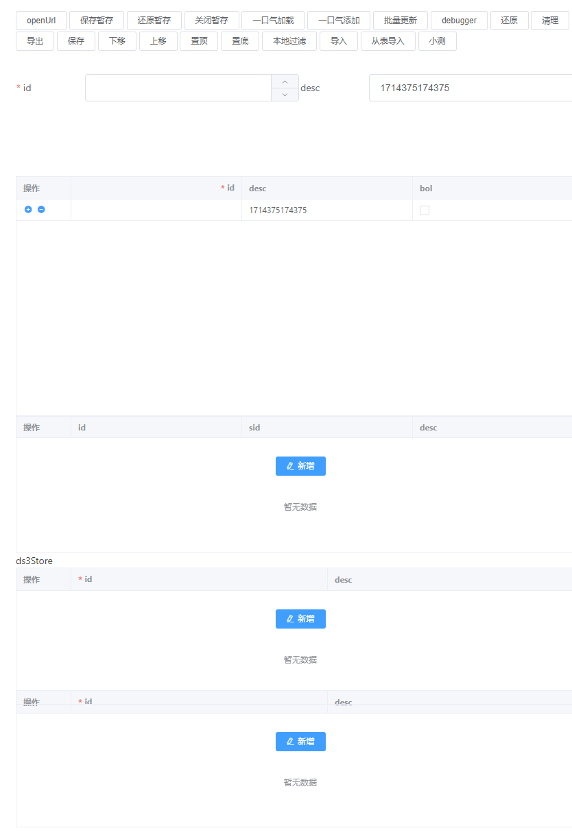 ## DataSet 数据集 数据集类,用于本地数据管理(新增、删除、修改、提交) ### 何时使用 需要客户端管理数据时。 批量提交数据。 ### 初始化 <div class="textDiv"> <p>new DataSetContainer({ request: request, saveUrl: "/data/save", queryUrl: "/data/query", exportUrl:"/export/dataexcelnew", exportParamUrl:"/export/dataexcel/path", datasetUrl: "/data/GetEntityConfig", }); </p> ------------ 创建数据集容器 ------------ 代码示例如下 ```javascript new DataSetContainer({ request: request, saveUrl: "/data/save", queryUrl: "/data/query", exportUrl:"/export/dataexcelnew", exportParamUrl:"/export/dataexcel/path", datasetUrl: "/data/GetEntityConfig", }); ``` </div> ### 代码演示 <div class="textDiv">  ------------ 数据维护: 新增、删除、修改 ------------ 代码示例如下 ```html <template> <div v-if="ds1Store "> <hi-toolbar :source="ds1Store" ref="dbtoolbar"></hi-toolbar> <div class="toolbar"> <ul> <li> <el-button size="mini" @click="openUrl">openUrl</el-button> </li> <li> <el-button size="mini" @click="saveTemporary">保存暂存</el-button> </li> <li> <el-button size="mini" @click="restoreData">还原暂存</el-button> </li> <li> <el-button size="mini" @click="dispose">关闭暂存</el-button> </li> <li> <el-button size="mini" @click="loadAll">一口气加载</el-button> </li> <li> <el-button size="mini" @click="addAll">一口气添加</el-button> </li> <li> <el-button size="mini" @click="update">批量更新</el-button> </li> <li> <el-button size="mini" @click="bug">debugger</el-button> </li> <li> <el-button size="mini" @click="reset">还原</el-button> </li> <li> <el-button size="mini" @click="clearup">清理</el-button> </li> <li> <el-button size="mini" @click="exportData">导出</el-button> </li> <li> <el-button size="mini" @click="save">保存</el-button> </li> <li> <el-button size="mini" @click="moveDown">下移</el-button> </li> <li> <el-button size="mini" @click="moveUp">上移</el-button> </li> <li> <el-button size="mini" @click="moveTop">置顶</el-button> </li> <li> <el-button size="mini" @click="moveBottom">置底</el-button> </li> <li> <el-button size="mini" @click="localQuery">本地过滤</el-button> </li> <li> <el-button size="mini" @click="importData">导入</el-button> </li> <li> <el-button size="mini" @click="importSubData">从表导入</el-button> </li> <li> <el-button size="mini" @click="test1">小测</el-button> </li> </ul> </div> <br /><br /><br /> <div style="height:150px"> <hi-form :dataSource="ds1Store" ref="form" :model="ds1Store.curRecord" :items="formItems" :columnsTotal="2" labelPosition="left" labelWidth="100px" ></hi-form> </div> <div style="height:350px"> <hi-table v-if="ds1Store" :data-source="ds1Store" :model="ds1Store.data" v-bind="table1Cfg" size="mini" isEdit isFill></hi-table> </div> <div style="height:200px"> <hi-table v-if="ds2Store" :data-source="ds2Store" :model="ds2Store.data" v-bind="table2Cfg" size="mini" isEdit isFill></hi-table> </div> <div style="height:200px"> ds3Store <hi-table v-if="ds3Store" :data-source="ds3Store" :model="ds3Store.data" v-bind="table3Cfg" size="mini" isEdit isFill></hi-table> </div> <div style="height:200px"> <hi-table v-if="ds4Store" :data-source="ds4Store" :model="ds4Store.data" v-bind="table4Cfg" size="mini" isEdit isFill></hi-table> </div> </div> </template> <script> export default { data() { return { formItems: [ { name: "id", }, { name: "desc", }], table1Cfg:{ columns: [{ name: "id", }, { name: "desc", }, { name: "bol", element: "el-checkbox", }], }, table2Cfg: { columns: [{ name: "id", } ,{ name: "sid", },{ name: "desc", } ], }, table3Cfg: { columns: [{ name: "id", } ,{ name: "desc", } ], }, table4Cfg: { columns: [{ name: "id", } ,{ name: "desc", } ], }, dsContainer: null, //部门数据集实例 ds1Store: null, //部门数据集配置 ds1Cfg: { //autoTemporary:true, //temporaryTime:5000, saveNewTemporary:false, //字段元素 "element": {"eleInputOrder":{"field":"desc"}}, modelFile: "ds1.xml", //数据集配置 部门 id:"id1", entityid: "ds1", //自动消除空格 autoTrim:true, //主键 primary: ["id"], //操作权限 operations: ["oinsert", "odelete", "oquery", "omodify"], //字段顺序,自动填充的顺充 sortFields: ["id", "desc"], action:"autoAction", defaultCdions:{ "queryCdions": { "join": "and", "items": [ { "join": "and", "items": [ { "sign": "eq", "name": "userid_PK", "tablefilter": false, "ignoreNull": true, "dataType": "dbString", "value": null }, { "join": "and", "items": [ { "sign": "eq", "name": "Telephone_PK", "tablefilter": false, "ignoreNull": false, "dataType": "dbString", "value": 1 } ] } ] } ] } }, // dynamic:{ // data:[{ // id1:"FID", // id2:"唯一" // },{ // id1:"FNAME", // id2:"名称" // }], // modelFile:"dynamic.xml", // nameField:"id1", // labelField:"id2" // }, fields: { id: { name: "id", //字段ID label: "id", //字段描述 length:2, "dbtype": "dbDouble", required: true, rules: [], "validateList": [ // { // "expr": function (value, dataset, data, options) { // //返回false时验证不通过 // //参数==>值:value,数据集:dataset,数据:data,扩展参数:options // if (value<10) { // throw new Error("必须大于10"); // } // }, // }, ], }, desc: { name: "desc", //字段ID label: "desc", //字段描述 "default": { "rule": "", "execPolicy":"emptyExec", "exps": function (data, model, dataset) { return (new Date()).valueOf(); } }, length: 10, }, bol:{ name: "bol", //字段ID label: "bol", //字段描述 dbtype:"dbBoolean" } }, }, //部门数据集实例 ds2Store: null, //人员数据集配置 ds2Cfg: { modelFile: "ds2.xml", relation: { type:"ONE_MANY", selfField: ["id"], parentField: ["id"] }, //数据集配置 部门 id:"id2", entityid: "ds2", //主键 primary: ["sid"], //操作权限 operation: ["insert", "delete", "query", "modify"], fields: { id: { name: "id", //字段ID label: "id", //字段描述 dbtype: "dbString", //数据类型 }, sid: { name: "sid", //字段ID label: "sid", //字段描述 dbtype: "dbString",