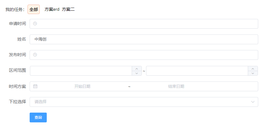 ## Vquery 纵向查询面板 由输入框、时间组件、选择器、单选框等控件组成,用以收集用户条件、校验条件、查询数据结果。 ### 应用背景 纵向查询面板适用于一般PC页面查询。 ### 代码演示 <div class="textDiv">  ------------ 查询面板 ------------ 代码示例如下 ```html <template> <div style="height:400px;"> <HiVquery :isShowScheme="isShowScheme" :sysScheme="sysSchemeData" :size="size" :rules="rules" :fields="fields" @beforequery="beforequery" @afterquery="afterquery"></HiVquery> <div v-html="fields.FName"></div> <div v-text="fields.field11"></div> </div> </template> <script> export default { data() { return { size: "small", rules: { FName: [{ required: true, message: "不能为空", trigger: "blur" }] }, sysSchemeData: { name: "我的任务", isShowAll: true, selectedKey: "", children: [{ key: "item0", desc: "方案erd" }, { key: "item1", desc: "方案二" } ] }, isShowScheme: true, hideQueryBtn:true, fields: [{ name: "field2", props: { type: "datetime" }, element: "el-date-picker", label: "申请时间" }, { name: "FName", element: "el-input", props: { placeholder: "姓名" }, label: "姓名", value: "中海创" }, { name: "field4", element: "el-time-select", label: "发布时间" }, { name: "field11", element: "HiNumberRange", label: "区间范围" }, { name: "field13", element: "hi-time-scheme", label: "时间方案" }, { name: "field8", element: "el-select", label: "下拉选择", props: { multiple: true, placeholder: "请选择" }, children: [{ element: "el-option", props: { label: "特假", value: "选项1" } }, { element: "el-option", props: { label: "事假", value: "选项2" } }, { element: "el-option", props: { value: "选项3", label: "病假" } } ] } ] }; }, methods: { beforequery(obj, param) { console.log("查询前"); }, afterquery(obj, param) { console.log("查询后"); } } }; </script> ``` </div> ### Attributes | 参数 | 说明 | 类型 | 可选值 | 默认值 | |--------------|---------------|---------|-----------------------|-------| | btnName | 查询按钮名称 | String | — | 查询 | | fields | 查询字段配置项 | Array | — | | | size | 用于控制该表单内组件的尺寸 | string | medium / small / mini | | | target | 查询目标 | Object | — | | | cancel | 是否取消查询 | Boolean | — | false | | isShowScheme | 是否显示方案 | Boolean | — | false | ### Events | 事件名称 | 说明 | 回调参数 | |-------------|-----|-------------| | beforequery | 查询前 | param(查询参数) | | afterquery | 查询后 | param(查询参数) | <style> .textDiv{ border:1px solid #F5F5F5; padding: 20px 35px; border-radius: 4px; } .textDiv:hover{ border-color:#1890ff; } </style>