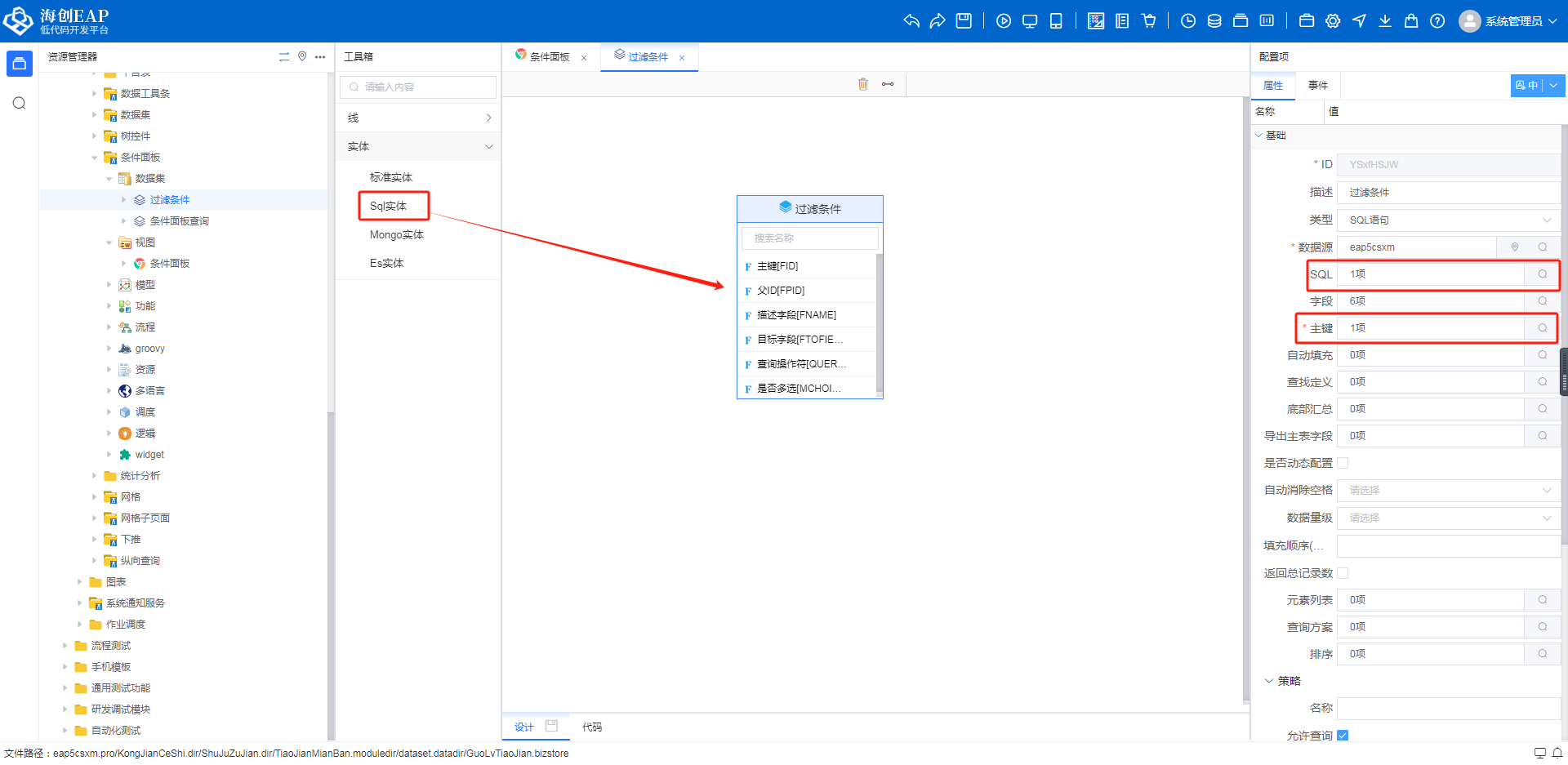 ## 条件面板 ### 1、创建面板SQL实体  SQL语句示例 ```sql //语句说明:FPID=-1的数据节点为根节点,即条件面板中的分类;各字段与条件面板中配置一一对应 SELECT 'a7f04158-dd24-11ee-96c1-00505687dd32' AS FID,'-1' AS FPID,'合同类型' AS FNAME,'合同类型' AS FDESC,'FTYPE' AS FTOFIELD,'eq' AS QUERYOPERATION,0 AS MCHOICE UNION ALL SELECT '0f10839e-dd25-11ee-96c1-00505687dd32' AS FID,'a7f04158-dd24-11ee-96c1-00505687dd32' AS FPID,'工程合同' AS FNAME,'工程合同' AS FDESC,'FTYPE' AS FTOFIELD,'eq' AS QUERYOPERATION,0 AS MCHOICE UNION ALL SELECT '43b2a088-dd25-11ee-96c1-00505687dd32' AS FID,'a7f04158-dd24-11ee-96c1-00505687dd32' AS FPID,'采购合同' AS FNAME,'采购合同' AS FDESC,'FTYPE' AS FTOFIELD,'eq' AS QUERYOPERATION,0 AS MCHOICE UNION ALL SELECT '9c29d5ef-dd25-11ee-96c1-00505687dd32' AS FID,'-1' AS FPID,'付款方式' AS FNAME,'付款方式' AS FDESC,'FPAYTYPE' AS FTOFIELD,'eq' AS QUERYOPERATION,1 AS MCHOICE UNION ALL SELECT 'b13f8015-dd25-11ee-96c1-00505687dd32' AS FID,'9c29d5ef-dd25-11ee-96c1-00505687dd32' AS FPID,'货到付款' AS FNAME,'货到付款' AS FDESC,'FPAYTYPE' AS FTOFIELD,'eq' AS QUERYOPERATION,1 AS MCHOICE UNION ALL SELECT 'd33fea69-dd25-11ee-96c1-00505687dd32' AS FID,'9c29d5ef-dd25-11ee-96c1-00505687dd32' AS FPID,'分批付款' AS FNAME,'分批付款' AS FDESC,'FPAYTYPE' AS FTOFIELD,'eq' AS QUERYOPERATION,1 AS MCHOICE UNION ALL SELECT 'dedcc644-dd25-11ee-96c1-00505687dd32' AS FID,'9c29d5ef-dd25-11ee-96c1-00505687dd32' AS FPID,'付全款' AS FNAME,'付全款' AS FDESC,'FPAYTYPE' AS FTOFIELD,'eq' AS QUERYOPERATION,1 AS MCHOICE ``` ### 2、条件面板配置  条件面板属性说明 1)根节点:默认即可 2)数据集:选择面板SQL数据集 3)父ID字段:绑定实体中的父ID(示例中为FPID字段) 4)ID字段:绑定实体中的ID字段(示例中为FID字段) 5)值字段:用于过滤的字段值(示例中为FNAME字段) 6)目标字段:目标数据集需过滤的字段ID(示例中为FTOFIELD字段) 7)描述字段:条件面板中展示的过滤值(示例中为FDESC字段) 8)是否多选字段:条件面板中同个类别数据是否能同时选中多个作为过滤条件,同类别多选过滤方式为or,值可以为0、1或true、false;值为0或false时,不可多选,为1或true时,可以多选(示例中为MCHOICE字段) 9)操作符字段:即查询操作符,如:eq,like等(参照实体中的查询操作符,示例中为QUERYOPERATION字段) 10)目标数据集:绑定需查询的目标数据 ### 3、效果展示