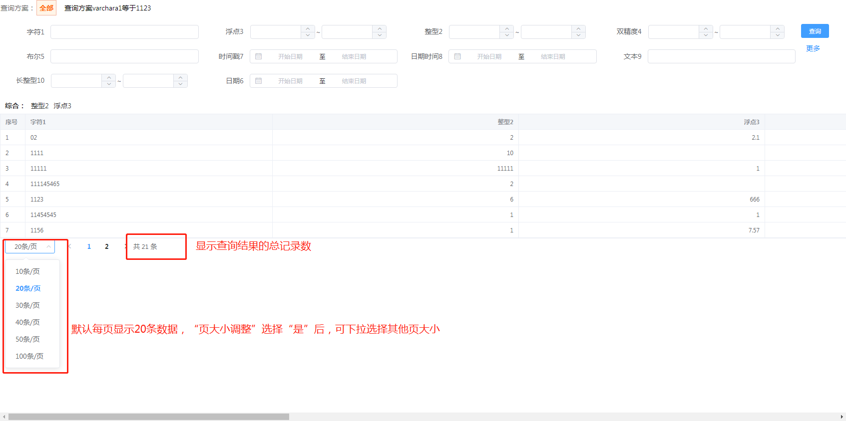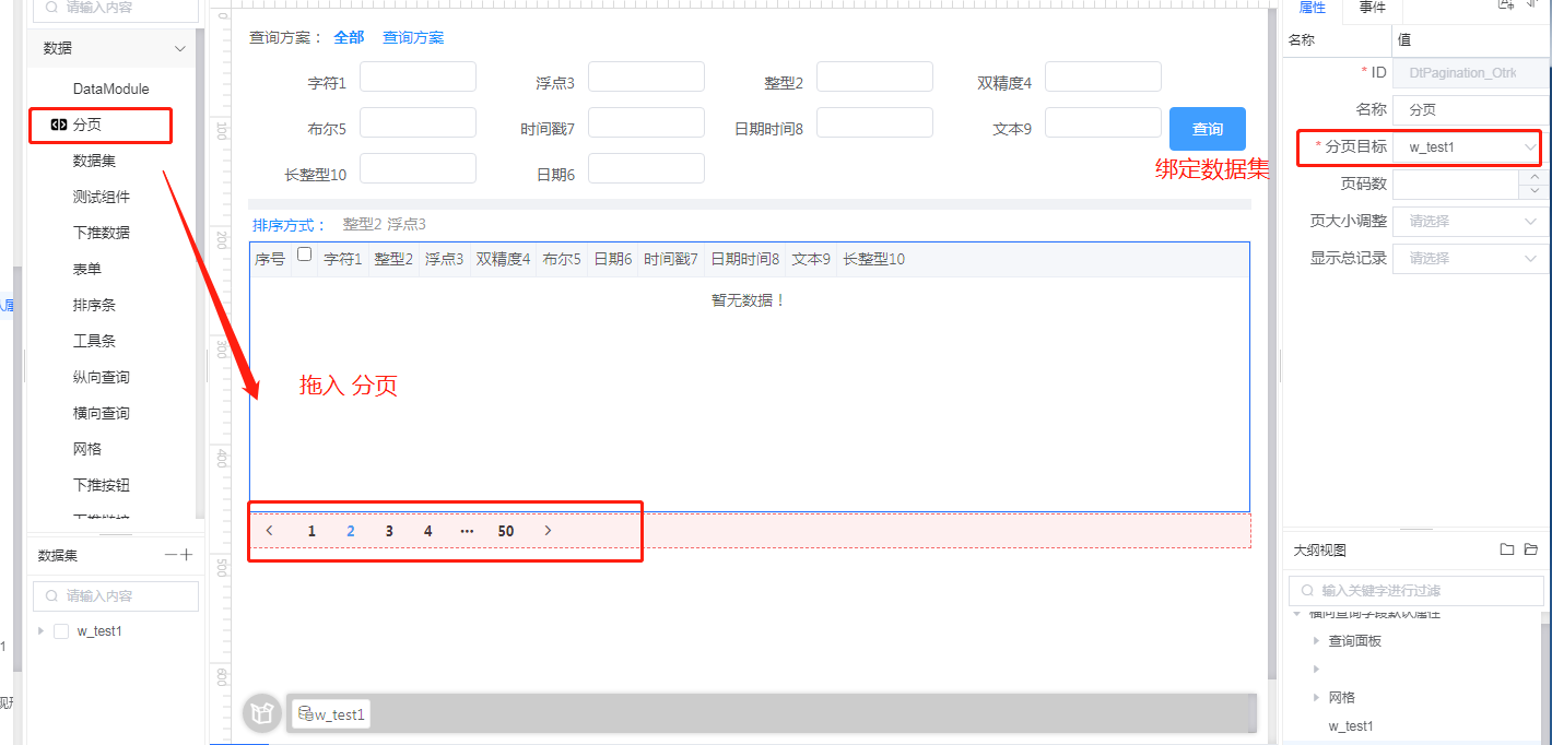 ## 分页 ### 添加分页  ### 分页属性配置 - 分页目标:绑定网格中需查询的数据集 - 页码数: - 页大小调整:默认不可调整,每页显示20条数据,选择“是”后,可以下拉选择调整每页显示的数据的数量 - 显示总记录:默认不显示,与数据集“返回记录数”配合使用,数据集“返回记录数”勾选后,分页“显示总记录”选择“是”,可显示查询结果总数据量