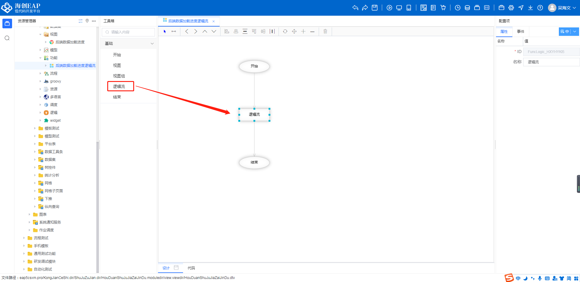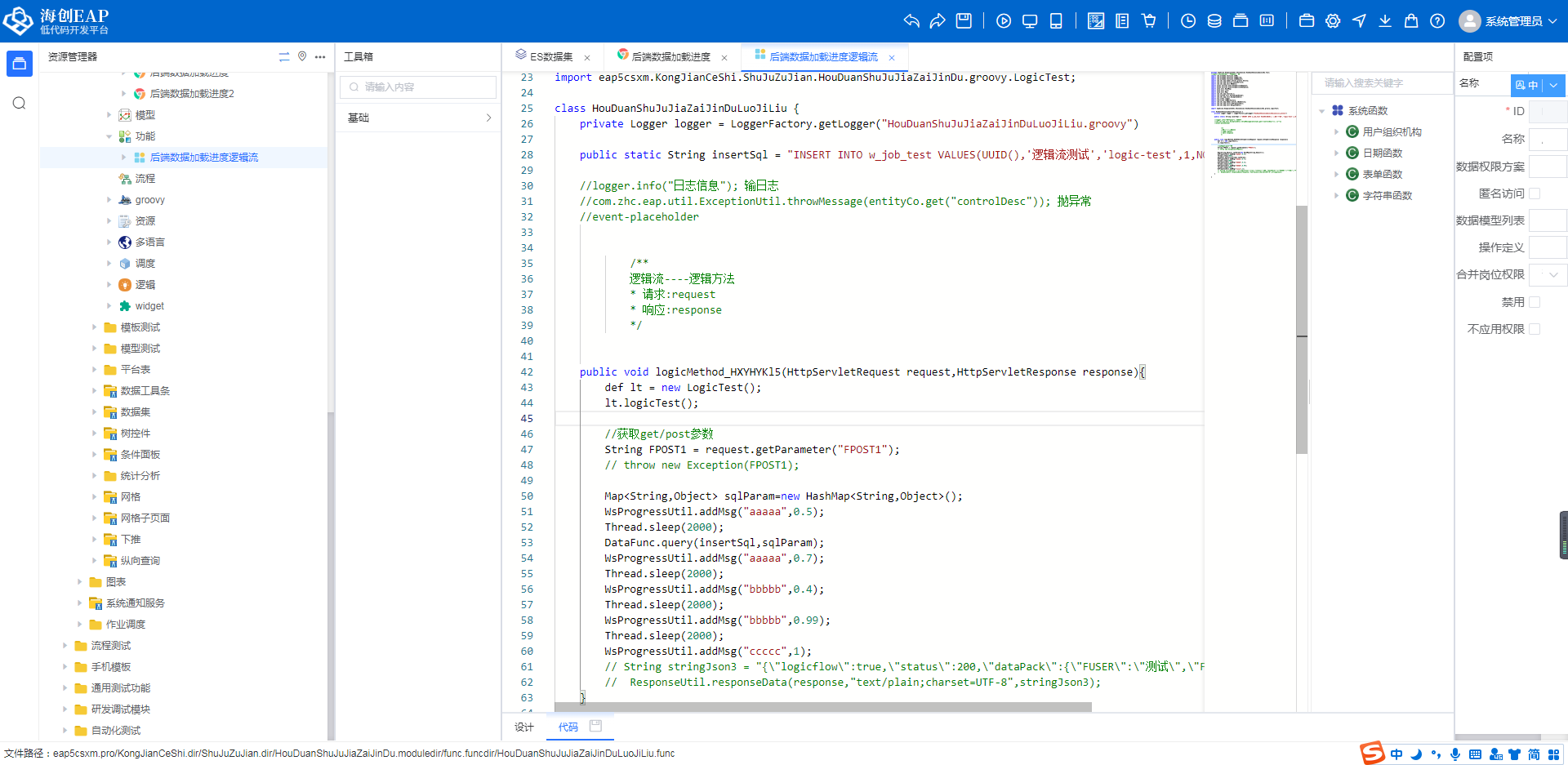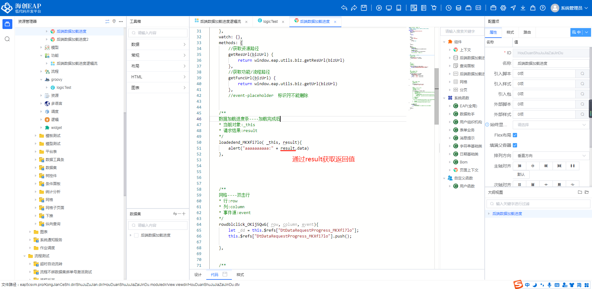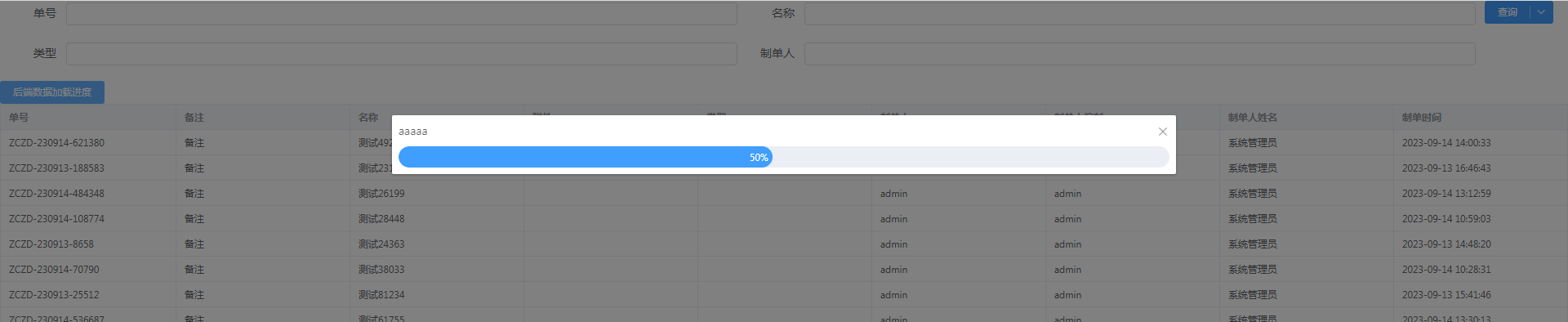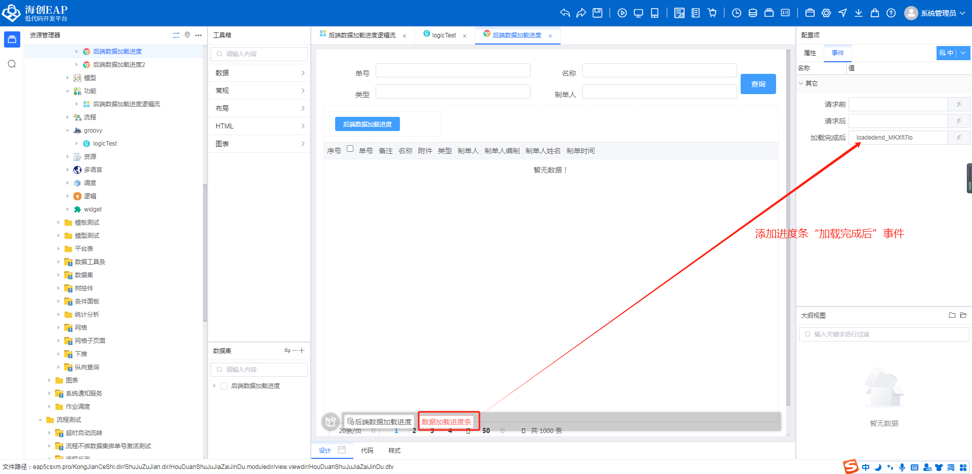 ## 后端数据加载进度条 ### 1、逻辑流配置 #### 1.1 添加逻辑流  #### 1.2 配置逻辑流事件 ```javascript import com.zhc.eap.utils.WsProgressUtil; //获取get/post参数(注:源自 2.2下推参数配置) //String FPOST1 = request.getParameter("FPOST1"); //第一个参数为进度条标题,第二个参数为进度(小数表示,1为100%) WsProgressUtil.addMsg("aaaaa",1); //前端需获取返回值时,使用该方式(注:配合2.4使用) //JSONObject resJson = new JSONObject(); //resJson.put("data","test") //ResponseUtil.responseData(response,resJson.toJSONString()); //第一个参数为HttpServletRequest,第二个参数为JSONObject,第三个参数为进度条标题,第四个参数为进度 //WsProgressUtil.addMsg(request,resJson,"aaaaa",1); ```  ### 2、表单界面配置 #### 2.1 添加后端进度数据加载进度条组件  #### 2.2 下推参数配置 - 参数名:即参数KEY值 - 传输方式:post/get根据实际需求选取,get请求时,参数为地址栏参数;post请求时,参数为表单方式传输 - 值:即参数value值 注:多个参数时,添加多个参数即可,post/get配置方式一致,均需挨个添加参数  #### 2.3 进度条组件引用 - 方法1:按钮引用  - 方法2:事件引用 ```javascript //脚本中参数为:后端数据加载进度条 组件ID //let _dd = this.$refs["DtDataRequestProgress_MKXfi7lo"]; this.$refs["DtDataRequestProgress_MKXfi7lo"].push(); ```  #### 2.4 前端返回值处理   ### 3、效果展示