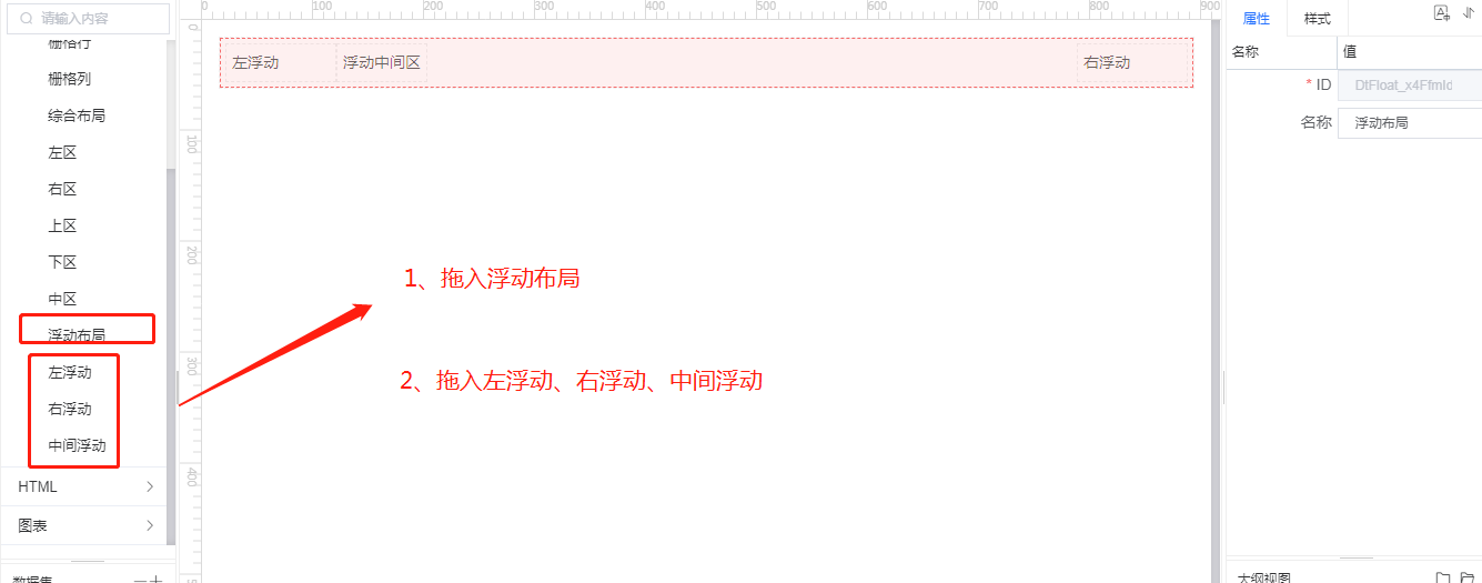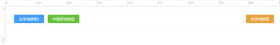## 浮动布局 ### 1、添加浮动布局、坐浮动、右浮动、中间浮动  ### 2、拖入控件 可根据需要往各个区域拖入控件,以拖入“按钮”为例,控件可以区域内浮动伸缩  ### 3、效果展示