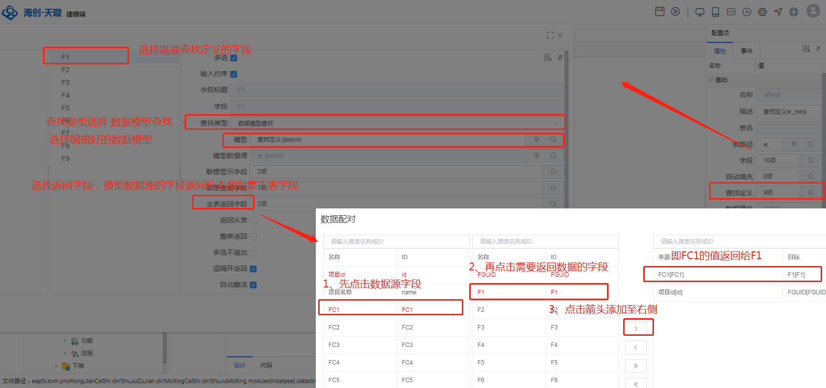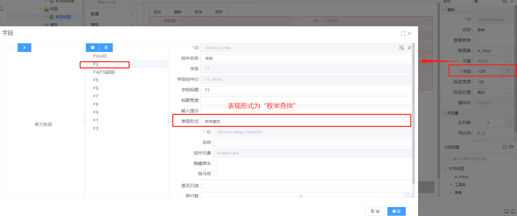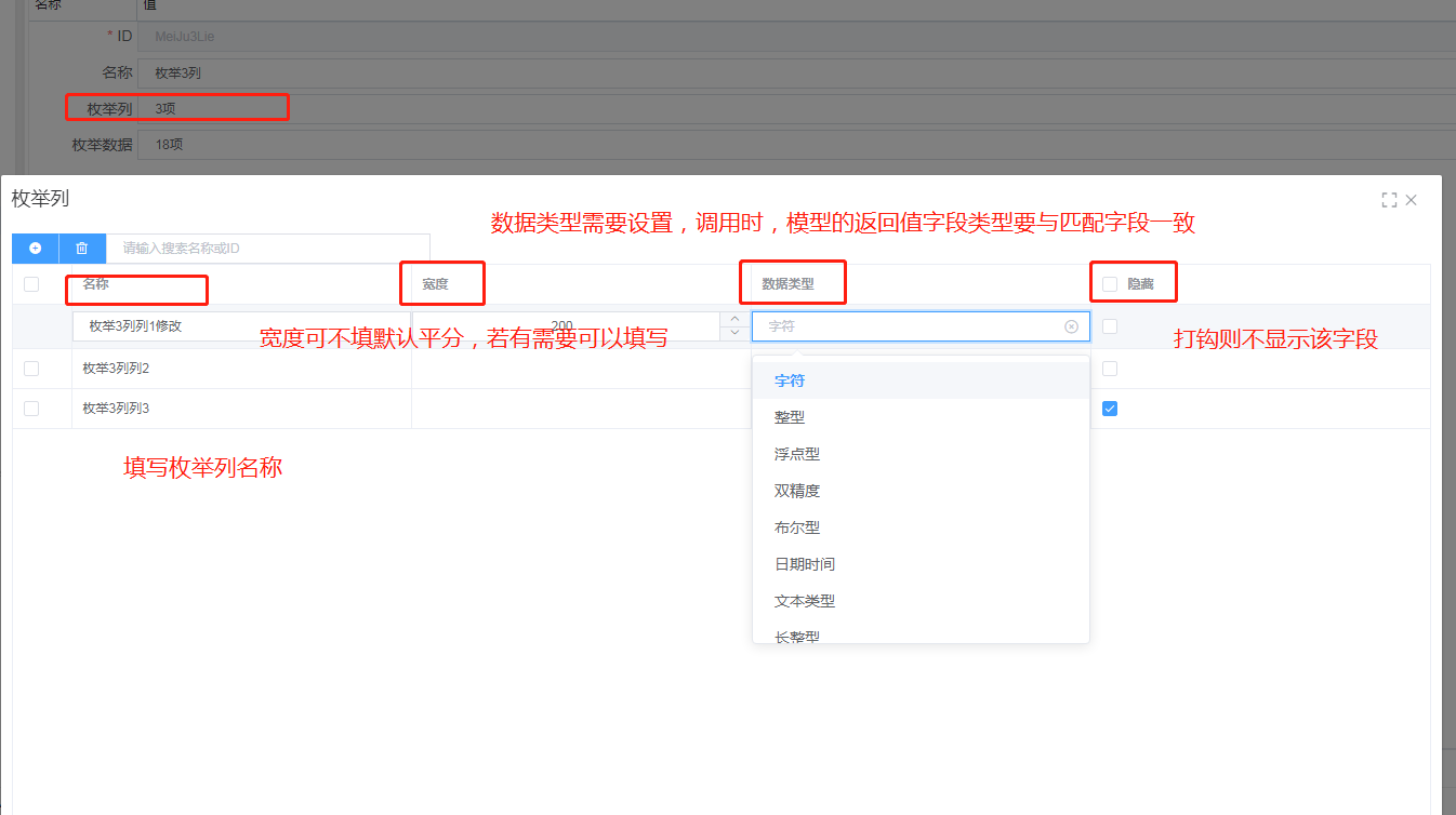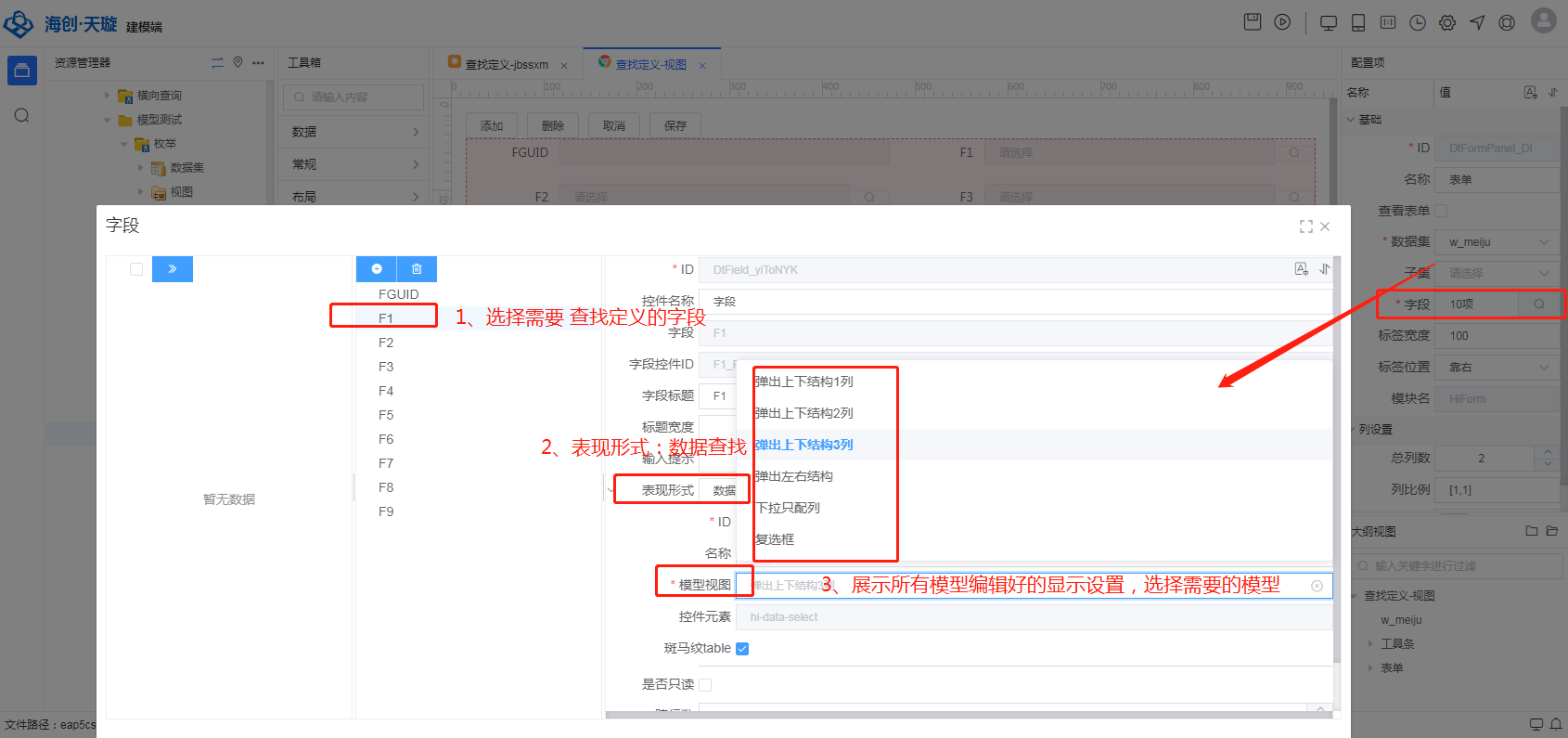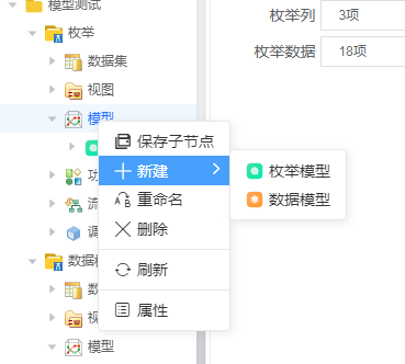 ## 模型 ### 一、添加模型 模型的类型有数据模型与枚举模型,其他地方如调单、字段查找定义等可调用模型,模型查找表现形式有:弹出、下拉、复选框,枚举查找为下拉模式  ### 二、枚举模型 - 1、新增一个枚举模型  - 2、配置枚举列  - 3、填写各枚举列数据  - 4、引用枚举模型(以在数据集字段引用为例) - 数据集字段选择模型配置返回字段和显示字段 - 返回字段:返回给目标字段,该字段值是实际存入数据库的值 - 显示字段:返回给目标字段显示在输入文本框里的  在视图应用  展示效果  ### 三、数据模型 - 1、配置数据模型的数据来源的数据集  - 2、再配置模型  - 3、引用数据模型(以在数据集字段引用为例) - 数据集需要查找定义的字段配置查找定义  - 最后在视图应用  - 展示效果: 弹出效果  下拉效果  - 下拉效果需要勾选“自动激活”  复选框效果