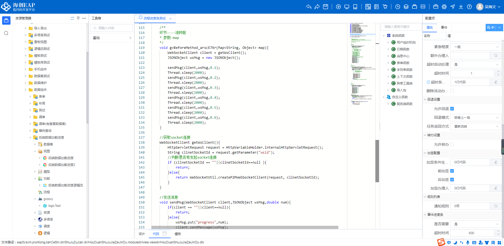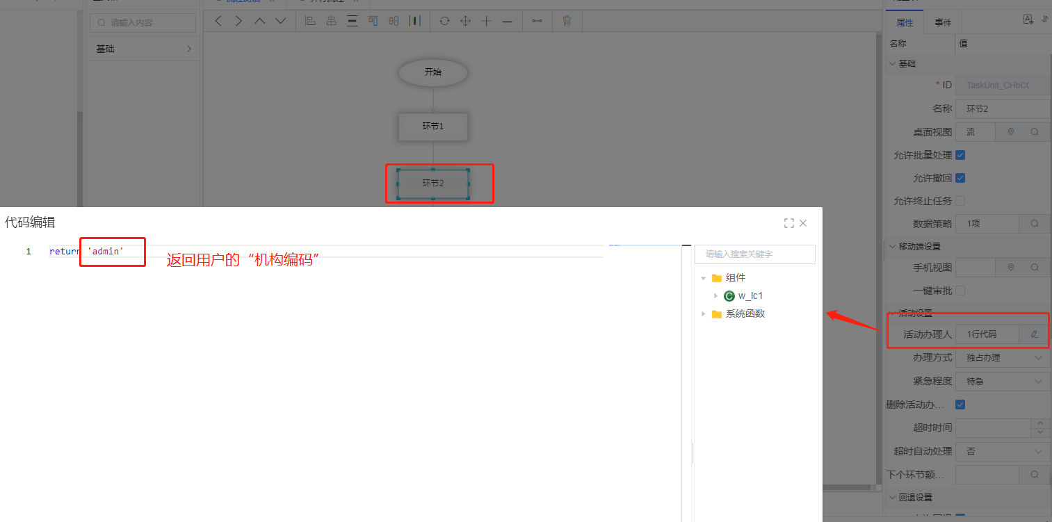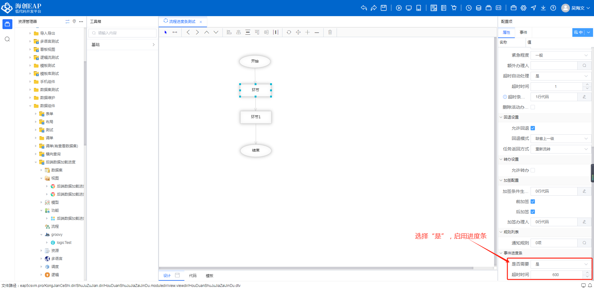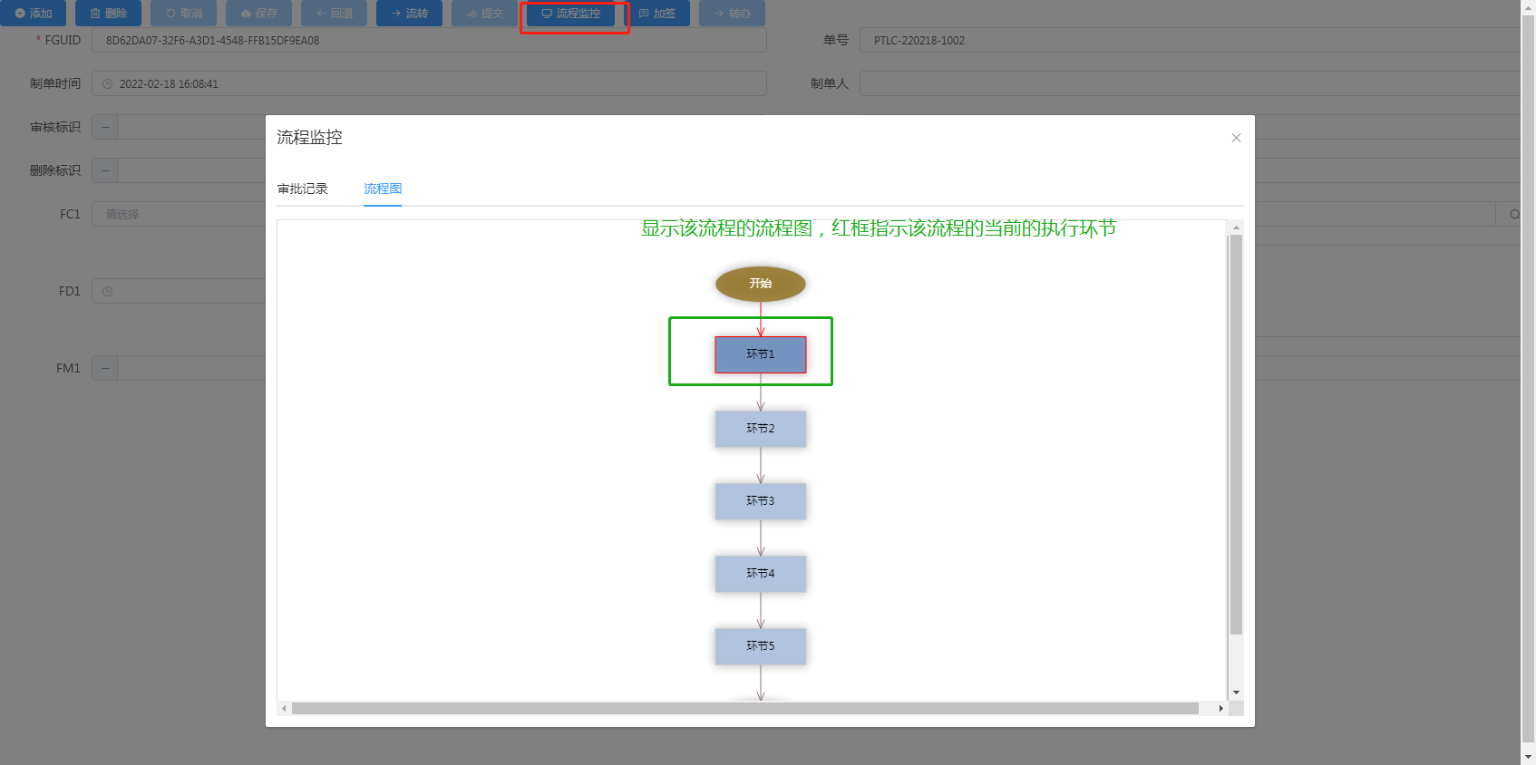 ## 流程 ### 一、绘制流程  ### 二、基础属性 #### 1、名称 默认“环节”,修改后配置端前端均按修改后名称显示 #### 2、桌面视图单号激活  #### 3、绑定桌面视图  - 桌面视图的工具条需要添加“流转”或者“提交”按钮以及“流程监控”,其他按钮视情况而加 - 流转:点击“保存”后,“流转”按钮方可点击,点击“流转”弹出流转确认框,点击弹框“确定”框后,流转当前环节 - 提交:“提交”=“保存”+“流转”,点击“提交”直接保存并流转当前环节 - 流程监控:显示流程的审批记录和流程图   #### 4、允许批量处理 勾选“允许批量处理”,当前环节的处理人打开任务中心“未处理”,当前环节任务会出现复选框,可以勾选批处理    #### 5、允许撤回 默认勾选“允许撤回”。勾选后,流程流转至下一环节后,在任务中心“已处理”可以撤回该任务,回到“未处理”任务待重新处理。 - 撤回任务的前提是下一环节的执行者没有打开单据    ### 三、活动设置 #### 1、活动办理人 活动办理人即当前环节的执行者,需返回用户的机构编码。首环节的活动办理人为当前制单人无需配置  常用活动办理人配置: - 固定人员:return '编制A,编制B' - 取业务表字段:return record.get('字段ID')  - 取直属上级:return OrgFunc.bzSuperId()  - 取岗位人员:OrgFunc.getBzByRole('岗位ID') 注:SaaS版该函数仅取当前公司对应岗位人员  #### 2、办理方式 办理方式,有独占办理、并行办理、顺序办理,默认独占办理。 - 独占办理:只能有一个人审批,默认率先处理,即若多人审批,谁先处理流转完单据,流程流转至下一环节,其他人就无法流转 - 顺序办理:多人审批,按照一定顺序来处理此任务,顺序是由执行者表达式里返回的顺序或者在流转对话框中选择执行者的顺序来确定的,执行者按照先后顺序收到单据,只有前一个处理完后下一个才能收到单据,直到字后一个处理完流程才流转至下一环节 - 并行办理:多人审批,需实际人数(环节办理人数x比重)都流转完单据,比重默认100%,即全部人都要处理,若环节办理人数x比重存在小数,人数向上取整  #### 3、紧急程度 紧急程度,有一般、加急、紧急、特急,默认一般。用于任务中心展示该流转当前环节的紧急程度。如下图当环节紧急程度为“加急”时,当前环节办理人任务中心收到该条任务时,“任务名称”前会有橙色的“急”字,“紧急”为深橙色的“急”字,“特急”为大红色的“急”字,“一般”不显示“急”字。  #### 4、删除活动办理人 勾选后,“流转”弹框的执行者可选择性删除  #### 5、超时自动处理  “超时自动”默认“否”,选择“是”,填写“超时时间”(单位:分钟),超过“超时时间”设置的时间后,当前环节的任务自动流转。 “超时条件生效表达式”:若需要根据条件产生,可以在这里配置条件表达式(该表达式只能返回布尔值:true or false),默认为“true”。即满足表达式条件的情况下超出时间方可自动处理。 #### 6、下个环节额外办理人 ### 四、回退设置  (1)回退模式 - 缺省上一级:回退到上一环节 - 经过的任意一级:前端会显示经过当前环节之前的所有环节,由当前活动办理人选择要回退到哪一环节 - 经过指定环节:要选择“回退指定环节”,“指定环节”会列举经过当前环节之前的所有环节,支持单选、多选 - 首环节:回退至流程的首环节 (2)返回方式 - 重新流转:单据重新流转 - 原路返回:单据原路返回到回退时的环节 - 原路返回或重新流转:前台选择重新流转或原路返回 ### 五、转办设置 当前环节执行者将任务转移给其他人处理(非流转至下一环节)即为转办。转办非流转,转办虽然也把任务流给了其他执行者,但是活动环节仍为当前环节 - 数据工具条需添加“转办”按钮 ### 六、加签设置  - 环节任务执行者在任务处理前或任务处理后,添加本环节额外任务执行者即为加签,加签任务可分为:前加签和后加签。数据工具条需添加“加签”按钮 - 加签:办理人只能做加签处理填写意见,不能处理单据 - 前加签:加签处理后返回加签者处 - 后加签:加签处理后不返回加签者处 ### 七、事件进度条  是否需要:选择“是”时启用进度条 超时时间:超过设定时间后,抛异常;单位“秒”,为“0”时默认30S - groov脚本示例: ```groovy import com.zhc.eap.util.HttpVariableHolder import com.zhc.eap.utils.WebSocketUtil import com.zhc.eap.websocket.WebSocketClient //实际业务逻辑方法 void gvBeforeMethod_arscE76r(Map<String, Object> map){ WebSocketClient client = getWsClient(); JSONObject wsMsg = new JSONObject(); sendMsg(client,wsMsg,0.1); Thread.sleep(2000); sendMsg(client,wsMsg,0.2); Thread.sleep(2000); sendMsg(client,wsMsg,0.3); Thread.sleep(2000); sendMsg(client,wsMsg,0.4); Thread.sleep(2000); sendMsg(client,wsMsg,0.5); Thread.sleep(2000); sendMsg(client,wsMsg,0.6); Thread.sleep(2000); } //获取socket连接 WebSocketClient getWsClient(){ HttpServletRequest request = HttpVariableHolder.internalHttpServletRequest(); String clinetSocketId = request.getParameter("wsid"); //判断是否有发起socket连接 if (clinetSocketId == ""||clinetSocketId==null ){ return; }else{ return WebSocketUtil.createP2PWebSocketClient(request, clinetSocketId); } } //发送消息 void sendMsg(WebSocketClient client,JSONObject wsMsg,double num){ if(client == ""||client==null){ return; }else{ wsMsg.put("progress",num); client.sendMessage(wsMsg); } } ```  - 效果展示