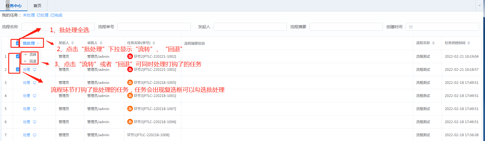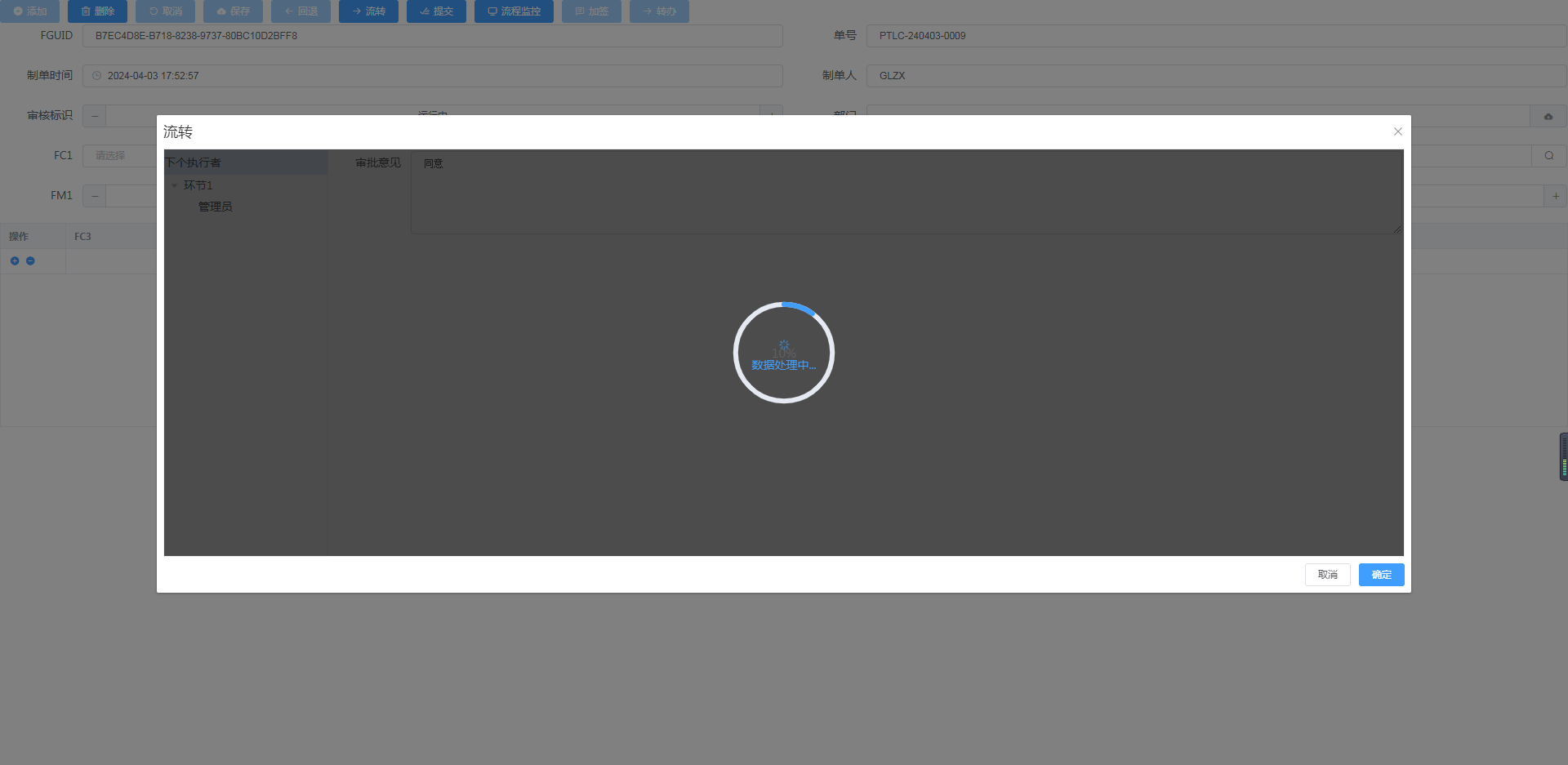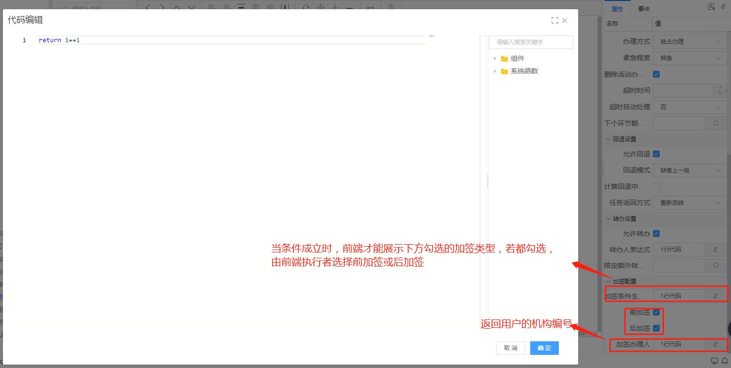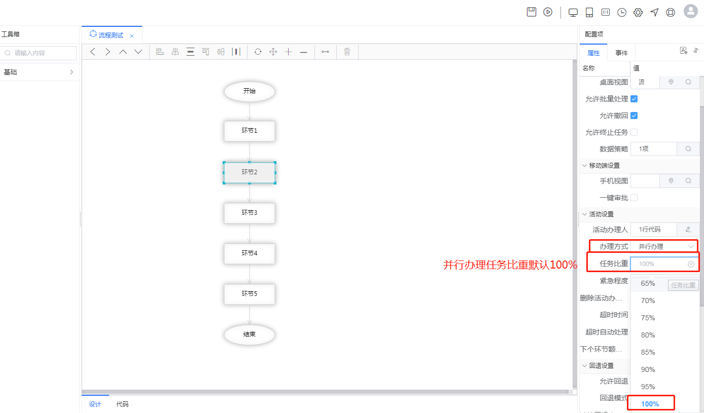 ## 流程 ### 一、绘制流程  ### 二、基础属性 #### 1、名称 默认“环节”,修改后配置端前端均按修改后名称显示 #### 2、桌面视图单号激活  #### 3、绑定桌面视图  - 桌面视图的工具条需要添加“流转”或者“提交”按钮以及“流程监控”,其他按钮视情况而加 - 流转:点击“保存”后,“流转”按钮方可点击,点击“流转”弹出流转确认框,点击弹框“确定”框后,流转当前环节 - 提交:“提交”=“保存”+“流转”,点击“提交”直接保存并流转当前环节 - 流程监控:显示流程的审批记录和流程图   #### 4、允许批量处理 勾选“允许批量处理”,当前环节的处理人打开任务中心“未处理”,当前环节任务会出现复选框,可以勾选批处理    #### 5、允许撤回 默认勾选“允许撤回”。勾选后,流程流转至下一环节后,在任务中心“已处理”可以撤回该任务,回到“未处理”任务待重新处理。 - 撤回任务的前提是下一环节的执行者没有打开单据    ### 三、活动设置 #### 1、活动办理人 活动办理人即当前环节的执行者,需返回用户的机构编码。首环节的活动办理人为当前制单人无需配置  常用活动办理人配置: - 固定人员:return '编制A,编制B' - 取业务表字段:return record.get('字段ID')  - 取直属上级:return OrgFunc.bzSuperId()  - 取岗位人员:OrgFunc.getBzByRole('岗位ID') 注:SaaS版该函数仅取当前公司对应岗位人员  #### 2、办理方式 办理方式,有独占办理、并行办理、顺序办理,默认独占办理。 - 独占办理:只能有一个人审批,默认率先处理,即若多人审批,谁先处理流转完单据,流程流转至下一环节,其他人就无法流转 - 顺序办理:多人审批,按照一定顺序来处理此任务,顺序是由执行者表达式里返回的顺序或者在流转对话框中选择执行者的顺序来确定的,执行者按照先后顺序收到单据,只有前一个处理完后下一个才能收到单据,直到字后一个处理完流程才流转至下一环节 - 并行办理:多人审批,需实际人数(环节办理人数x比重)都流转完单据,比重默认100%,即全部人都要处理,若环节办理人数x比重存在小数,人数向上取整  #### 3、紧急程度 紧急程度,有一般、加急、紧急、特急,默认一般。用于任务中心展示该流转当前环节的紧急程度。如下图当环节紧急程度为“加急”时,当前环节办理人任务中心收到该条任务时,“任务名称”前会有橙色的“急”字,“紧急”为深橙色的“急”字,“特急”为大红色的“急”字,“一般”不显示“急”字。  #### 4、删除活动办理人 勾选后,“流转”弹框的执行者可选择性删除  #### 5、超时自动处理  “超时自动”默认“否”,选择“是”,填写“超时时间”(单位:分钟),超过“超时时间”设置的时间后,当前环节的任务自动流转。 “超时条件生效表达式”:若需要根据条件产生,可以在这里配置条件表达式(该表达式只能返回布尔值:true or false),默认为“true”。即满足表达式条件的情况下超出时间方可自动处理。 #### 6、下个环节额外办理人 ### 四、回退设置  (1)回退模式 - 缺省上一级:回退到上一环节 - 经过的任意一级:前端会显示经过当前环节之前的所有环节,由当前活动办理人选择要回退到哪一环节 - 经过指定环节:要选择“回退指定环节”,“指定环节”会列举经过当前环节之前的所有环节,支持单选、多选 - 首环节:回退至流程的首环节 (2)返回方式 - 重新流转:单据重新流转 - 原路返回:单据原路返回到回退时的环节 - 原路返回或重新流转:前台选择重新流转或原路返回 ### 五、转办设置 当前环节执行者将任务转移给其他人处理(非流转至下一环节)即为转办。转办非流转,转办虽然也把任务流给了其他执行者,但是活动环节仍为当前环节 - 数据工具条需添加“转办”按钮 ### 六、加签设置  - 环节任务执行者在任务处理前或任务处理后,添加本环节额外任务执行者即为加签,加签任务可分为:前加签和后加签。数据工具条需添加“加签”按钮 - 加签:办理人只能做加签处理填写意见,不能处理单据 - 前加签:加签处理后返回加签者处 - 后加签:加签处理后不返回加签者处 ### 七、事件进度条  是否需要:选择“是”时启用进度条 超时时间:超过设定时间后,抛异常;单位“秒”,为“0”时默认30S - groov脚本示例: ```groovy import com.zhc.eap.util.HttpVariableHolder import com.zhc.eap.utils.WebSocketUtil import com.zhc.eap.websocket.WebSocketClient //实际业务逻辑方法 void gvBeforeMethod_arscE76r(Map<String, Object> map){ WebSocketClient client = getWsClient(); JSONObject wsMsg = new JSONObject(); sendMsg(client,wsMsg,0.1); Thread.sleep(2000); sendMsg(client,wsMsg,0.2); Thread.sleep(2000); sendMsg(client,wsMsg,0.3); Thread.sleep(2000); sendMsg(client,wsMsg,0.4); Thread.sleep(2000); sendMsg(client,wsMsg,0.5); Thread.sleep(2000); sendMsg(client,wsMsg,0.6); Thread.sleep(2000); } //获取socket连接 WebSocketClient getWsClient(){ HttpServletRequest request = HttpVariableHolder.internalHttpServletRequest(); String clinetSocketId = request.getParameter("wsid"); //判断是否有发起socket连接 if (clinetSocketId == ""||clinetSocketId==null ){ return; }else{ return WebSocketUtil.createP2PWebSocketClient(request, clinetSocketId); } } //发送消息 void sendMsg(WebSocketClient client,JSONObject wsMsg,double num){ if(client == ""||client==null){ return; }else{ wsMsg.put("progress",num); client.sendMessage(wsMsg); } } ```  - 效果展示