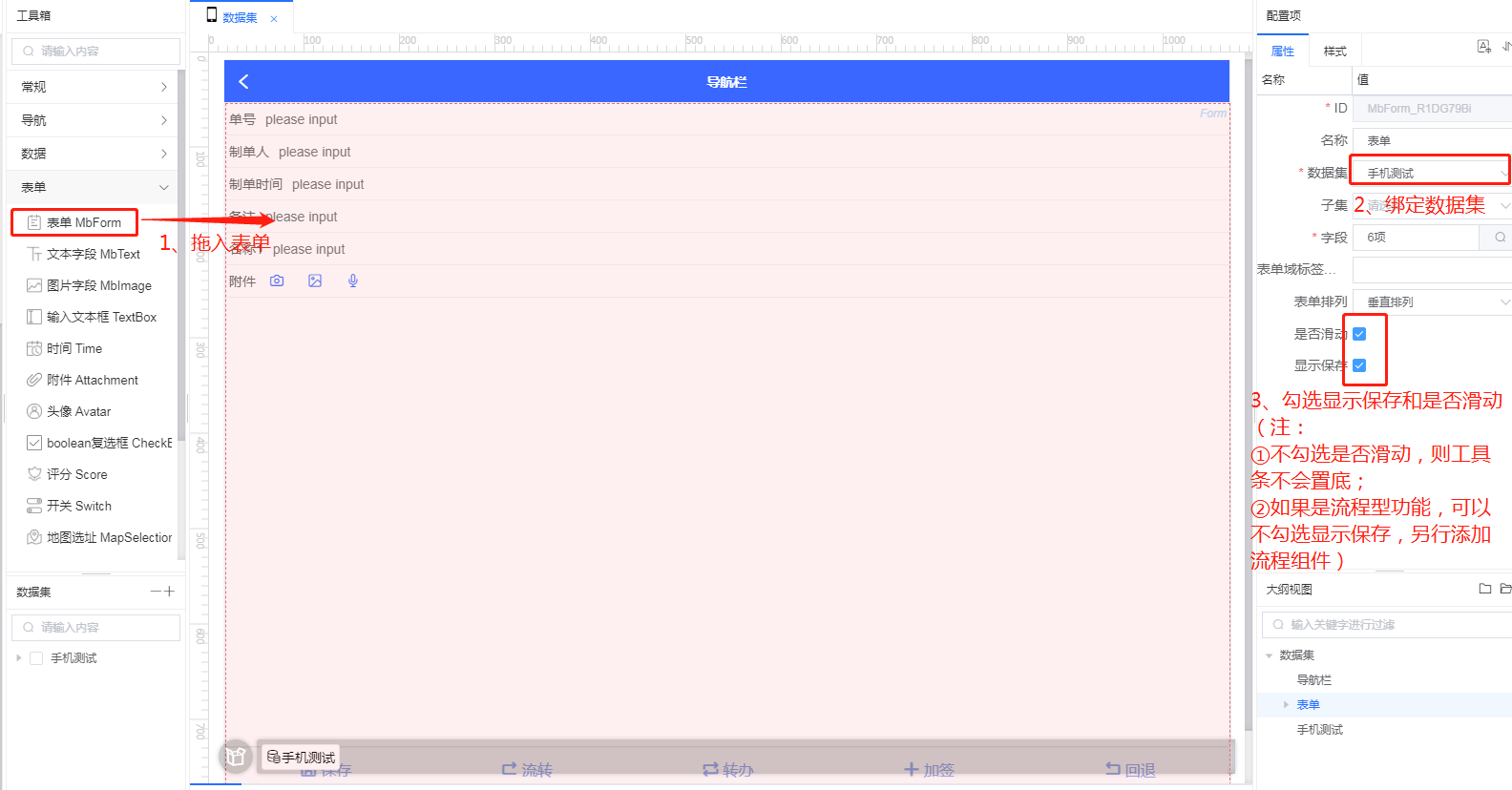 ## 表单 ### 1、添加数据集  ### 2、添加表单  ### 3、添加字段  ### 4、字段配置  ### 5、效果展示