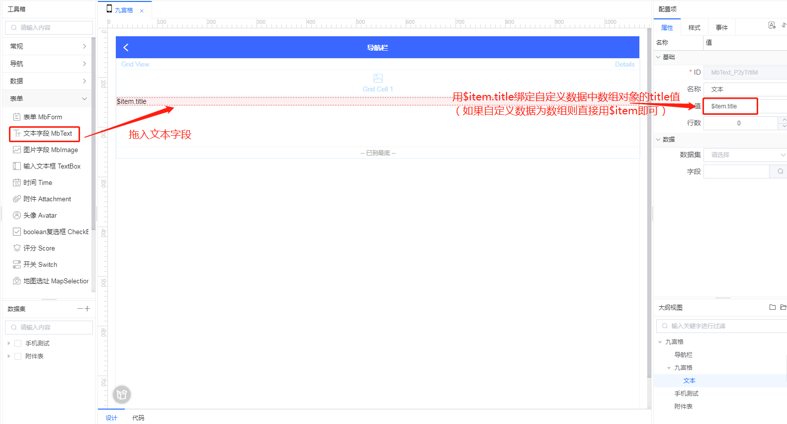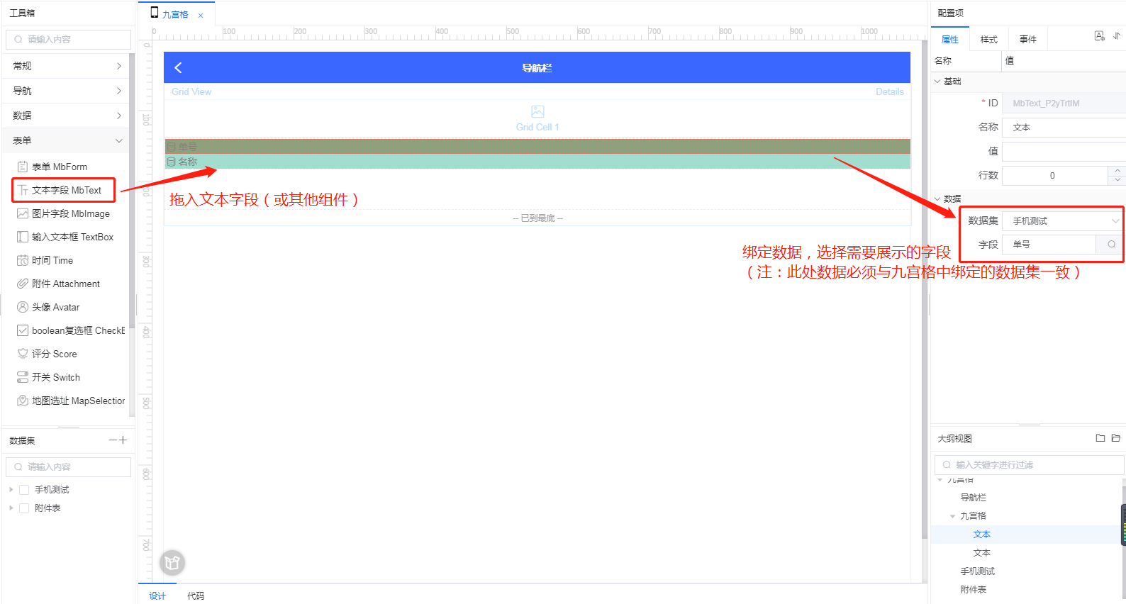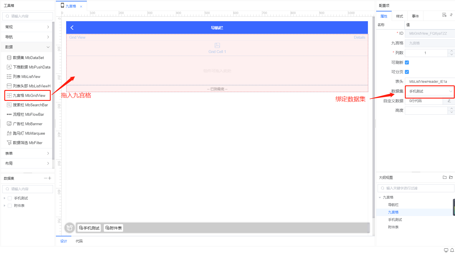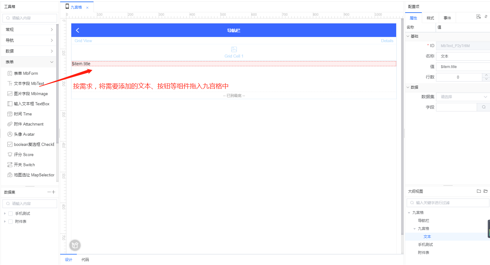 ## 九宫格 ### 1、添加九宫格  ### 2、九宫格属性 - 列数:手机端数据显示列数 - 可刷新:勾选后手机端能通过下拉方式刷新数据 - 可分页:勾选后手机端加载数据时,按分页加载方式加载 - 表头:有添加列表头部组件时,绑定列表头部组件的ID值 - 自定义数据:自定义在九宫格中显示的数据,需为数组或数组对象格式数据,如['a','b','c'];[{title:'1'},{title:'2'},{title:'3'}];需在九宫格中拉入其他组件引用,引用时,数组用:$item 数组对象用:$item.key(如:$item.list) ### 3、九宫格添加内容  ### 4、自定义及非自定义数据配置及效果展示 #### 4.1、自定义数据配置   效果展示  #### 4.2、非自定义数据配置  效果展示(注:为方便查看,此处文本字段有加背景色)
