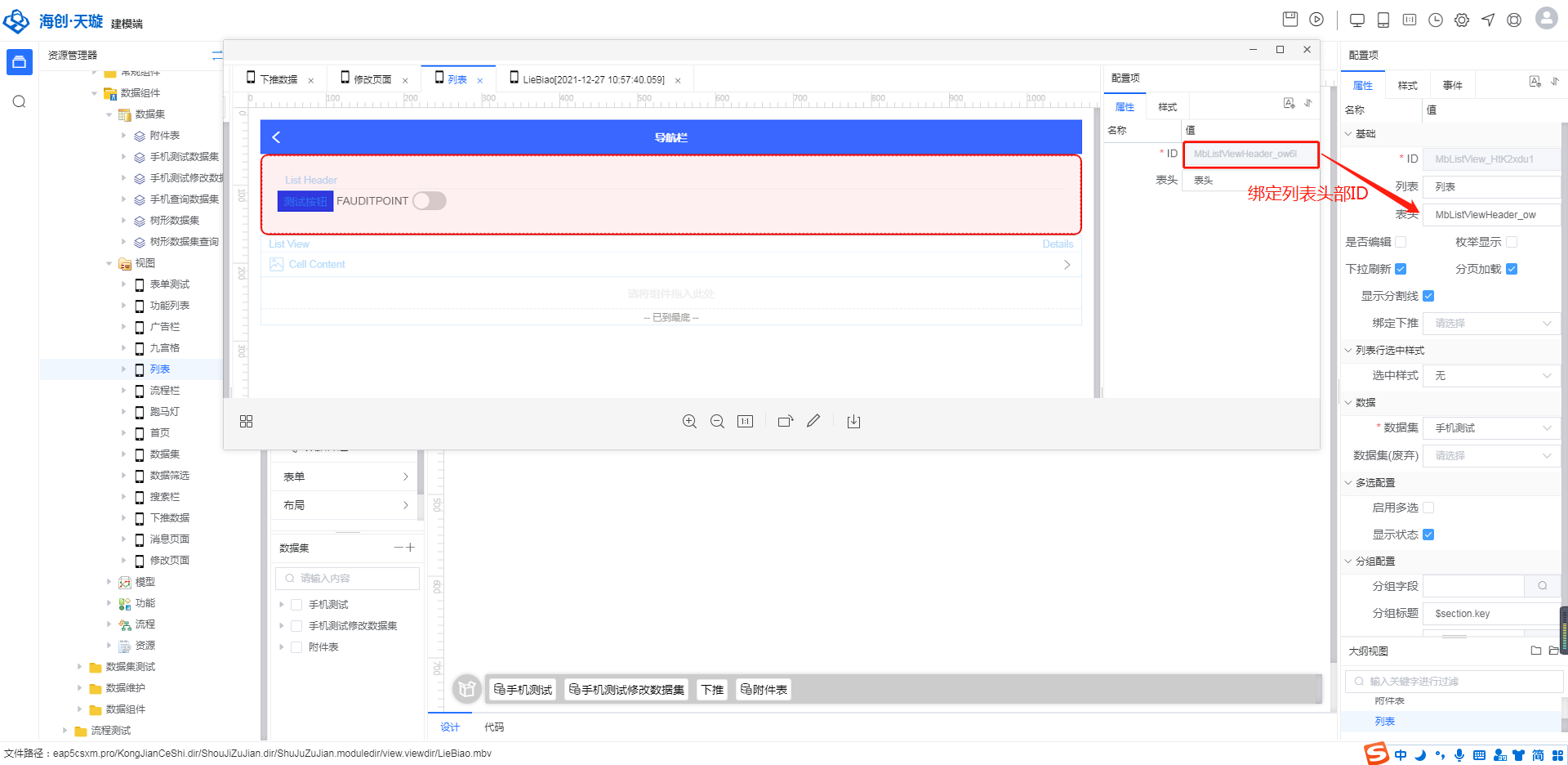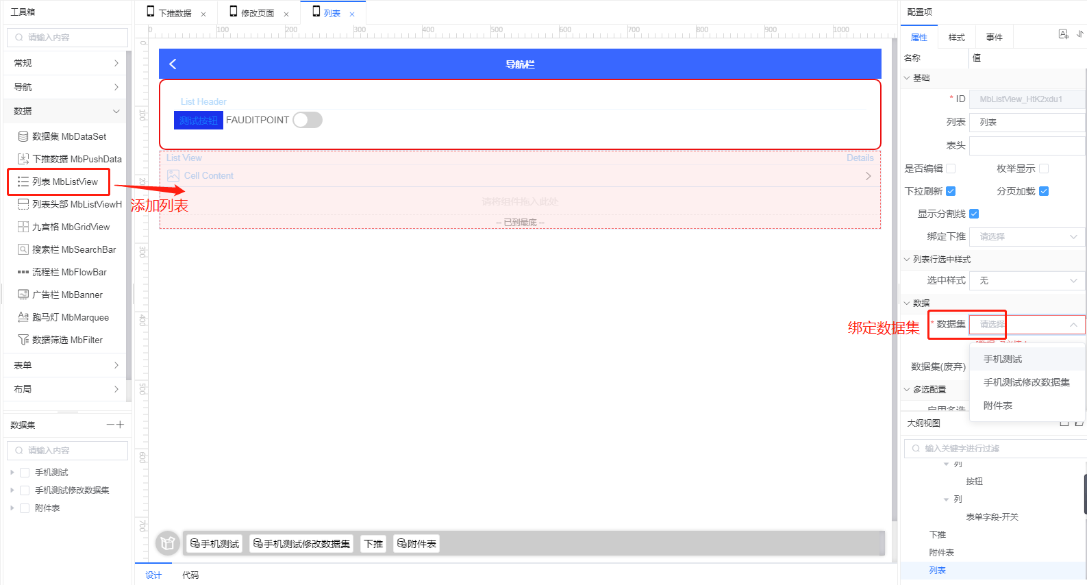 ## 列表列表头部 ### 1、列表头部 - 添加列表头部  - 列表头部样式配置  - 添加展示内容(根据需求添加行列布局及其它需要在列表头部展示的内容)  ### 2、列表 #### 2.1、添加列表  #### 2.2、列表属性配置 表头:有添加列表头部时,绑定列表头部组件ID  - 是否编辑:勾选后,数据集中允许编辑的字段可编辑 - 下拉刷新:勾选后,支持手机中下拉刷新页面数据 - 分页加载:勾选后,支持分页加载(未勾选时,一次性加载所有数据)  - 显示分割线:勾选后,显示行间分割线 显示分割线 - 绑定下推:列表数据需要下推到其他页面时,绑定下推页面 - 分组配置:列表数据按分组字段分组显示 分组字段:添加用于分组的字段 分组标题:分组标题为“$section.key”时,标题显示为字段名称(也可自定义标题); 分组标题样式:添加分组标题样式脚本 #### 2.3、添加列表展示内容(根据需求添加行列布局及其它需要在列表头部展示的内容)  ### 3、效果展示 - 未分组  - 已分组