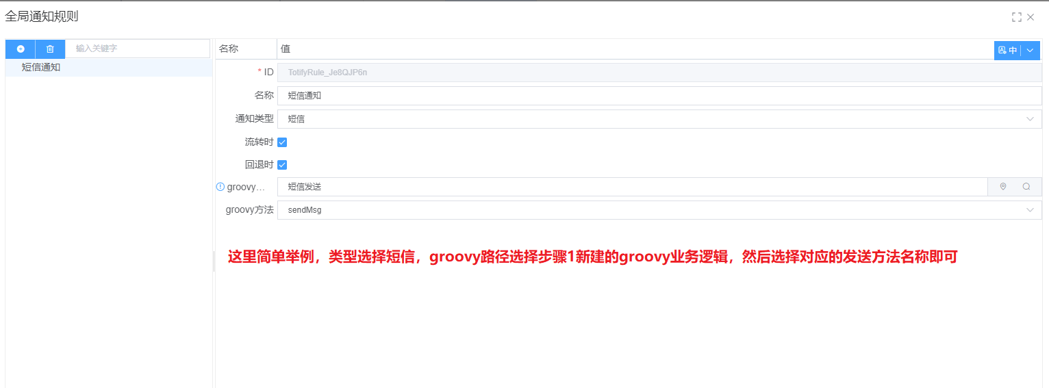 ## 短信通知 ### 短信环境配置: 注意:目前是配置在application.yml文件,后续会更改,若发现无法使用,请及时查看文档更改 华为: ``` zhc: #短信模块 sms: #服务类型,默认为zhc service: huaWei #短信域名,必填,例:http(s)://服务器的域名[:端口] huawei_host: #短信地址,必填 huawei_path: #APP_Key,必填 huawei_key: #APP_Secret,必填 huawei_secret: #国内短信签名通道号或国际/港澳台短信通道号,必填 huawei_sender: #模板ID,必填 huawei_tmpid: #签名名称,必填 huawei_signature: #选填,短信状态报告接收地址,推荐使用域名,为空或者不填表示不接收状态报告,若不需要,该项不配置即可 huawei_scback: ``` 阿里云官方: ``` zhc: #短信模块 sms: #服务类型,默认为zhc service: aliyun #访问ID,默认为空 access_id: #访问密钥,默认为空 access_secret: #端点(一般不会变,默认为:dysmsapi.aliyuncs.com) endpoint: #签名 sign_name: #模板编码 template_code: #模板参数 template_param: ``` 阿里云第三方: ``` zhc: #短信模块 sms: #服务类型,默认为zhc service: zhc #验证码格式,默认为空 ,例:【海创云】验证码:%s,5分钟内有效! captcha_fmt: #短信域名,必填,例:http(s)://服务器的域名[:端口] app_host: #短信地址,必填 app_url: #短信密钥,必填 app_code: ``` ### 流程短信通知操作步骤: ------------ 1.新建短信groovy业务逻辑,如图:  2.编写groovy逻辑 ```groovy import com.alibaba.fastjson.JSON; import com.alibaba.fastjson.JSONArray; import com.alibaba.fastjson.JSONObject; import com.zhc.eap.model.entity.groovy.Entity; import com.zhc.eap.service.IJavaService; import com.zhc.eap.util.MD5Util; import javax.servlet.http.HttpServletRequest; import javax.servlet.http.HttpServletResponse; import java.util.HashMap; import java.util.List; import java.util.Map; import com.zhc.eap.funclib.*; import com.system.util.SystemLogsHelper; import com.zhc.eap.util.ExceptionUtil; import org.slf4j.Logger import org.slf4j.LoggerFactory import com.zhc.eap.model.entity.IWebEntity; import com.zhc.eap.context.SpringContextUtils; import com.zhc.eap.service.sms.SmsService; import com.zhc.eap.service.Impl.FlowDataHandle class DuanXinFaSong { private Logger logger = LoggerFactory.getLogger("DuanXinFaSong.groovy") //logger.info("日志信息"); 输日志 //com.zhc.eap.util.ExceptionUtil.throwMessage(entityCo.get("controlDesc")); 抛异常 //event-placeholder /** * 获取数据集列表案例: * JSONArray array = (JSONArray) map.get("mainParams") * List<Map<String, Object>> list = FlowDataHandle.getInstance().query(array) * * 获取单号:map.get("fordernumber") */ public void sendMsg(Map<String, Object> map){ //1.获取短信通知类 SmsService smsService = SpringContextUtils.getBean(SmsService.class); //2.获取接收者用户信息 List<Map<String, String>> usrInfo = map.get("usrInfo"); //3.循环遍历发送短信 for (Map<String, String> item : usrInfo) { //获取接收者手机号码 String fmbphone = item.get("fmbphone"); //发送内容,注意:这里只是简单举例,具体发送内容请自行定义模板,模板内容在第三方供应商注册 String context = "你有一条任务待处理,流程名称:"+map.get("fpdisplayname")+",环节名称:"+map.get("fdisplayname"); //使用系统工具类发送短信 smsService.sendSms(fmbphone,context); //若不想使用系统工具类发送,可以自定义调用第三方接口发送 } } } ``` ------------ **注意:此处拷贝《方法》和《导入包》即可,类名之类的每个groovy不同,因此不要一股脑全部拷贝** ------------ 3.流程配置,可以配置全局通知,也可以配置环节通知,具体以需求为准,如图: