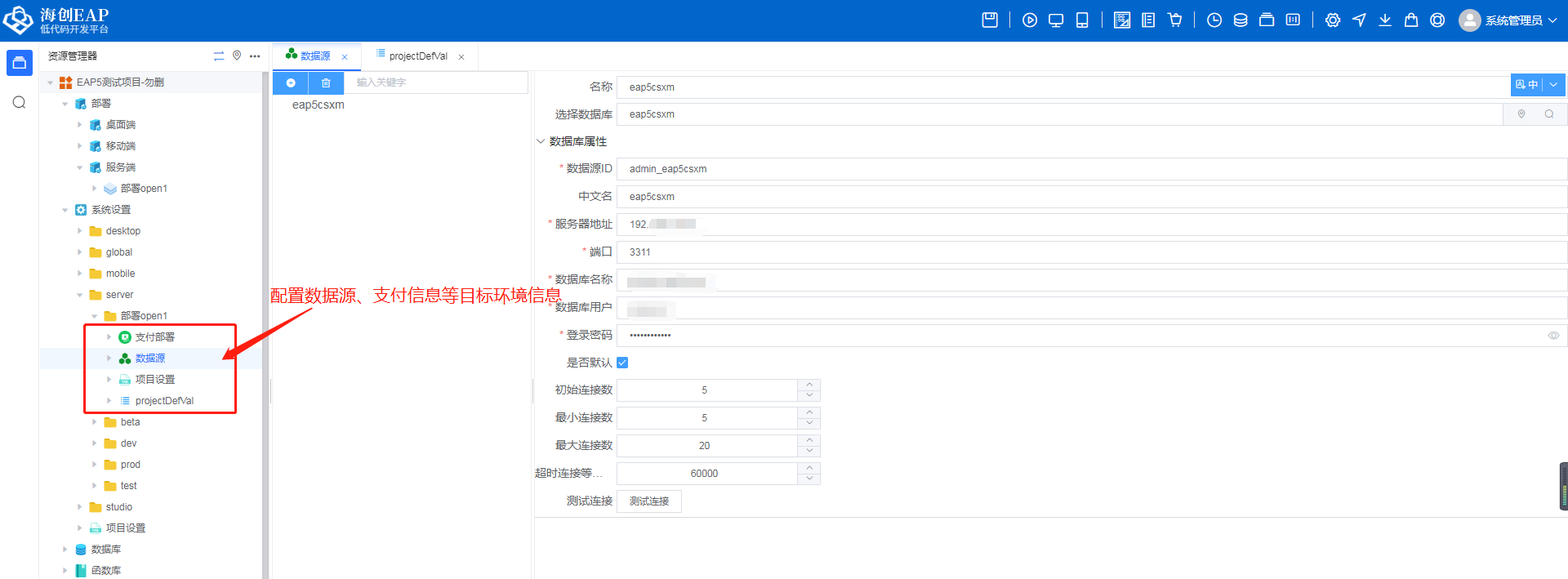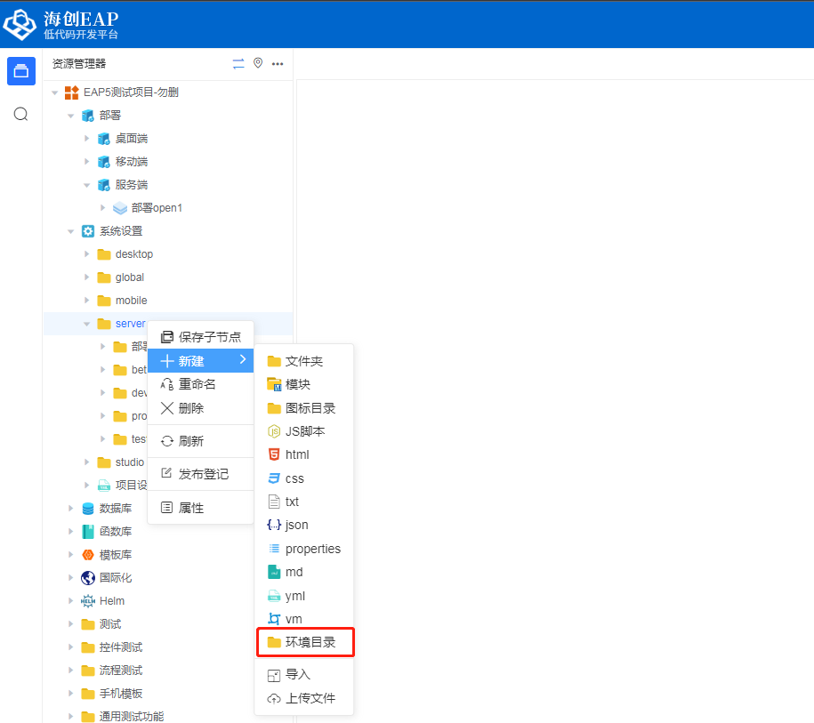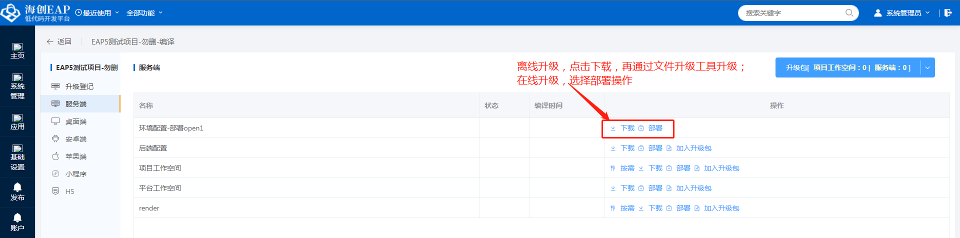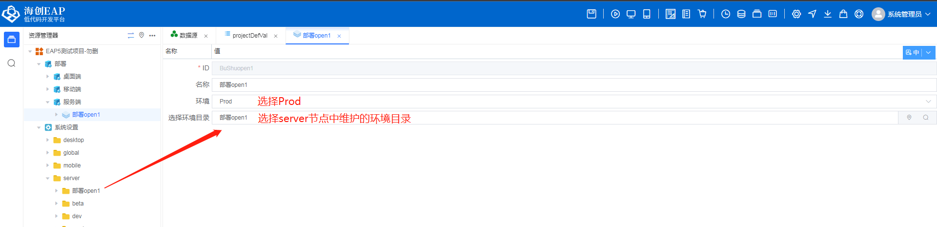 ## 环境升级 ### 1、工程树配置 #### 1.1、系统设置>server节点添加“环境目录”  #### 1.2、配置目标环境信息  #### 1.3、部署>服务端 添加“服务端部署”  #### 1.4、绑定环境目录  ### 2、部署升级