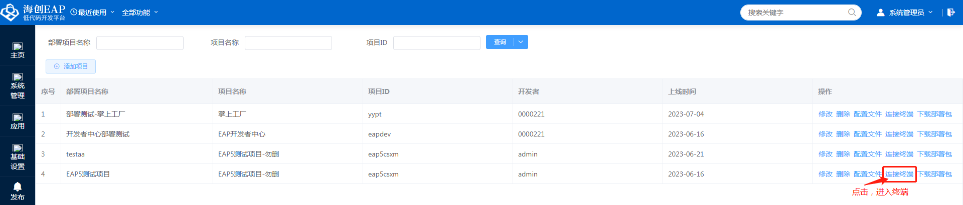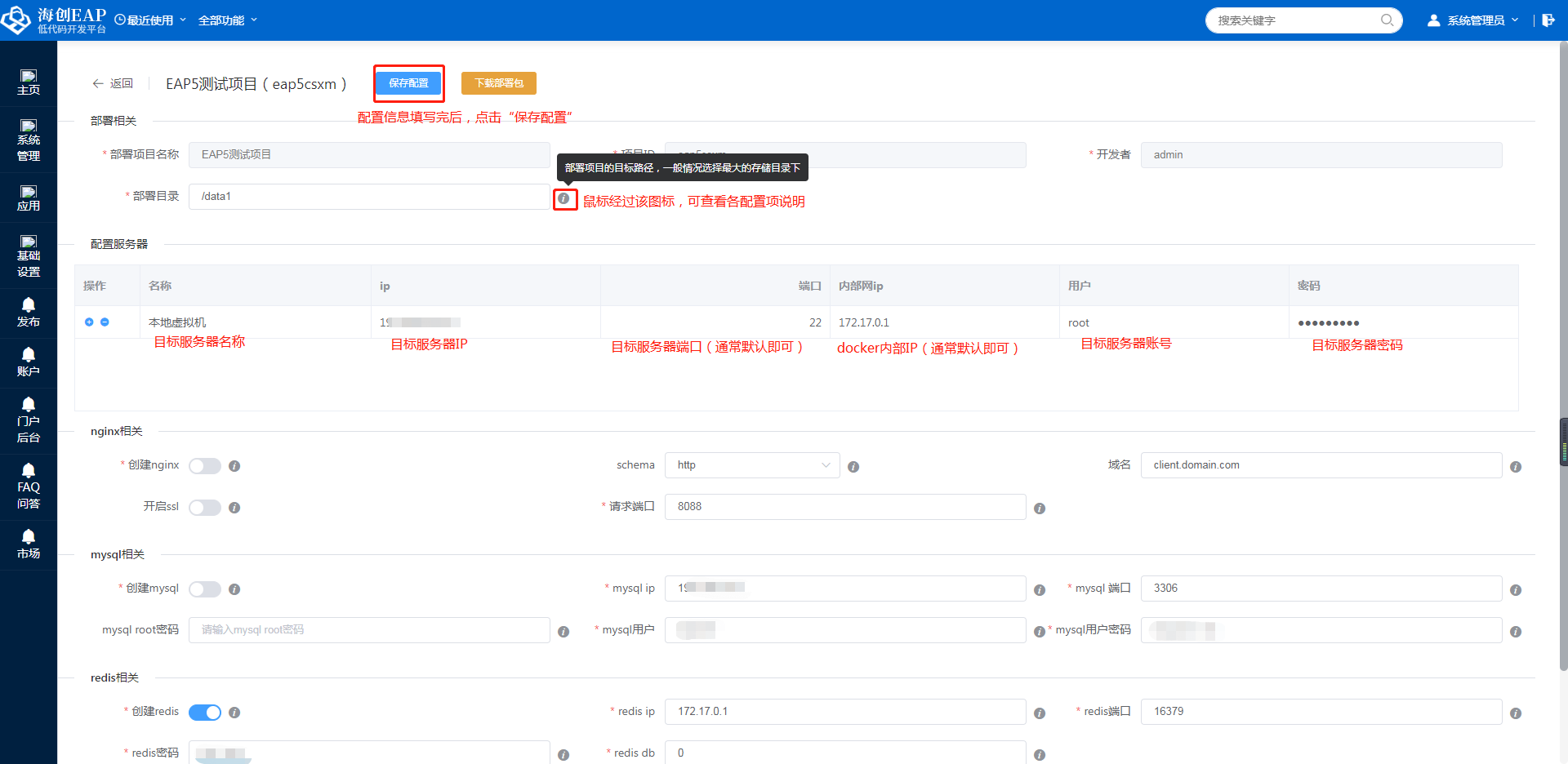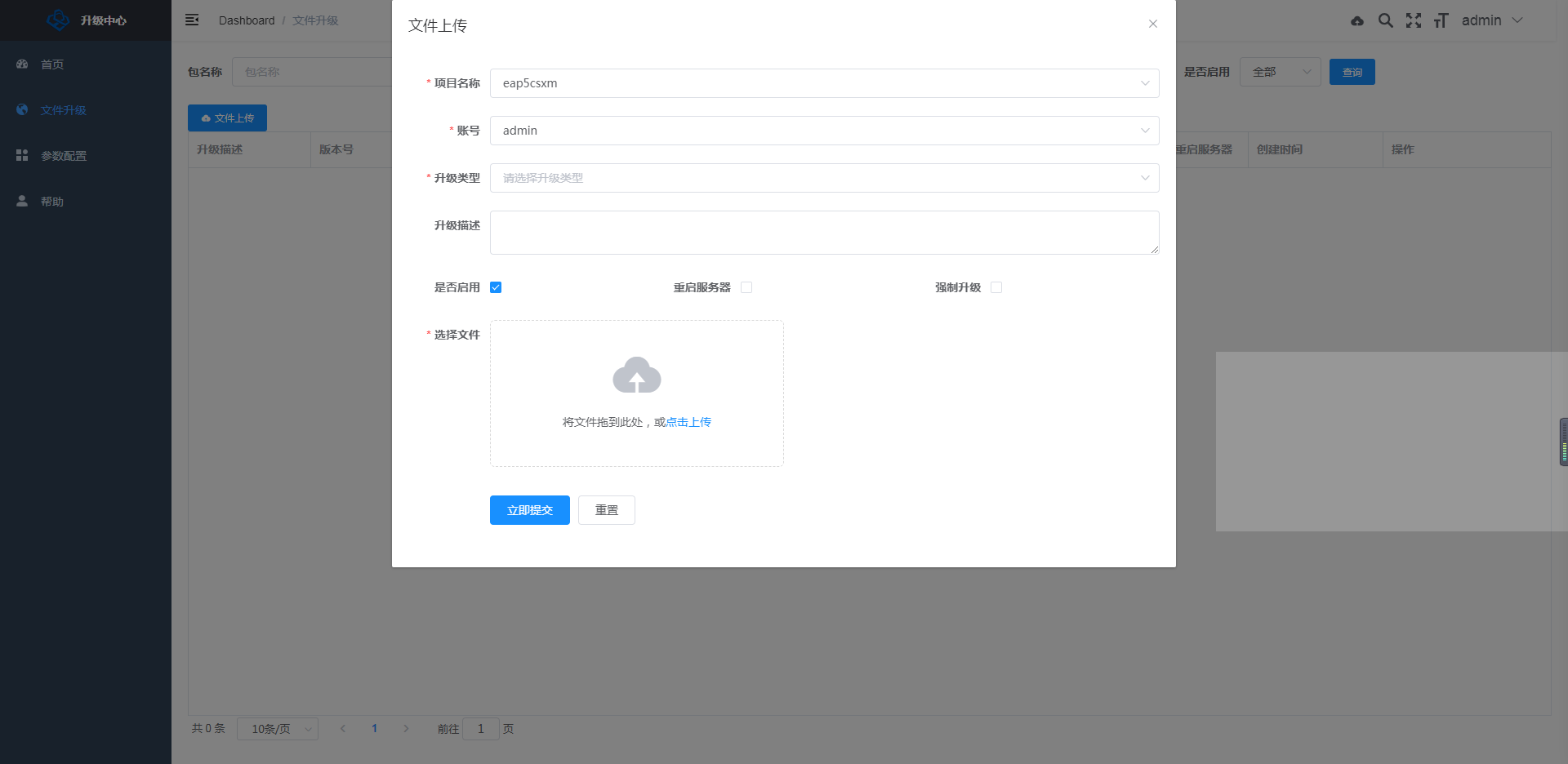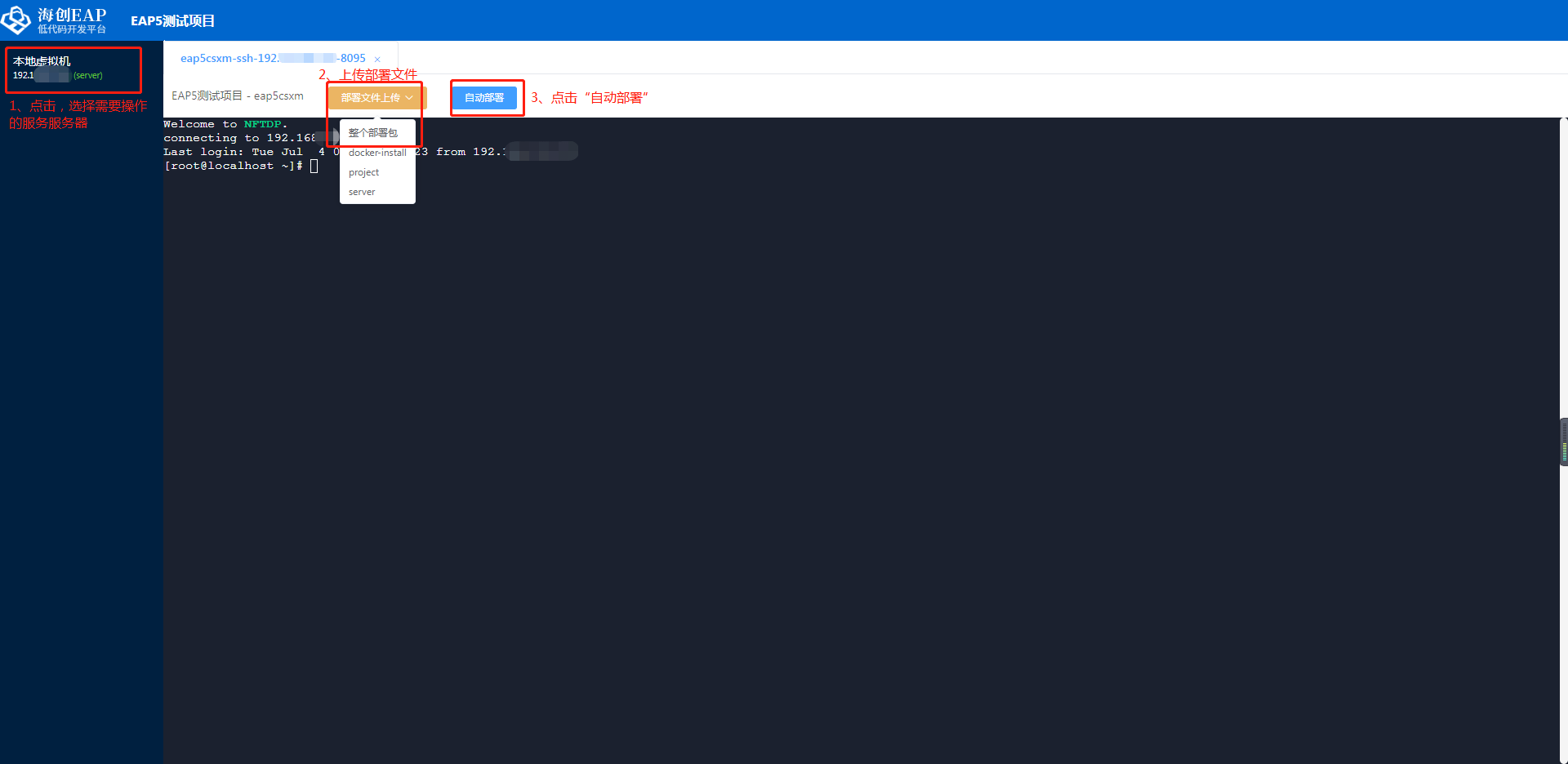 ## 运维部署 ### 1、部署数据维护 #### 1.1、添加项目  #### 1.2、填写配置文件 - 进入配置页面  - 填写配置相关信息(带 * 为必填项) 注意:开启ssl后,必须有证书,否则服务将无法启动  ### 2、在线部署 - 进入终端  - 执行部署 注:该终端仅用于查看部署日志,其他服务器操作建议使用其他工具   ### 3、项目文件上传 #### 3.1、下载项目文件包 注意:项目需先编译,且工程树中项目部署环境需提前配置好  #### 3.2、上传项目文件 - 进入升级管理中心 地址:http://(目标服务器IP):9090 账号:admin 密码:9999 - 上传文件(参数配置通常默认即可) 注意:环境配置 文件需最后升级    ### 4、打开项目 地址:http://(目标服务器IP):(请求端口)/index.html