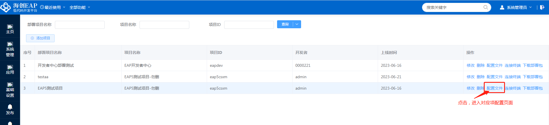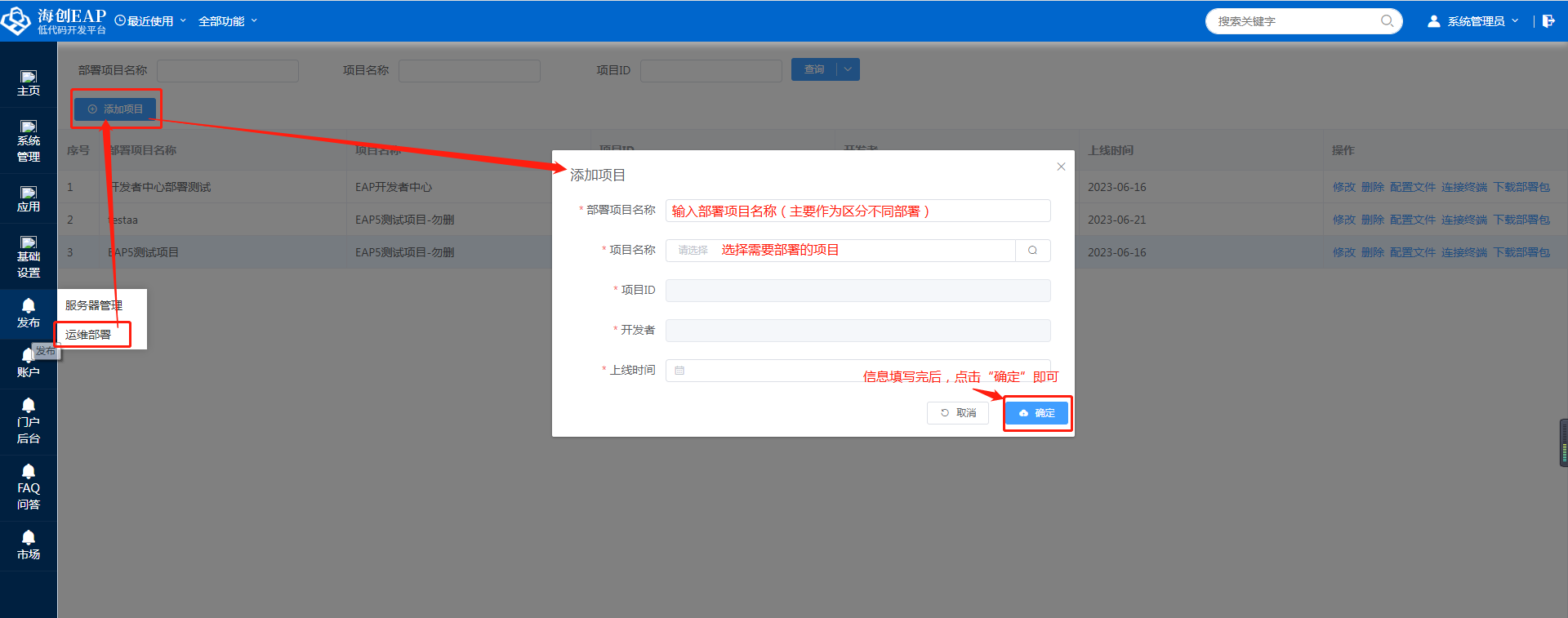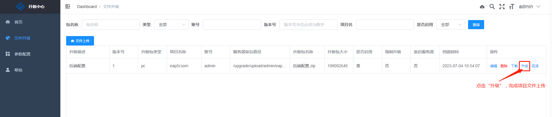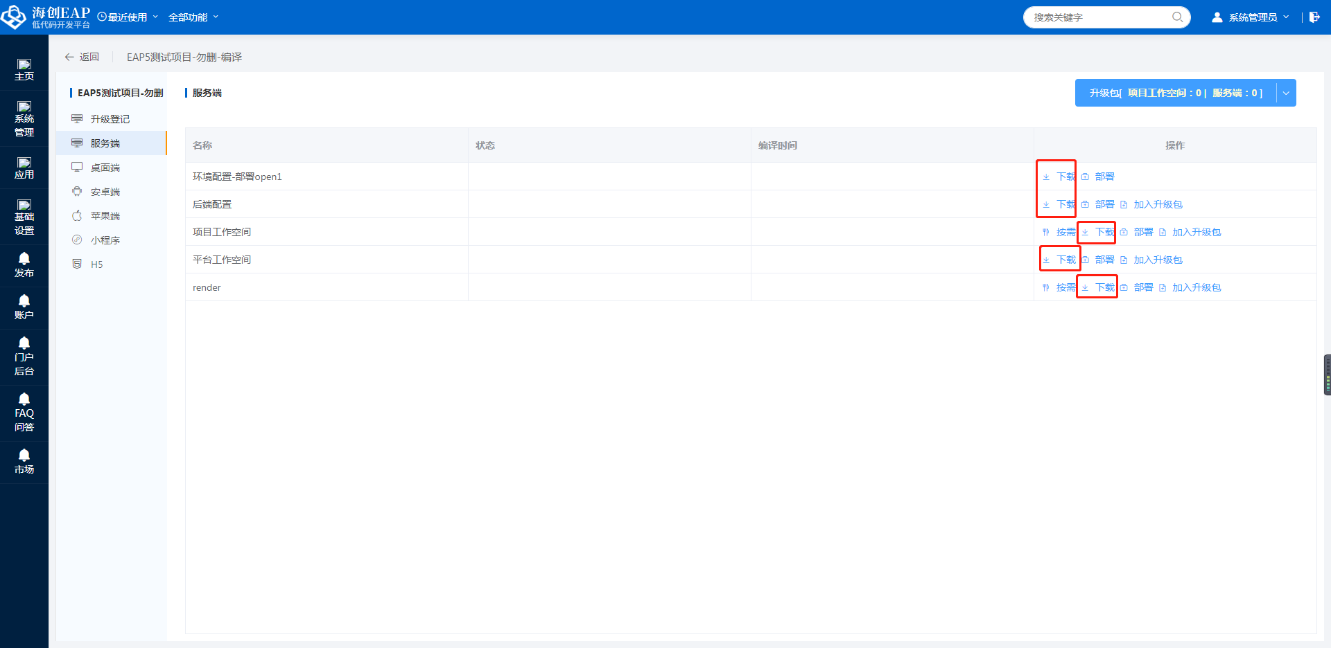 ## 运维部署 ### 1、部署数据维护 #### 1.1、添加项目  #### 1.2、填写配置文件 - 进入配置页面  - 填写配置相关信息(带 * 为必填项) 注意:开启ssl后,必须有证书,否则服务将无法启动  ### 2、在线部署 - 进入终端  - 执行部署 注:该终端仅用于查看部署日志,其他服务器操作建议使用其他工具   ### 3、项目文件上传 #### 3.1、下载项目文件包 注意:项目需先编译,且工程树中项目部署环境需提前配置好  #### 3.2、上传项目文件 - 进入升级管理中心 地址:http://(目标服务器IP):9090 账号:admin 密码:9999 - 上传文件(参数配置通常默认即可) 注意:环境配置 文件需最后升级    ### 4、打开项目 地址:http://(目标服务器IP):(请求端口)/index.html