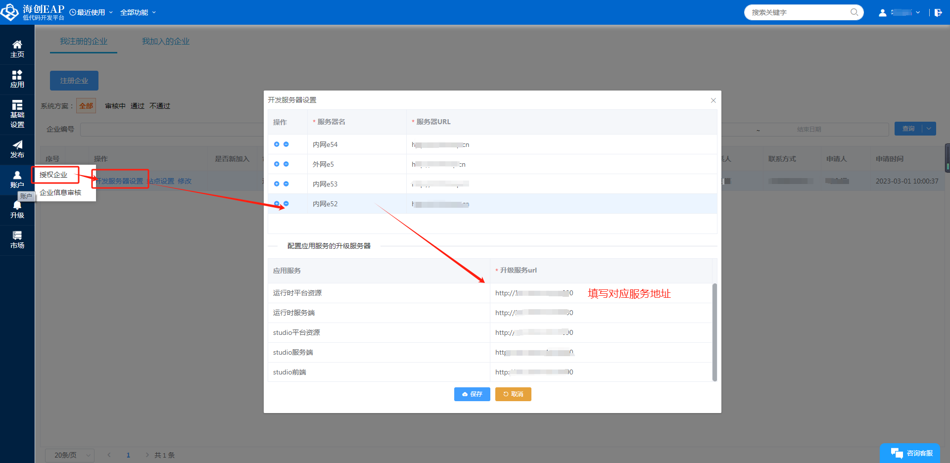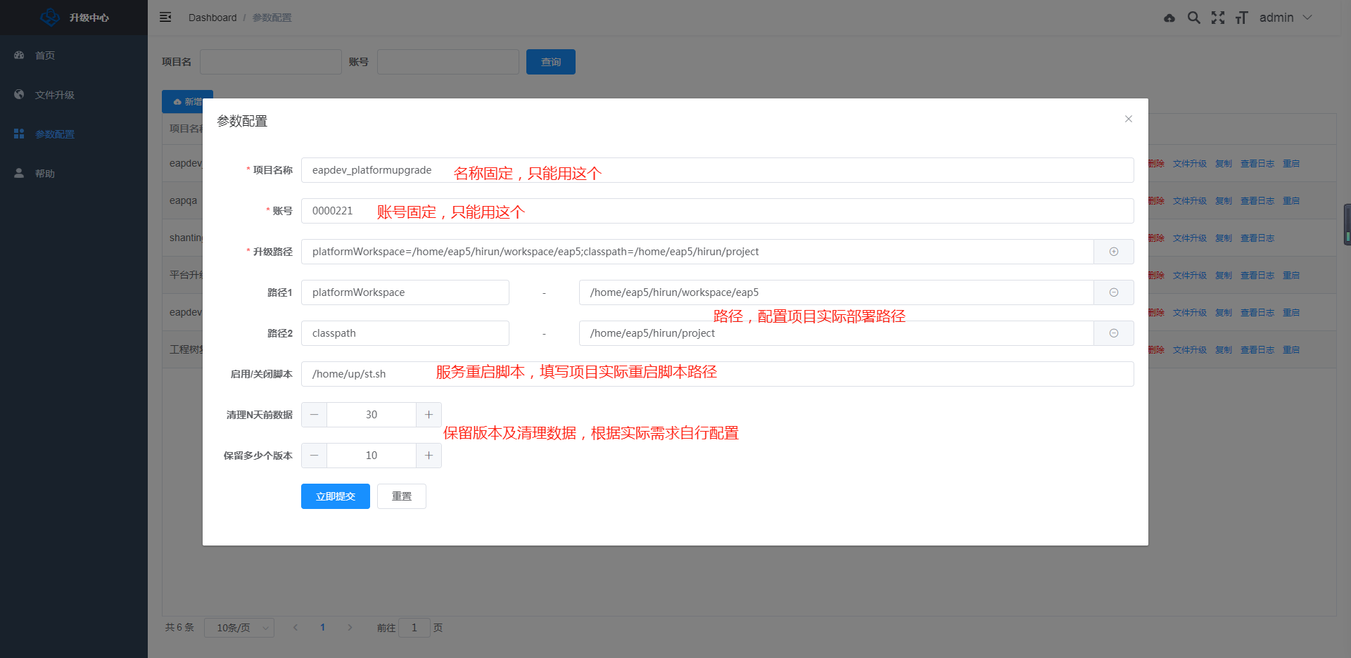 ## 平台版本升级 ### 1、升级中心配置(已配置的跳过) 项目名称:eapdev_platformupgrade 路径配置: - hirun两个: platformWorkspace(示例:/home/eap5/hirun/workspace/eap5) classpath(示例:/home/eap5/hirun/project) - studio三个: visualStudio(示例:/home/eap5/visualStudio) platformWorkspace(示例:/home/eap5/studio/workspace/eap5) classpath(示例:/home/eap5/studio/project)  ### 2、服务器配置(已配置的跳过)  ### 3、升级操作