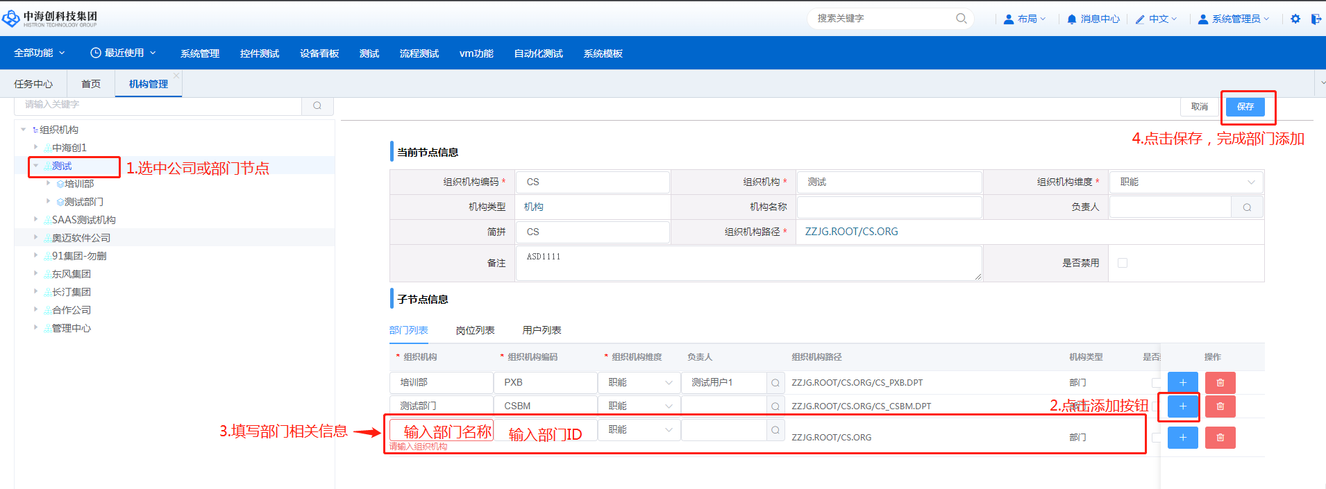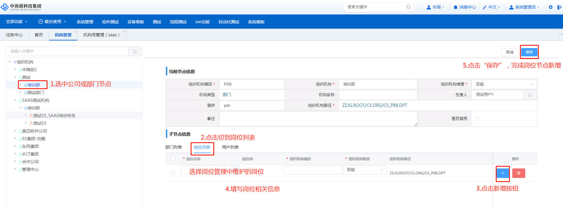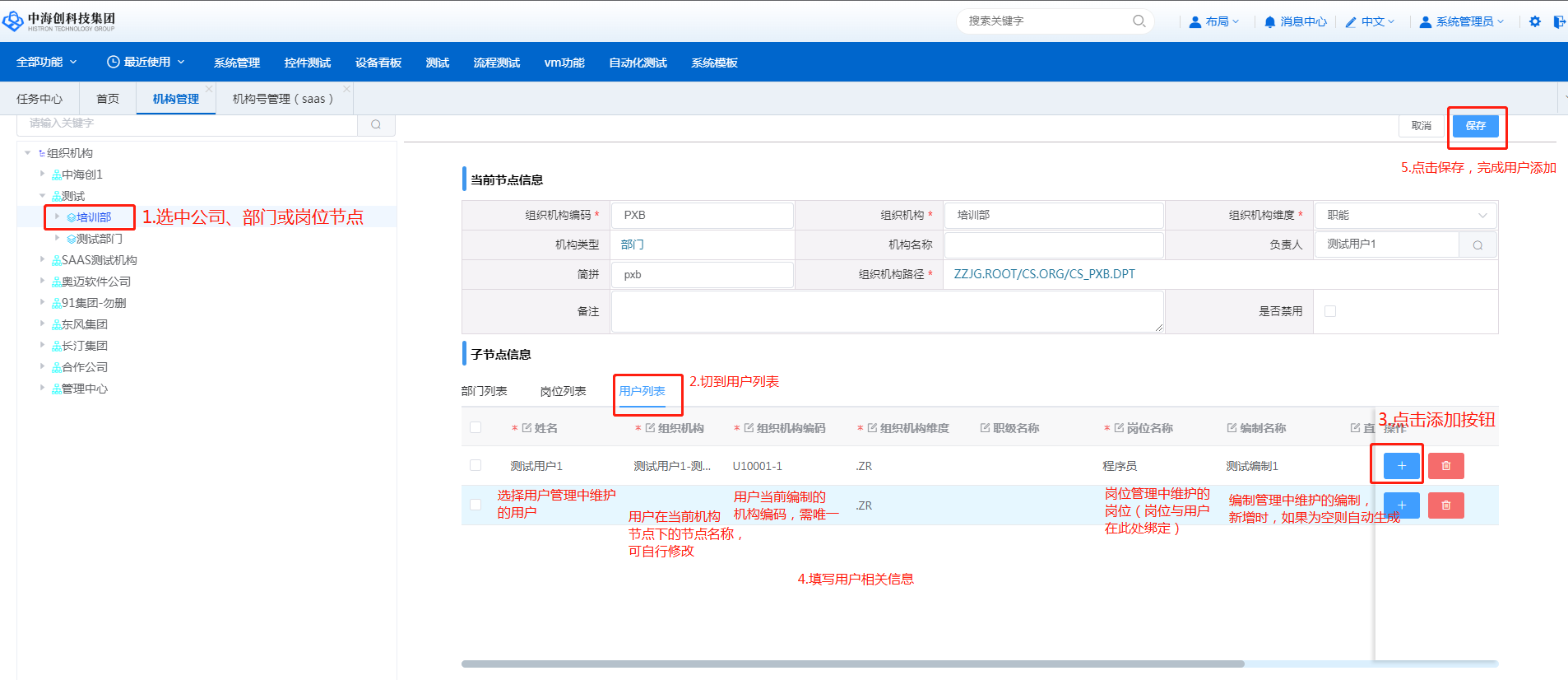 ## 机构管理 ### 1、新增公司 - 新增公司必须在根节点(机构路径为 .ROOT 结尾)下添加 - 公司节点为机构路径 .ORG 结尾的节点 - 组织机构编码唯一,不可重复  ### 2、新增部门 - 部门可在公司或部门节点下新增 - 部门节点为机构路径 .DPT 结尾的节点 - 启用SAAS时,部门的机构ID会自动拼接公司ID,如:公司ID为GS,功能中输入的部门ID为BM,则实际部门ID为GS-BM - 组织机构编码唯一,不可重复  ### 3、添加岗位节点 - 岗位可在公司或部门节点下新增 - 岗位节点为机构路径 .PTM 结尾的节点 - 启用SAAS时,岗位的机构ID会自动拼接公司ID,如:公司ID为GS,功能中输入的岗位ID为GW,则实际部门ID为GS-GW - 此处添加的岗位节点,仅作为节点归类用,不影响用户实际岗位绑定,可不添加该节点  ### 4、绑定用户 - 用户可在公司、部门或岗位节点下新增 - 用户节点为机构路径 .PSM 结尾的节点 - 组织机构编码唯一,默认填充用户ID,重复时需修改 - 同个用户有且只有一个默认编制(即主岗);用户有多岗,且存在未禁用的非主岗时,主岗不可禁用和删除 - 管理员操作切换主岗,只需将要切为主岗的编制中的【是否默认编制】勾选并保存即可;用自行切主岗可通过个人中心切换 - 新增用户列表时,【编制名称】允许为空,为空时自动生成编制;修改用户列表时,【编制名称】不允许为空。  ## 用户维护流程 - 查询用户 中新增用户(注:用户通过注册方式生成,则跳过该步骤) - 岗位管理 中维护岗位 - 编制管理 中维护编制(注:如果使用系统默认生成的编制,则可跳过该步骤) - 职级管理 中维护职级(注:如果未启用职级,则可跳过该步骤) - 机构管理 中添加公司、部门,并绑定用户、部门、岗位关系
