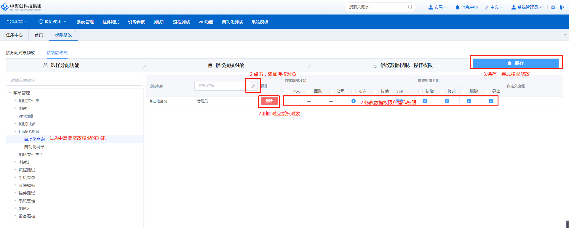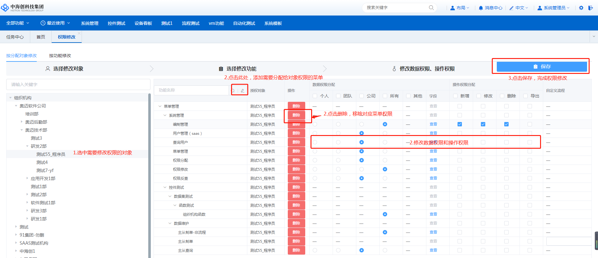 ## 权限修改 ### 1、按分配对象修改 - 每次保存只能修改一个分配对象的菜单权限  ### 2、按功能修改 - 每次保存只能修改一个功能的授权对象