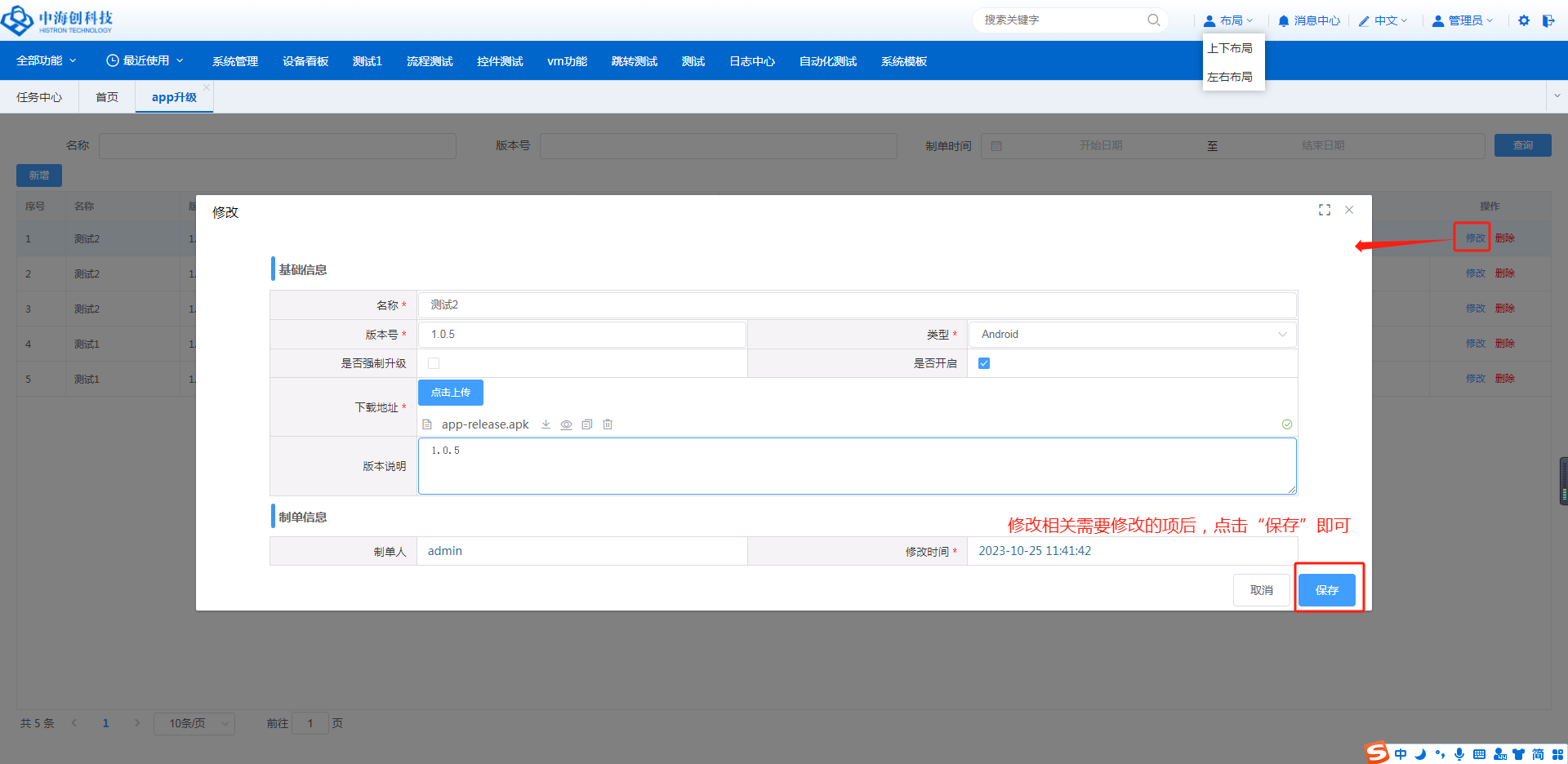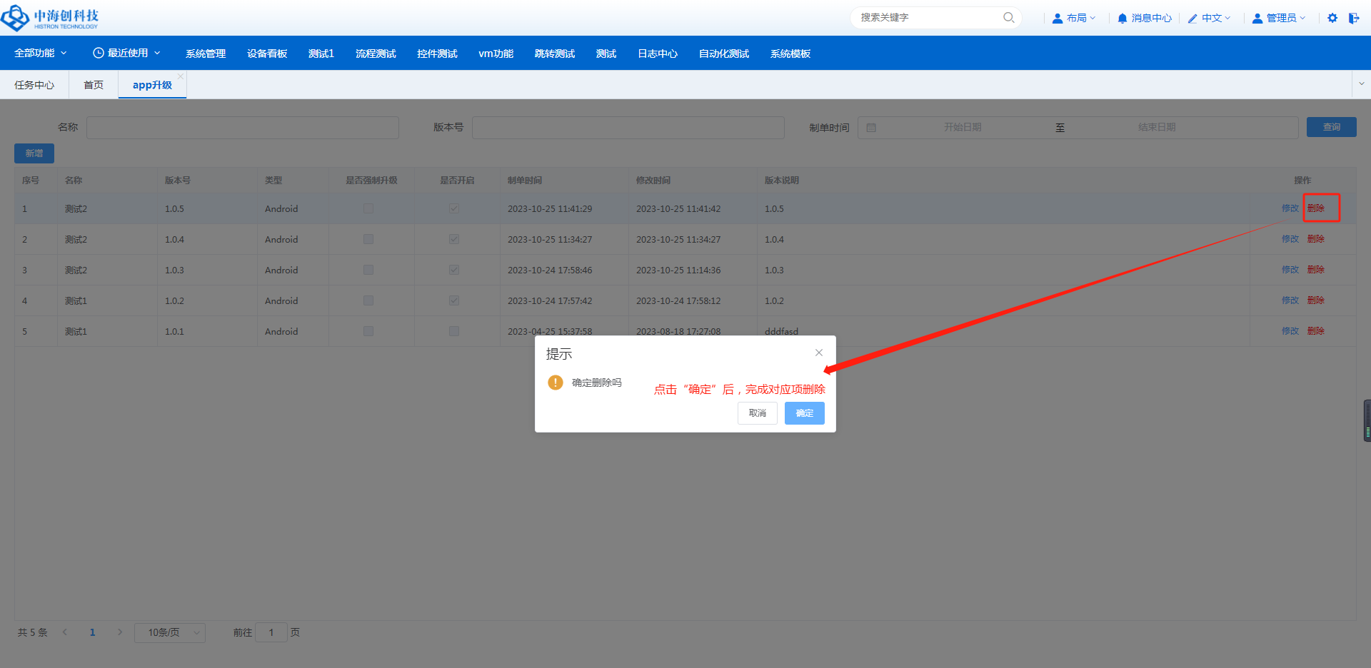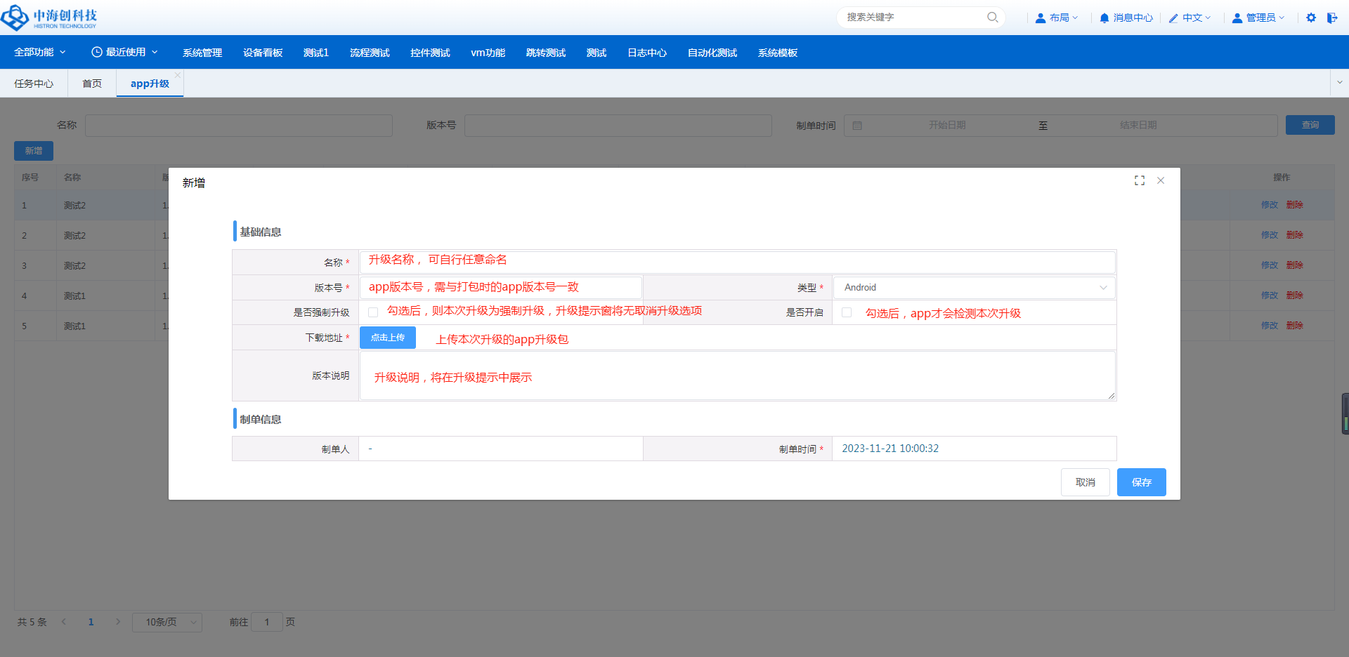 ## APP升级 ### 1、新增  ### 2、修改  ### 3、删除  ### 4、其他说明 - 多条数据同时勾选“是否开启”时,APP升级检测以修改时间最大的为准 - updateUrl参数为空或无该参数时,启用该功能升级,否则按参数路径方式升级(参数设置路径:系统设置>mobile>app>app.config)