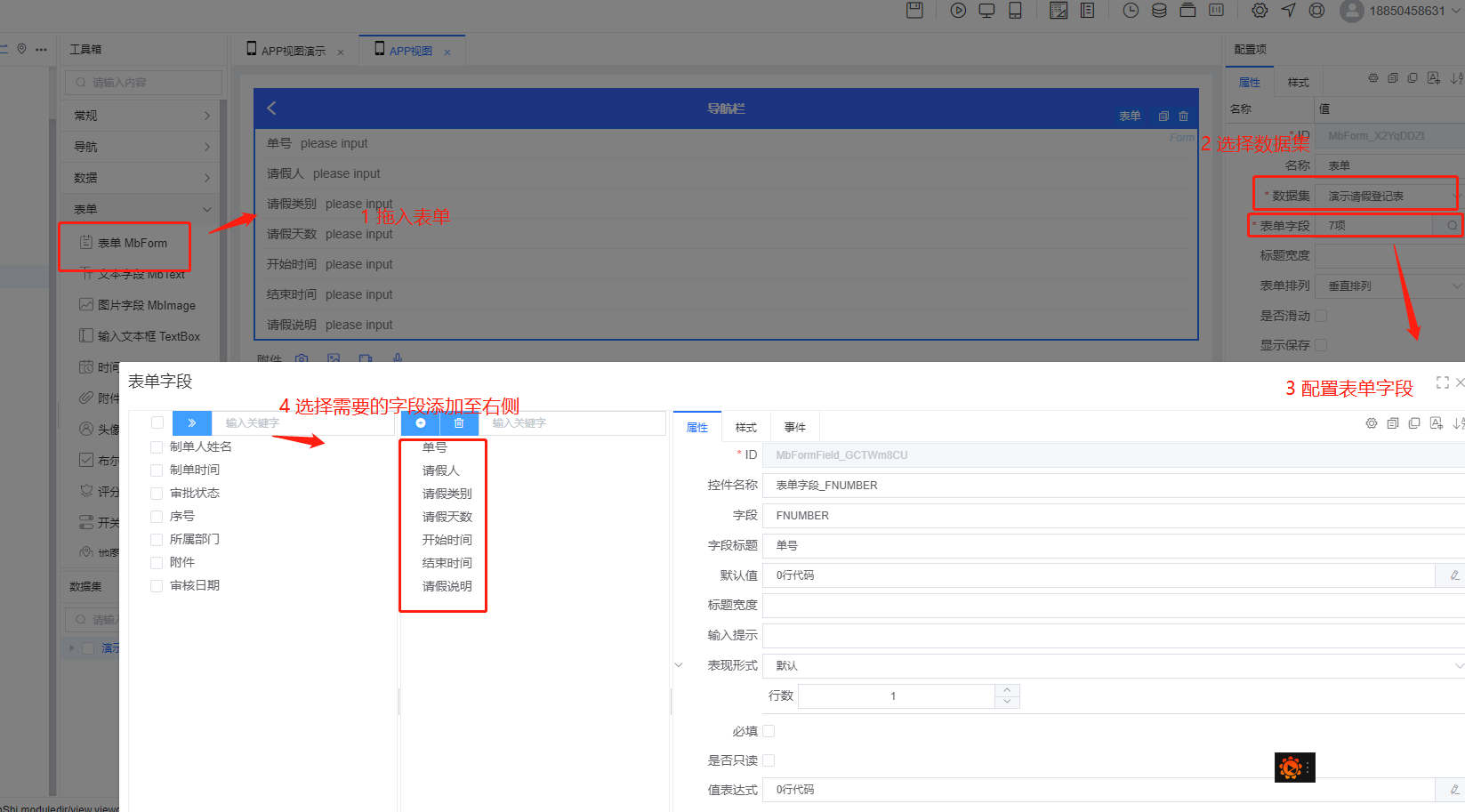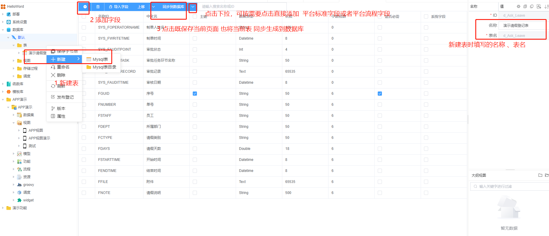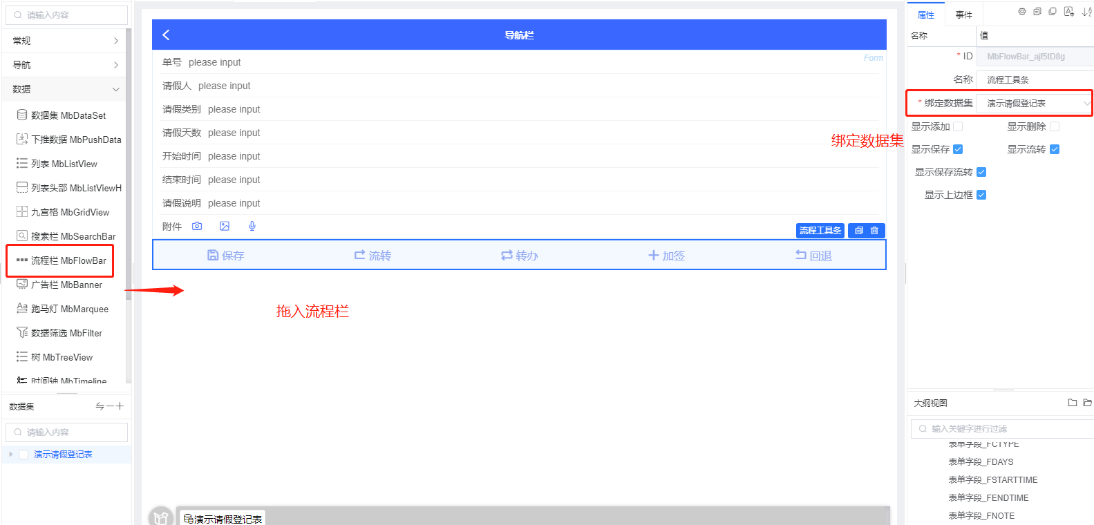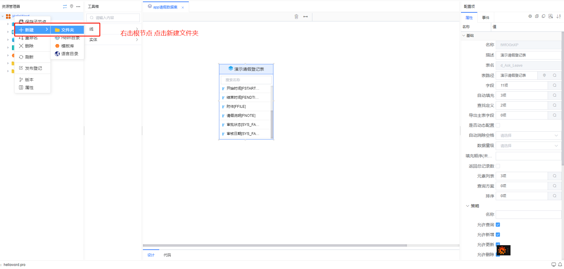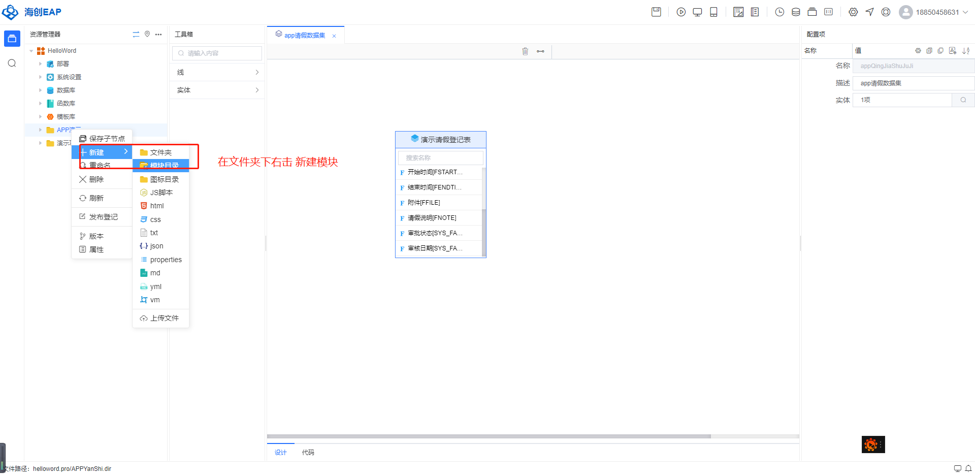 ## APP入门教程 ### 1、概述 本操作手册,是指导配置一个APP流程型制单功能 ### 2、操作指南 #### 2.1、建表 - 工程树中创建表并同步到数据库  #### 2.2、制单功能 ##### 2.2.1、创建目录模块   ##### 2.2.2、创建数据集  - 添加实体&绑表  - 添加字段  - 字段只读、必填配置  - 自动填充配置 1)GUID配置  2)单号配置   添加单号规则  3)员工配置  4)审核标识  - 查找定义配置 添加枚举模型 1)请假天数模型配置   2)请假类别模型配置   查找定义配置   - 元素列表配置 流程型功能的数据集需要配置  ##### 2.2.3、创建视图  - 新增手机视图 - 视图页面配置 1)添加数据集  2)添加导航栏  3)添加表单   4)添加流程栏  5)配置单号激活 流程型功能的数据集需要配置  #### 2.3、创建流程  - 添加流程 - 添加环节、连线(注意:避免重复连线)  - 绑定表单界面  - 活动办理人配置(首环节无需配置  #### 2.4、分配菜单 - 添加菜单子节点  - 添加要分配菜单的功能   #### 2.5、分配权限 - 选择分配对象以及分配功能菜单