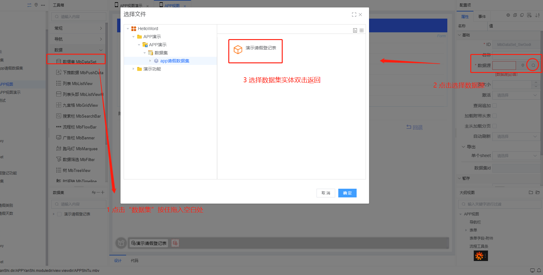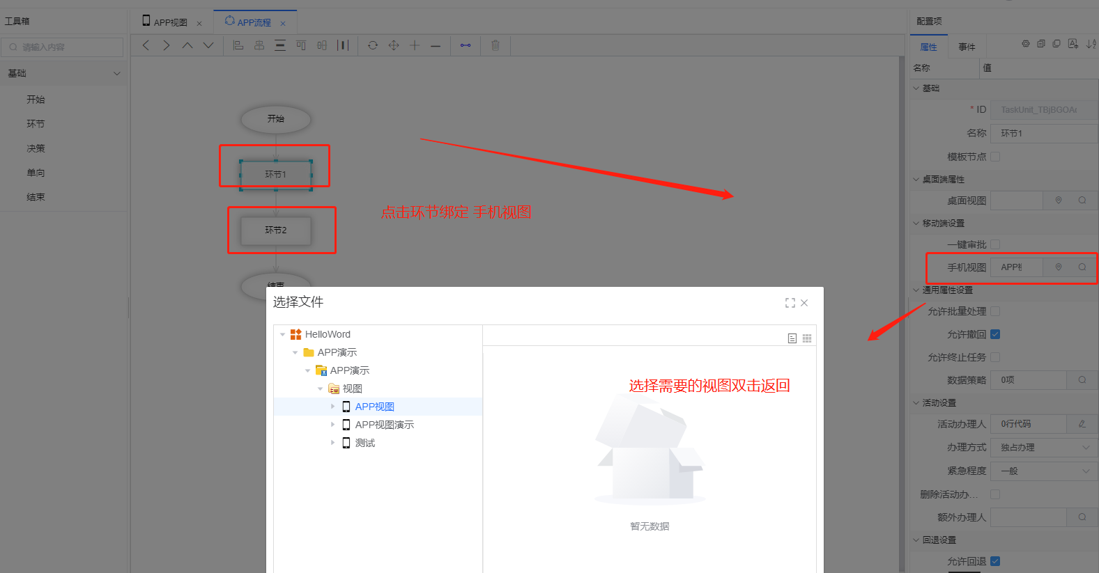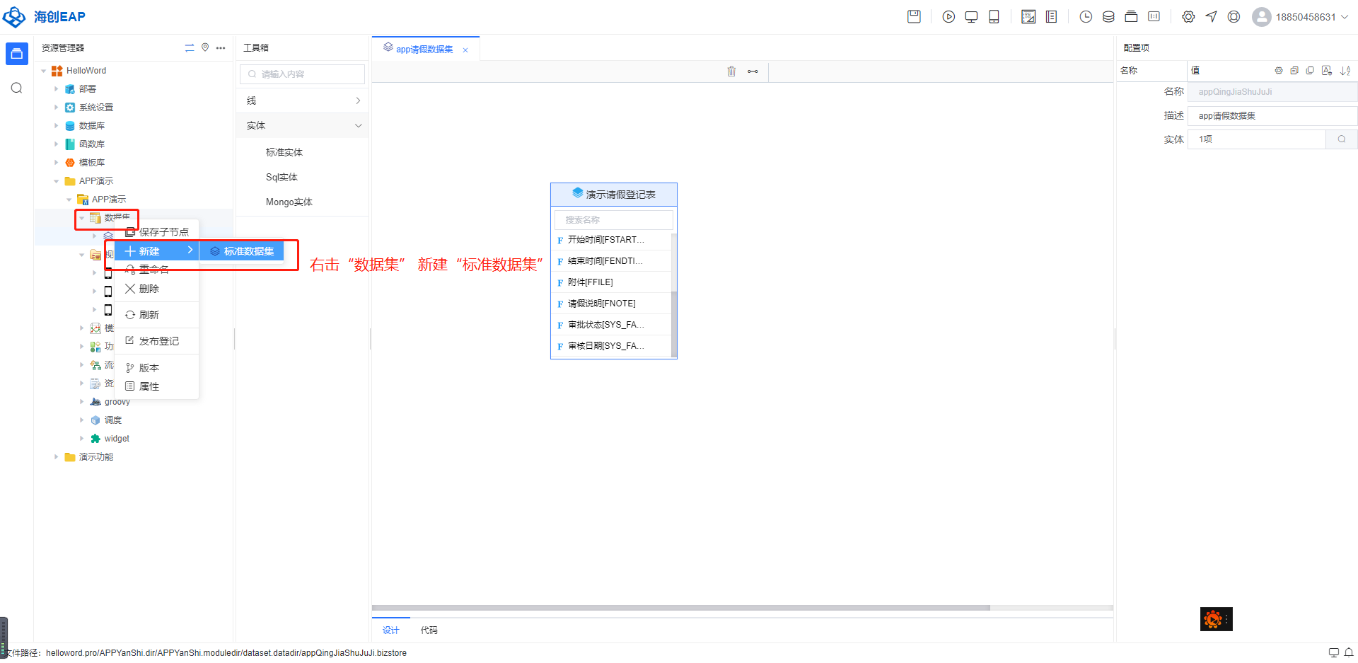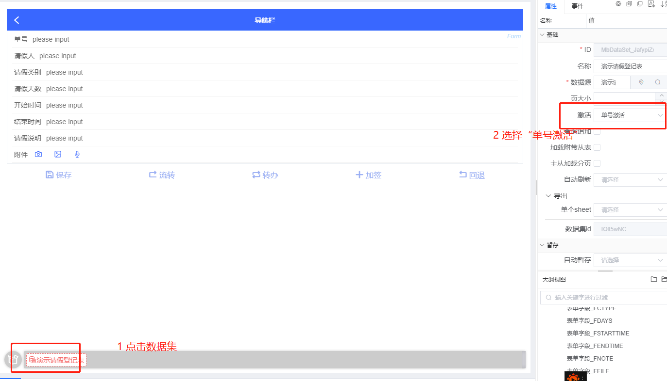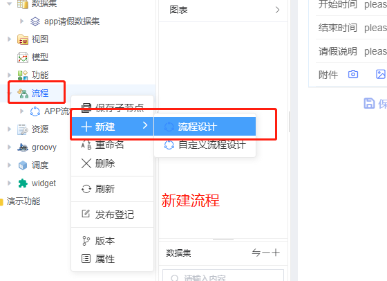 ## APP入门教程 ### 1、概述 本操作手册,是指导配置一个APP流程型制单功能 ### 2、操作指南 #### 2.1、建表 - 工程树中创建表并同步到数据库  #### 2.2、制单功能 ##### 2.2.1、创建目录模块   ##### 2.2.2、创建数据集  - 添加实体&绑表  - 添加字段  - 字段只读、必填配置  - 自动填充配置 1)GUID配置  2)单号配置   添加单号规则  3)员工配置  4)审核标识  - 查找定义配置 添加枚举模型 1)请假天数模型配置   2)请假类别模型配置   查找定义配置   - 元素列表配置 流程型功能的数据集需要配置  ##### 2.2.3、创建视图  - 新增手机视图 - 视图页面配置 1)添加数据集  2)添加导航栏  3)添加表单   4)添加流程栏  5)配置单号激活 流程型功能的数据集需要配置  #### 2.3、创建流程  - 添加流程 - 添加环节、连线(注意:避免重复连线)  - 绑定表单界面  - 活动办理人配置(首环节无需配置  #### 2.4、分配菜单 - 添加菜单子节点  - 添加要分配菜单的功能   #### 2.5、分配权限 - 选择分配对象以及分配功能菜单