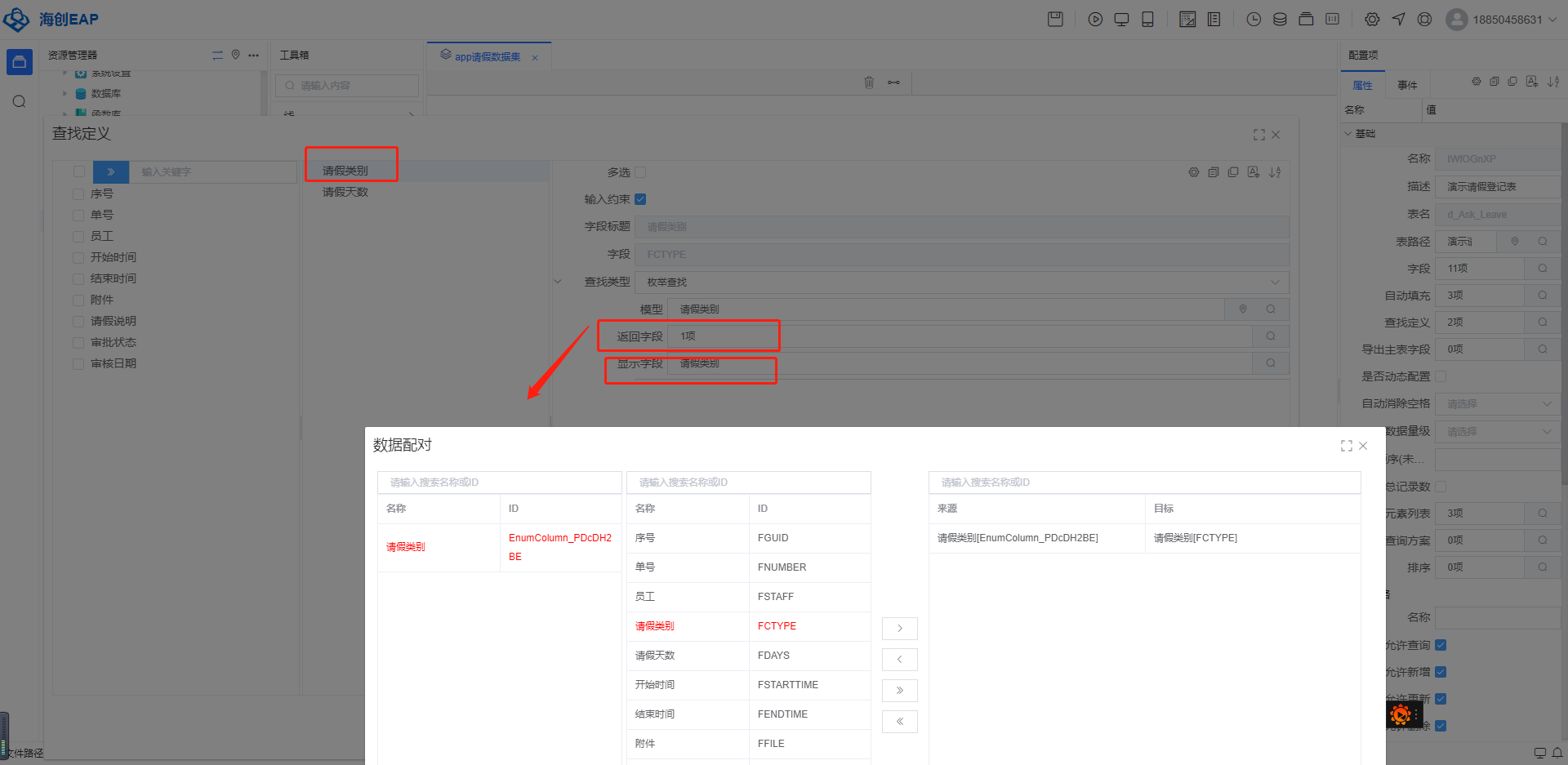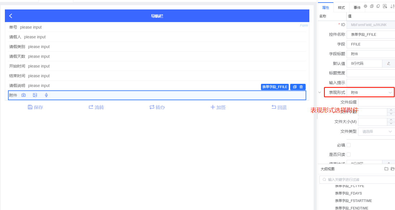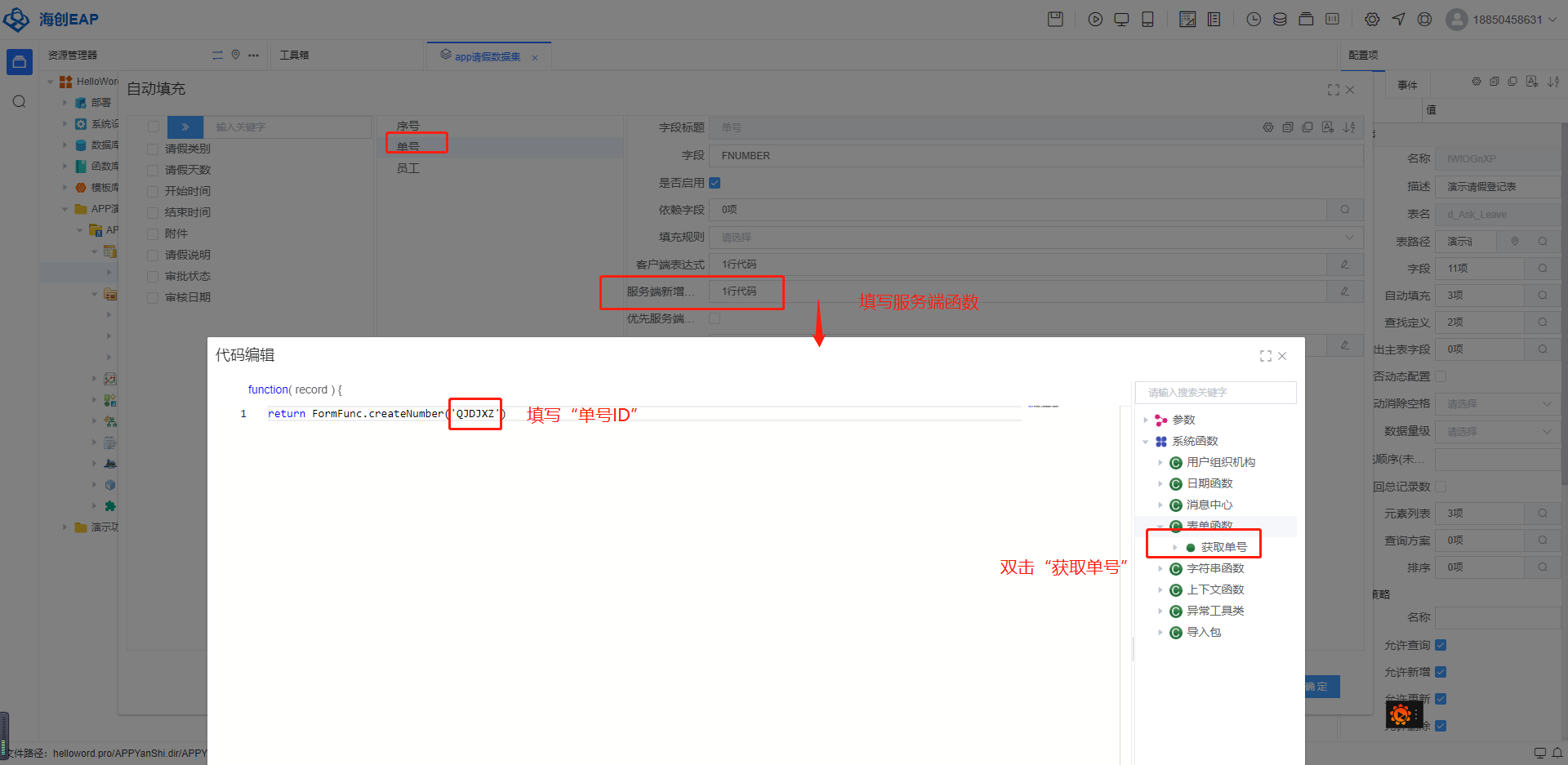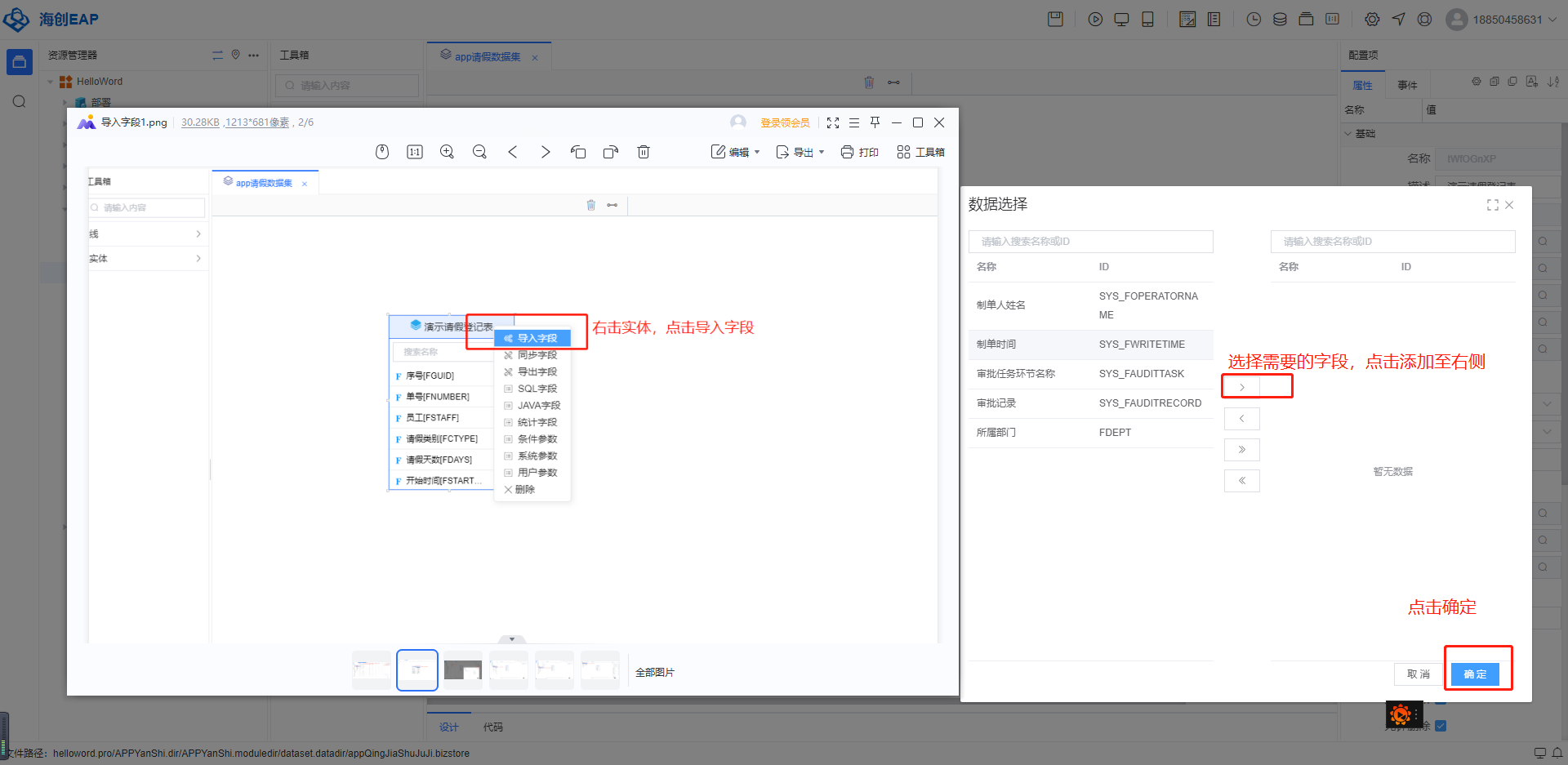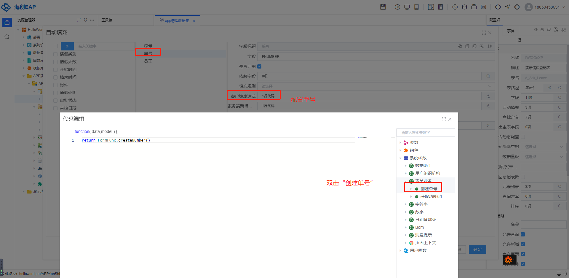 ## APP入门教程 ### 1、概述 本操作手册,是指导配置一个APP流程型制单功能 ### 2、操作指南 #### 2.1、建表 - 工程树中创建表并同步到数据库  #### 2.2、制单功能 ##### 2.2.1、创建目录模块   ##### 2.2.2、创建数据集  - 添加实体&绑表  - 添加字段  - 字段只读、必填配置  - 自动填充配置 1)GUID配置  2)单号配置   添加单号规则  3)员工配置  4)审核标识  - 查找定义配置 添加枚举模型 1)请假天数模型配置   2)请假类别模型配置   查找定义配置   - 元素列表配置 流程型功能的数据集需要配置  ##### 2.2.3、创建视图  - 新增手机视图 - 视图页面配置 1)添加数据集  2)添加导航栏  3)添加表单   4)添加流程栏  5)配置单号激活 流程型功能的数据集需要配置  #### 2.3、创建流程  - 添加流程 - 添加环节、连线(注意:避免重复连线)  - 绑定表单界面  - 活动办理人配置(首环节无需配置  #### 2.4、分配菜单 - 添加菜单子节点  - 添加要分配菜单的功能   #### 2.5、分配权限 - 选择分配对象以及分配功能菜单
