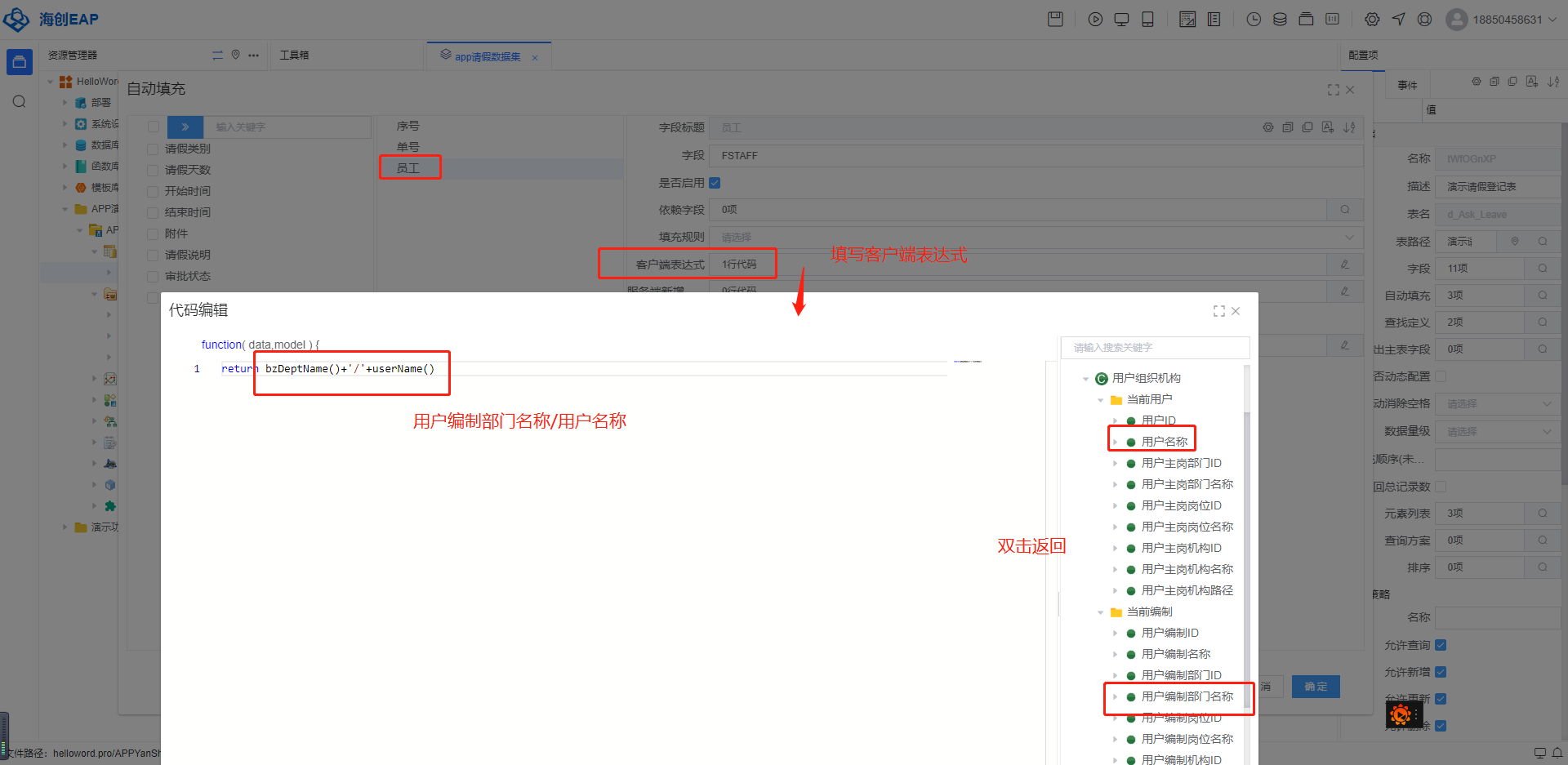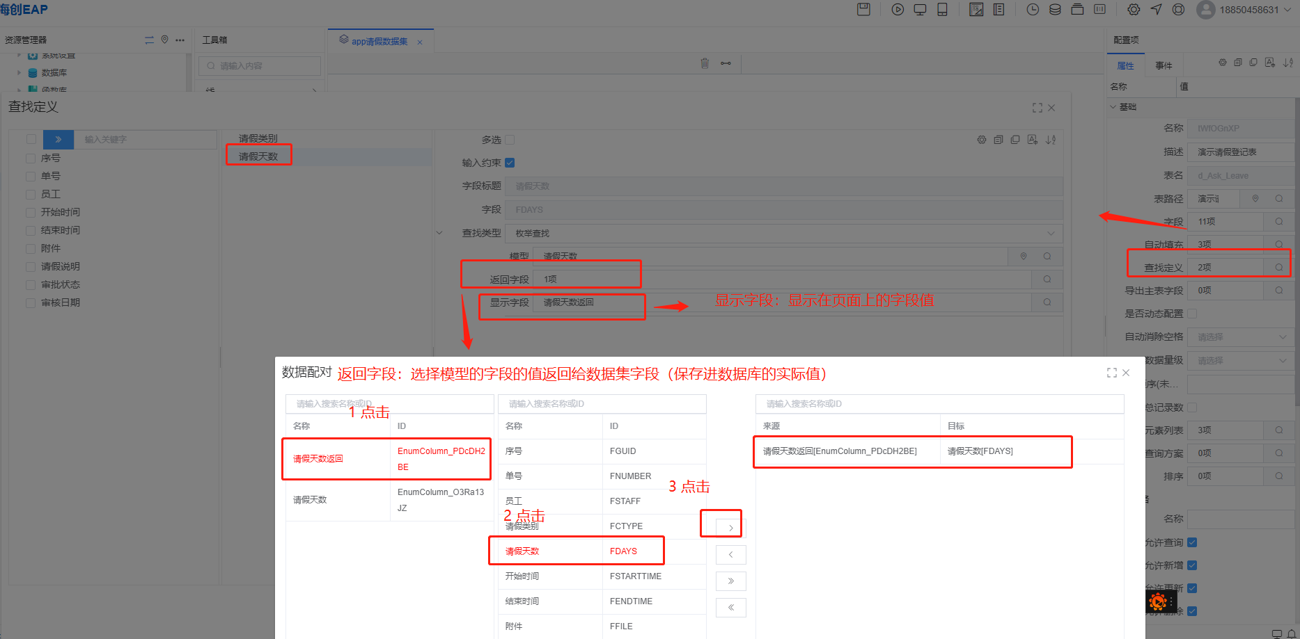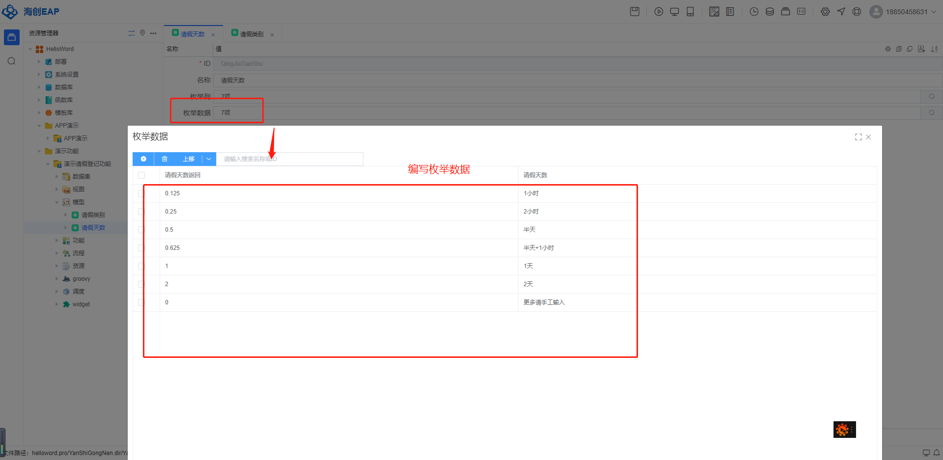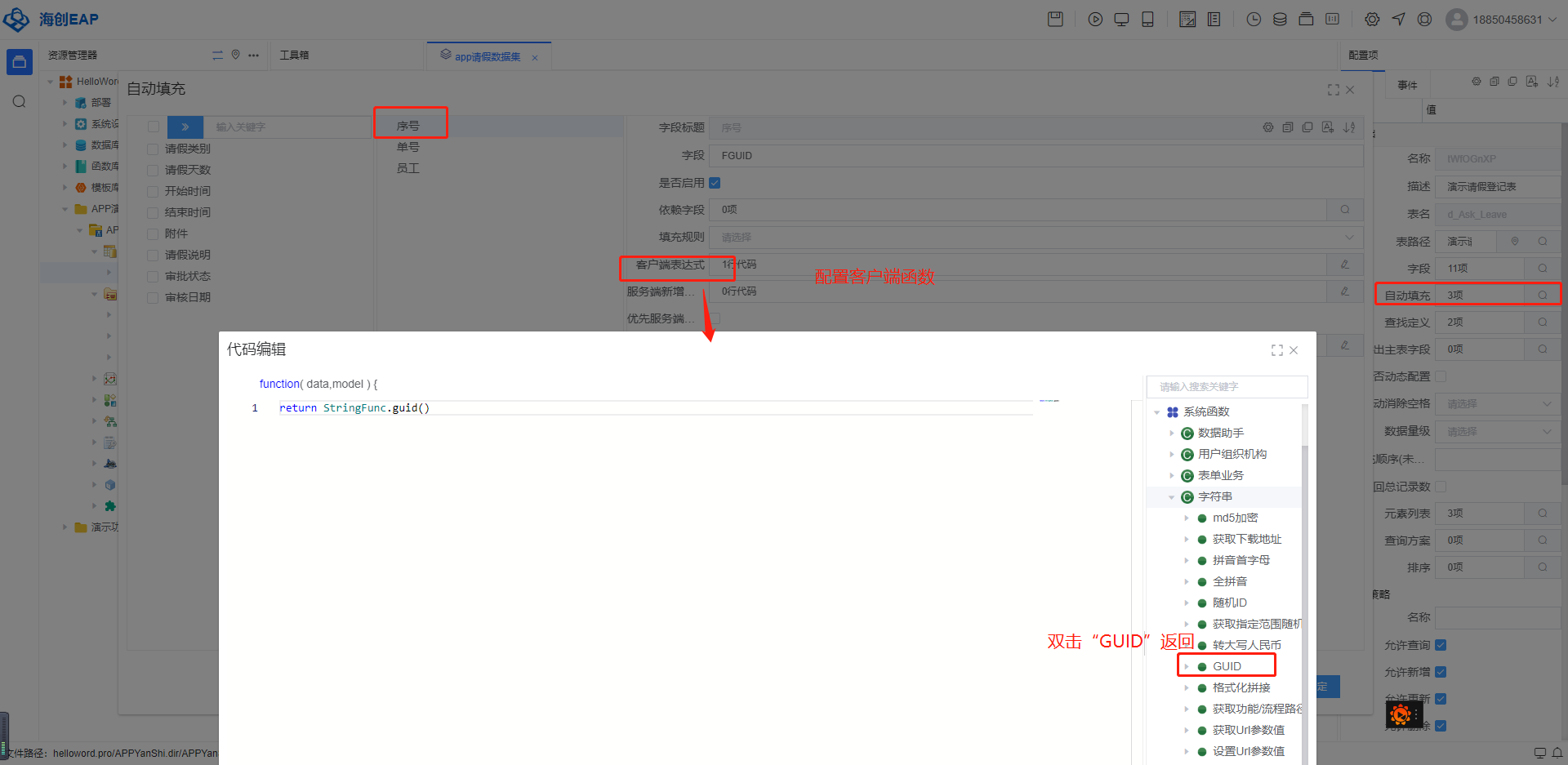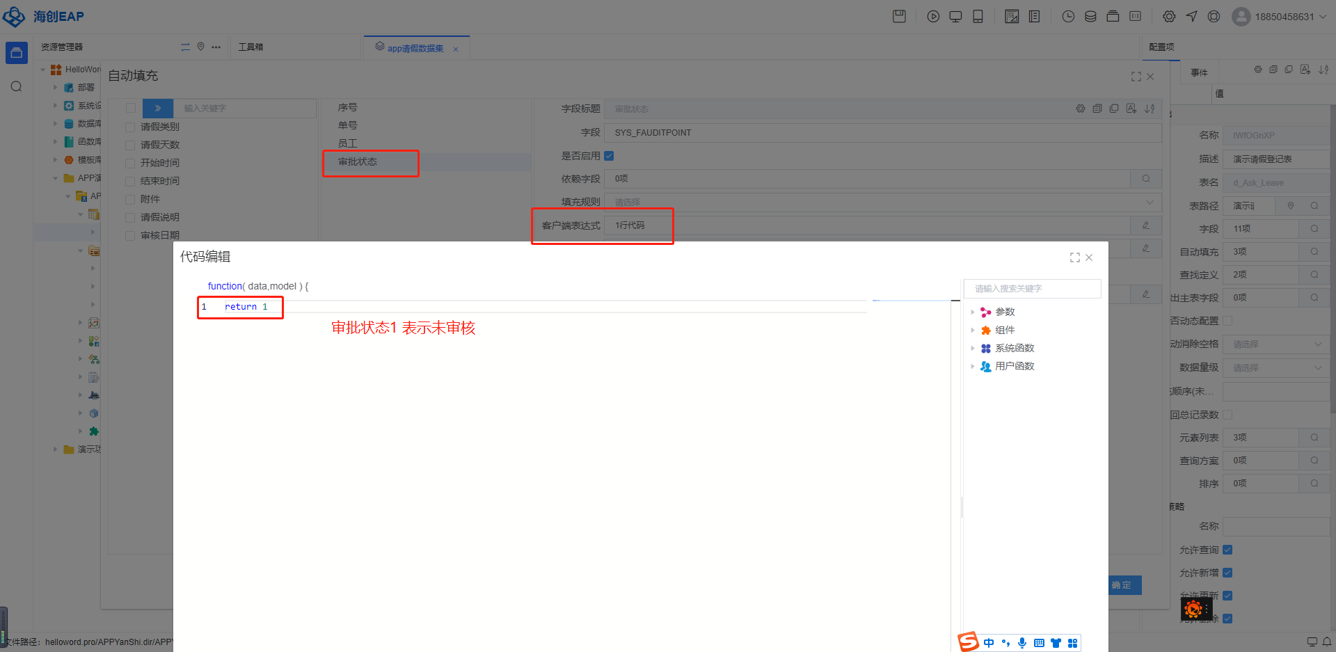## APP入门教程 ### 1、概述 本操作手册,是指导配置一个APP流程型制单功能 ### 2、操作指南 #### 2.1、建表 - 工程树中创建表并同步到数据库  #### 2.2、制单功能 ##### 2.2.1、创建目录模块   ##### 2.2.2、创建数据集  - 添加实体&绑表  - 添加字段  - 字段只读、必填配置  - 自动填充配置 1)GUID配置  2)单号配置   添加单号规则  3)员工配置  4)审核标识  - 查找定义配置 添加枚举模型 1)请假天数模型配置   2)请假类别模型配置   查找定义配置   - 元素列表配置 流程型功能的数据集需要配置  ##### 2.2.3、创建视图  - 新增手机视图 - 视图页面配置 1)添加数据集  2)添加导航栏  3)添加表单   4)添加流程栏  5)配置单号激活 流程型功能的数据集需要配置  #### 2.3、创建流程  - 添加流程 - 添加环节、连线(注意:避免重复连线)  - 绑定表单界面  - 活动办理人配置(首环节无需配置  #### 2.4、分配菜单 - 添加菜单子节点  - 添加要分配菜单的功能   #### 2.5、分配权限 - 选择分配对象以及分配功能菜单