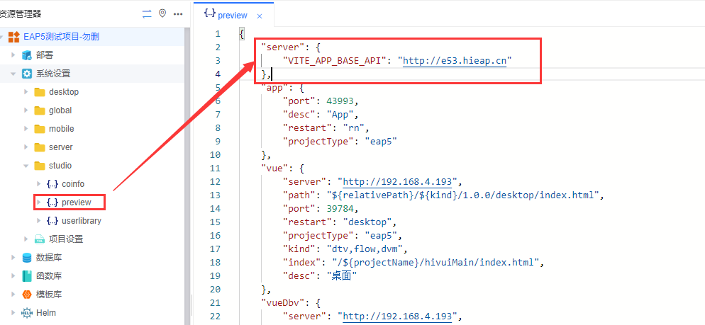 ## QieHuanHouDuanFuWu 打开:系统设置/studio/preview.json  在文本中添加server变量 ``` server": { "VITE_APP_BASE_API": "http://e53.hieap.cn" }, ``` 最后重启桌面端服务: