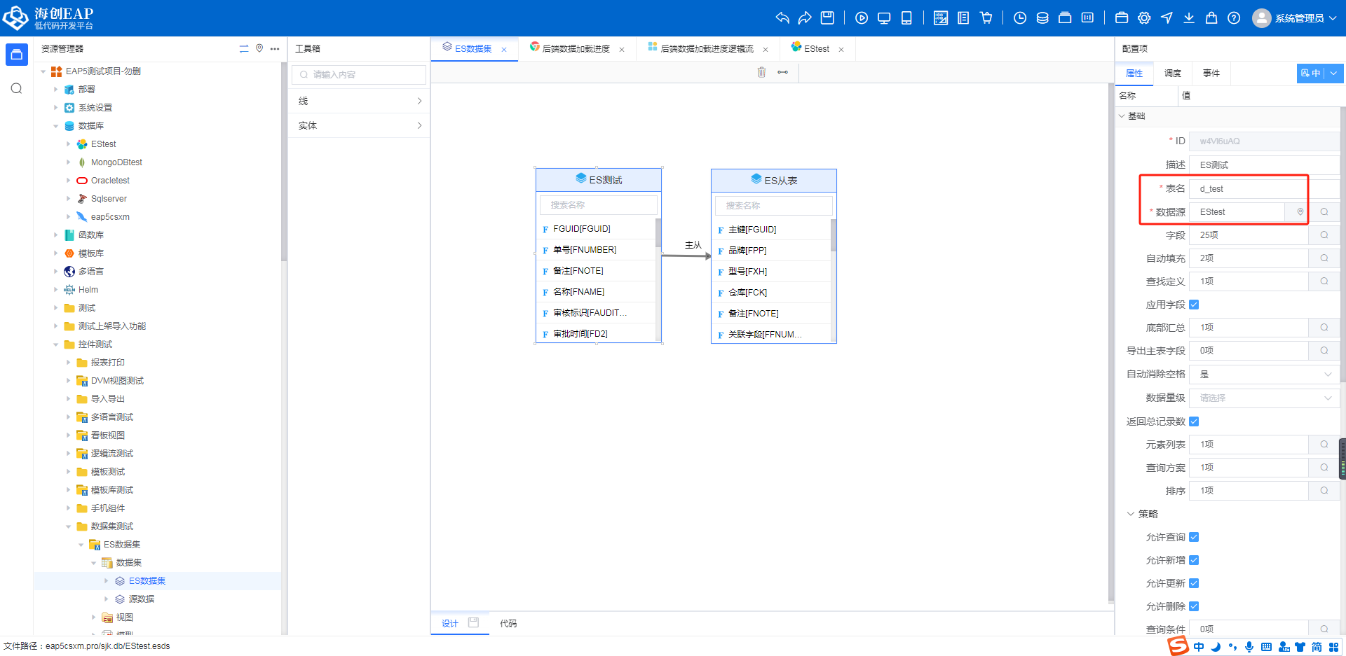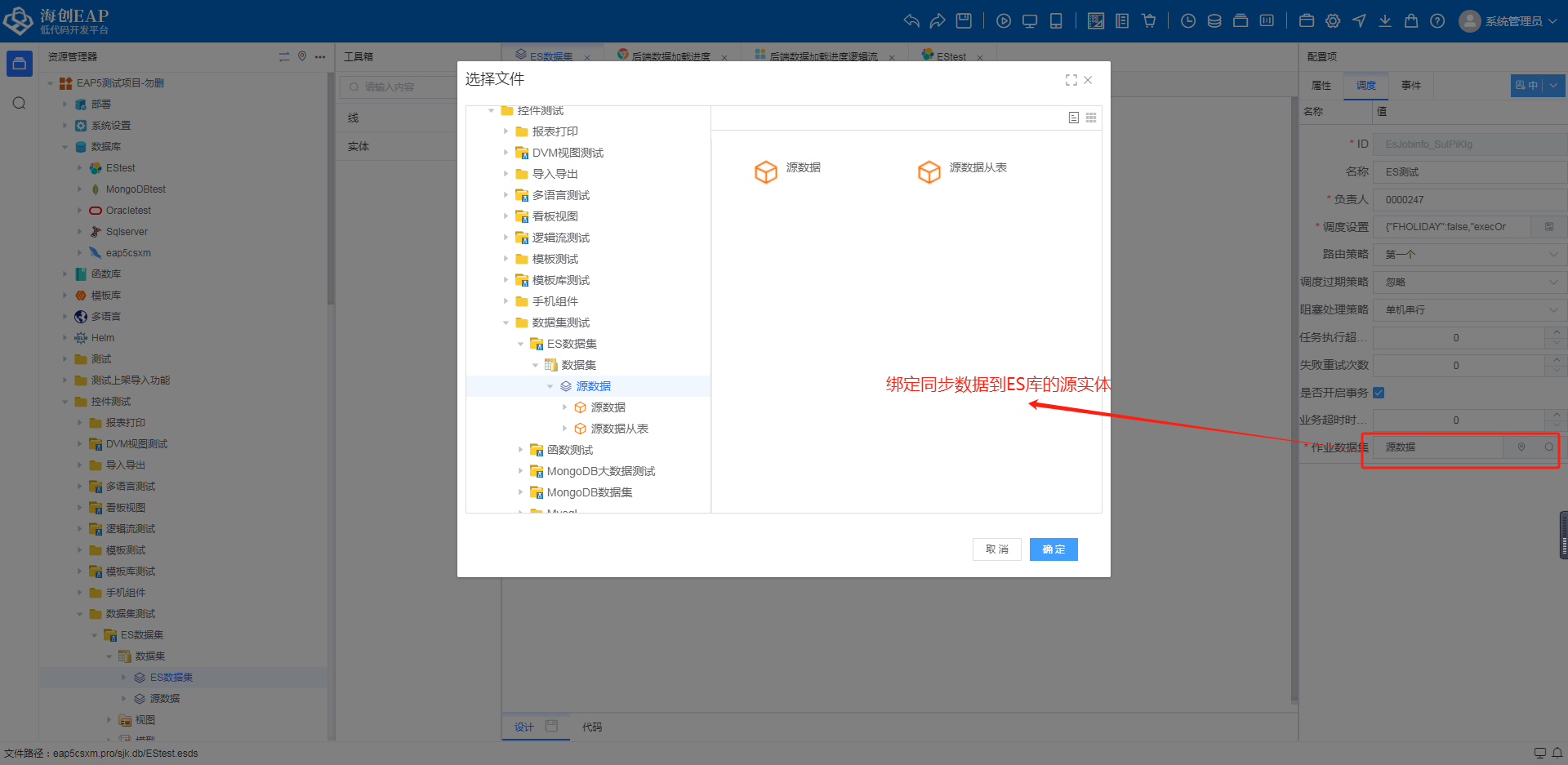 ## ES数据集 ### 1、数据源配置  ### 2、实体配置 - 表名:ES索引名 - 数据源:绑定ES数据源 - 导入字段:字段来源于 调度>作业数据集 注:其余配置与标准实体类似  ### 3、调度配置 - 作业数据集:绑定用于同步到ES库中的数据对应实体 注:其余配置与常规作业调度配置方式一致
