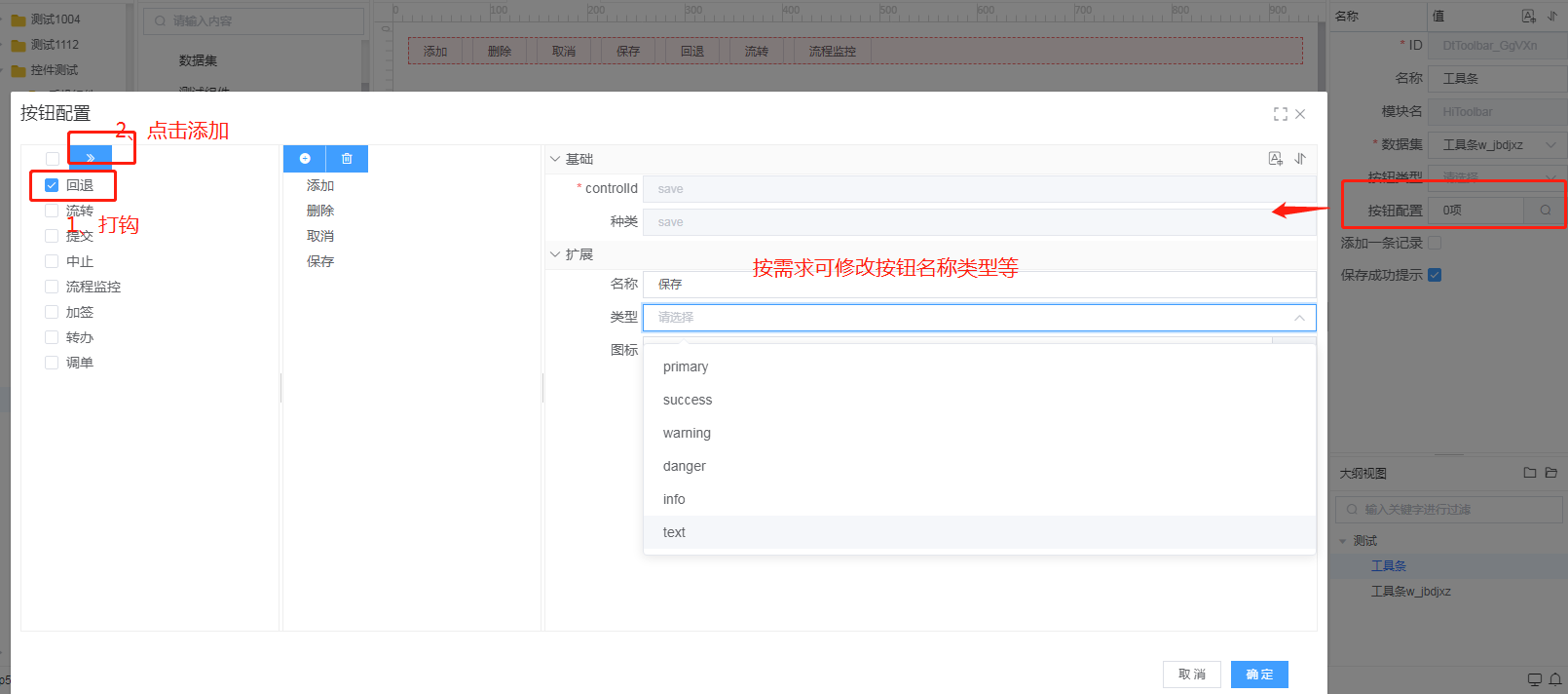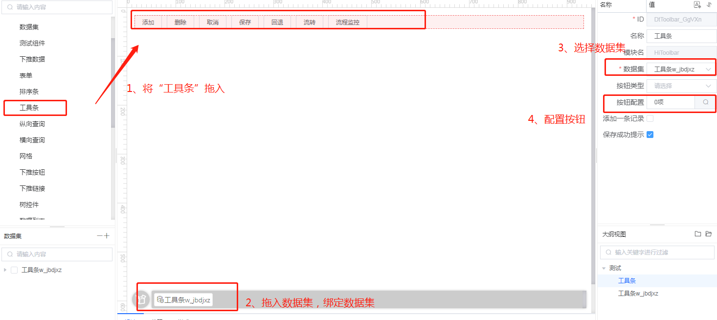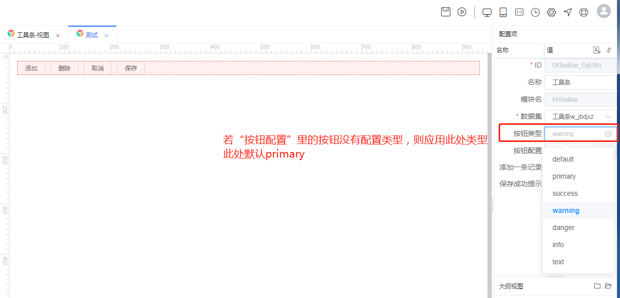 ## 数据工具条 ### 添加工具条  ### 添加按钮  ### 效果展示  - 按钮类型  #### 属性 - 添加一条记录 打钩后,数据集超过一条记录时,添加按钮不可操作 - 保存成功提示 默认打钩,打钩后,点击“保存”按钮,会有保存成功提示