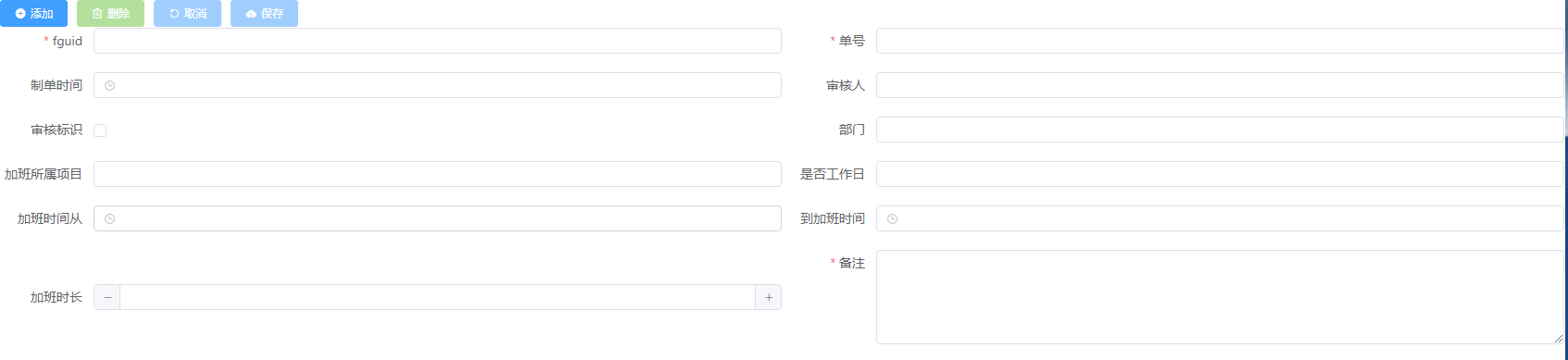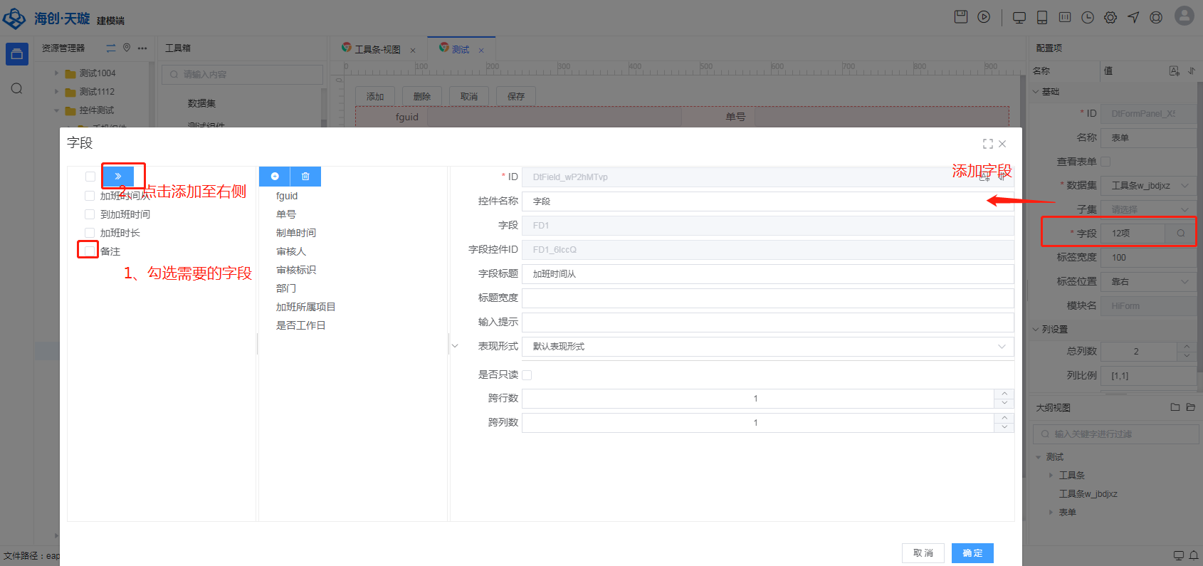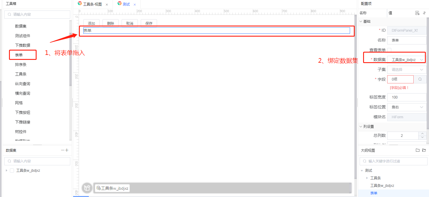 ## 表单 ### 添加表单  ### 表单添加字段  ### 效果展示  ### 字段属性配置  效果展示  ### 表单属性配置 1、标签宽度 设置全局的标签宽度,默认100。字段标题宽度>标签宽度比例>全局标签宽度 2、标签位置 设置标签位置,靠左、靠右、靠上,按需设置 3、列设置 - 总列数:默认2,即字段分为两列显示 - 列比例:配合“总列数”使用,格式为[x,y,z,...],总列数默认2,列比例默认[1,1],第一个数字代表第一列,第二个数字代表第二列,即两列按1:1的比例显示,若修改成[2,1],意为两列按2:1的比例显示。修改总列数为3,列比例可自动默认修改为[1,1,1],表示三列按1:1:1的比例显示,以此类推。 - 标签宽度比例:配合“总列数”使用,格式为[x,y,z,...],总列数默认2,列比例默认[1,1],标签宽度比例默认[100,100],用法与“列比例”一致。