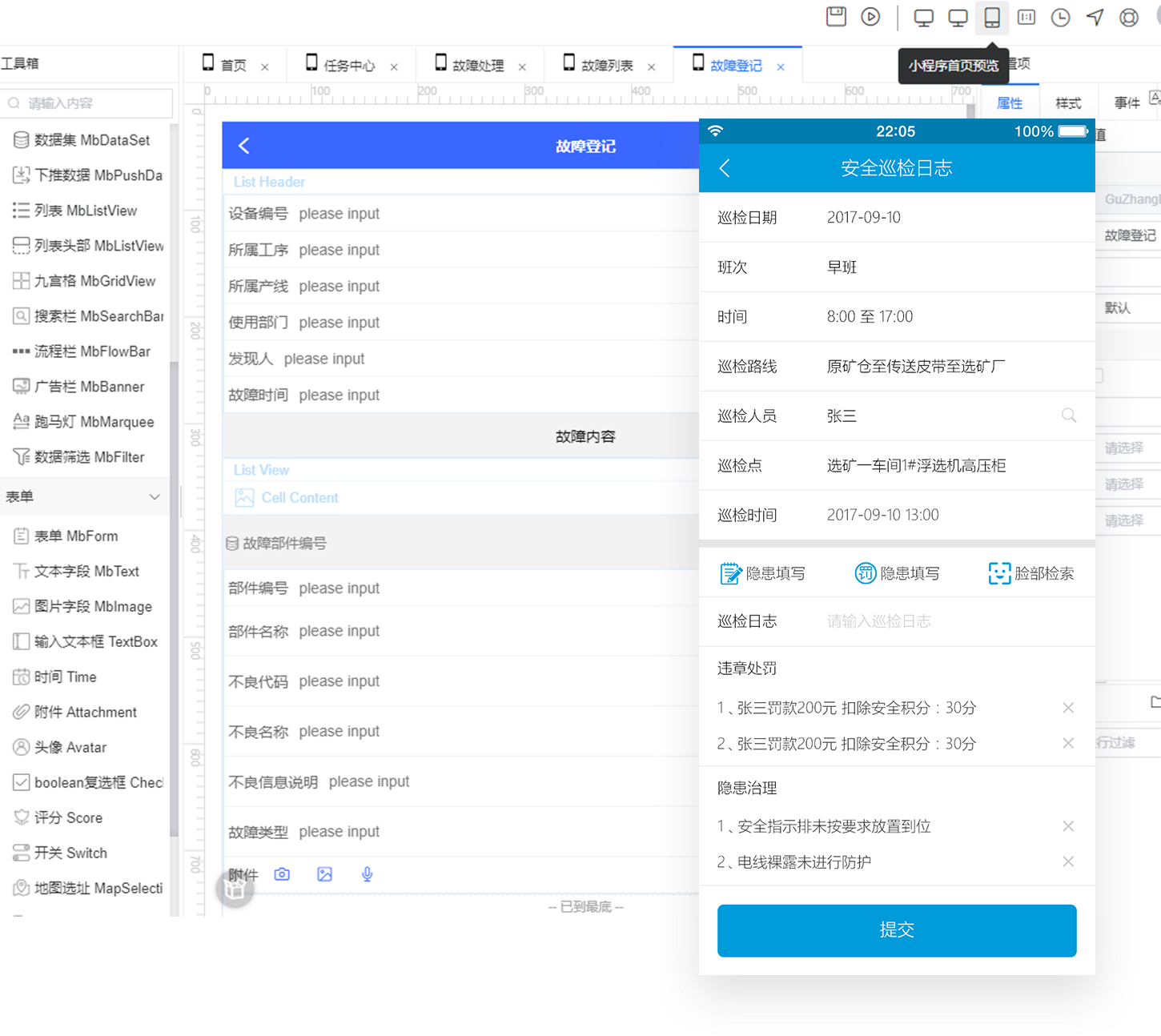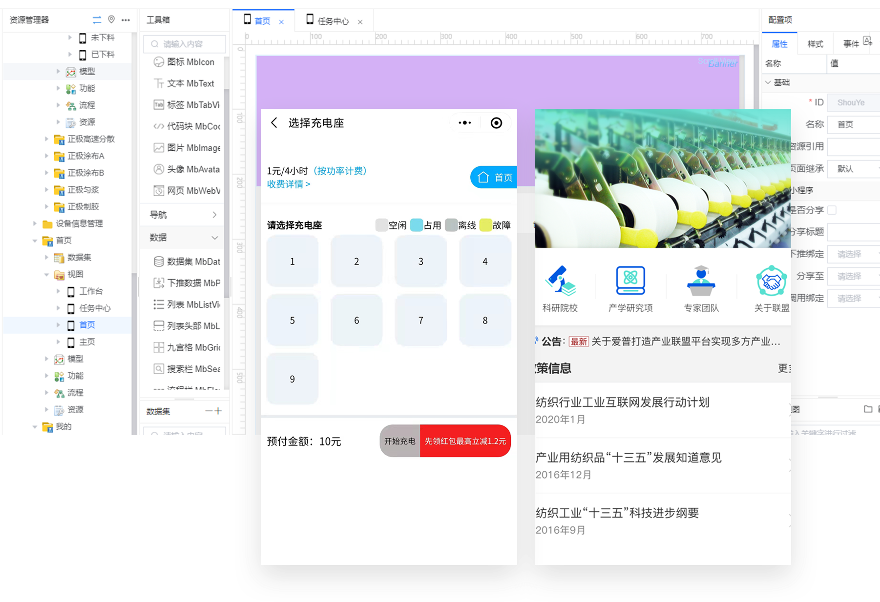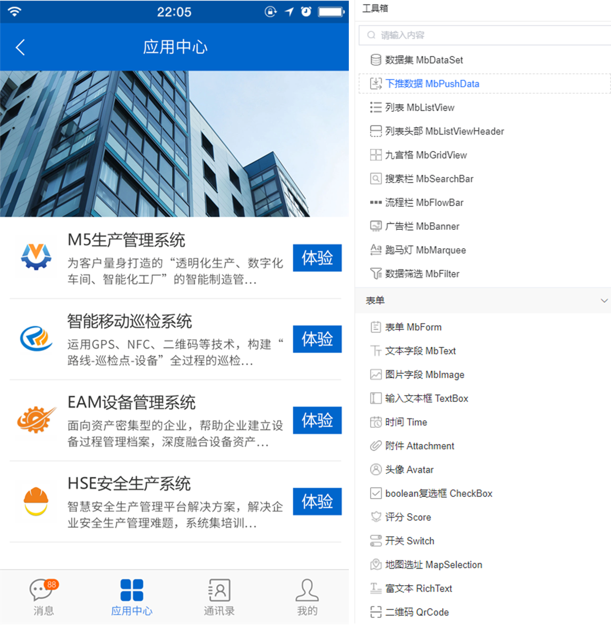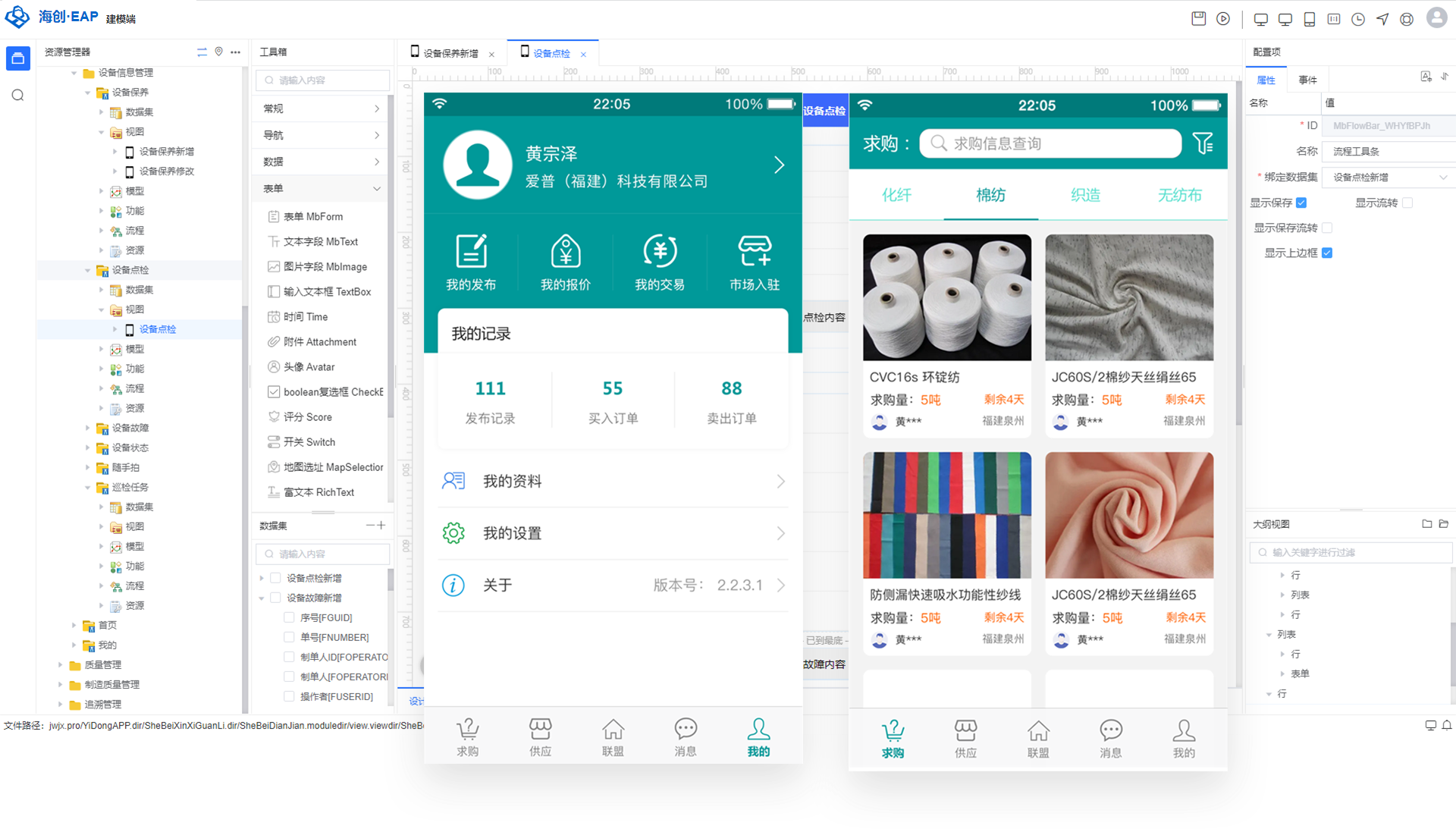 ## EAP-Moblile 移动平台 EAP-Moblile 提供的移动开发平台是“所见即所得”的可视化设计工具,支持拖拽式自定义表单界面,快速实现移动业务数据与页面元件的数据绑定,可进行小程序、移动 APP、H5 应用的开发,并提供一键打包部署。     ### 降低移动开发门槛,降低人员技术要求 所见即所得的可视化设计工具,支持拖拽式自定义业务界面,通过简单的拖拉拽将需要的元件拖拽到设计上,快速实现移动端业务数据与页面元件的数据绑定,同时整合MES、巡检、设备管理等,支持企业内部通讯,自由式打包部署等。大大降低了移动开发门槛,降低人员的技术要求,从而降低移动开发成本。   ### 可视化开发,适配多种移动设备 可视化设计器工具,简化面对各种移动设备的开发复杂度,支持一套代码、多平台运行。通过采用跨平台应用容器与 React Native 技术,完美解决跨平台开发技术难题,实现移动应用对 Android、iOS 等移动操作系统的支持,支持PDA和大屏设备。  ### 丰富的组件库、模板库、API,无需重复开发 提供强大的移动组件库、模板库及API等,丰富平台功能,对接市面主流业务场景,主要包括:常规组件、表单组件、导航组件、数据组件、布局组件、图表组件、社交分享组件、NFC、离线存储、地理位置、蓝牙、二维码组件API等技术组件和丰富的行业模板等平台解决方案,从而使开发人员实现组件资产复用,提高开发效率。   ### 一次 APP 配置,多平台通用 简化面对各种移动设备的开发复杂度,一次配置,多平台运行。通过采用跨平台应用容器与 React Native 技术,完美解决跨平台开发技术难题,实现移动应用对 Android、iOS 等移动操作系统的支持。     ### 布局方式,灵活搭配,所见即所得 可视化设计器有多种布局组件、模板,可灵活布局,页面搭建更加灵活,开发者可以选择最适合的方式搭建自己的页面和程序,提高灵活性的同时也提高了平台的效率。  ### 提供统一的移动门户功能 提供统一的移动门户功能,内置应用管理、消息中心、任务中心、通讯录、流程支撑、组织机构、IM 即时通讯等功能,应用统一管理、统一入口(常规登录、第三放登录、短信登录、扫码登录 ,生物识别),降低移动应用的管理成本。