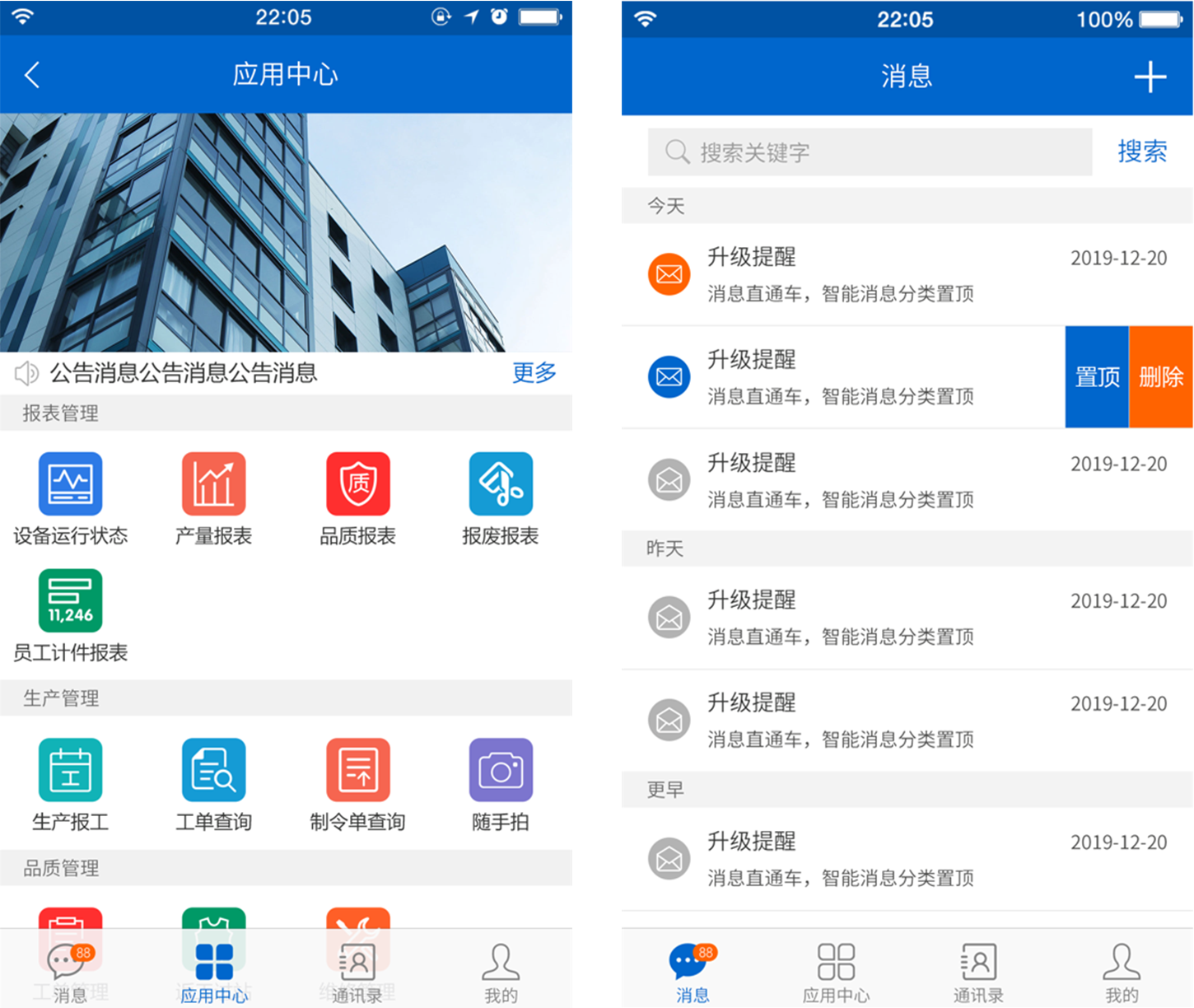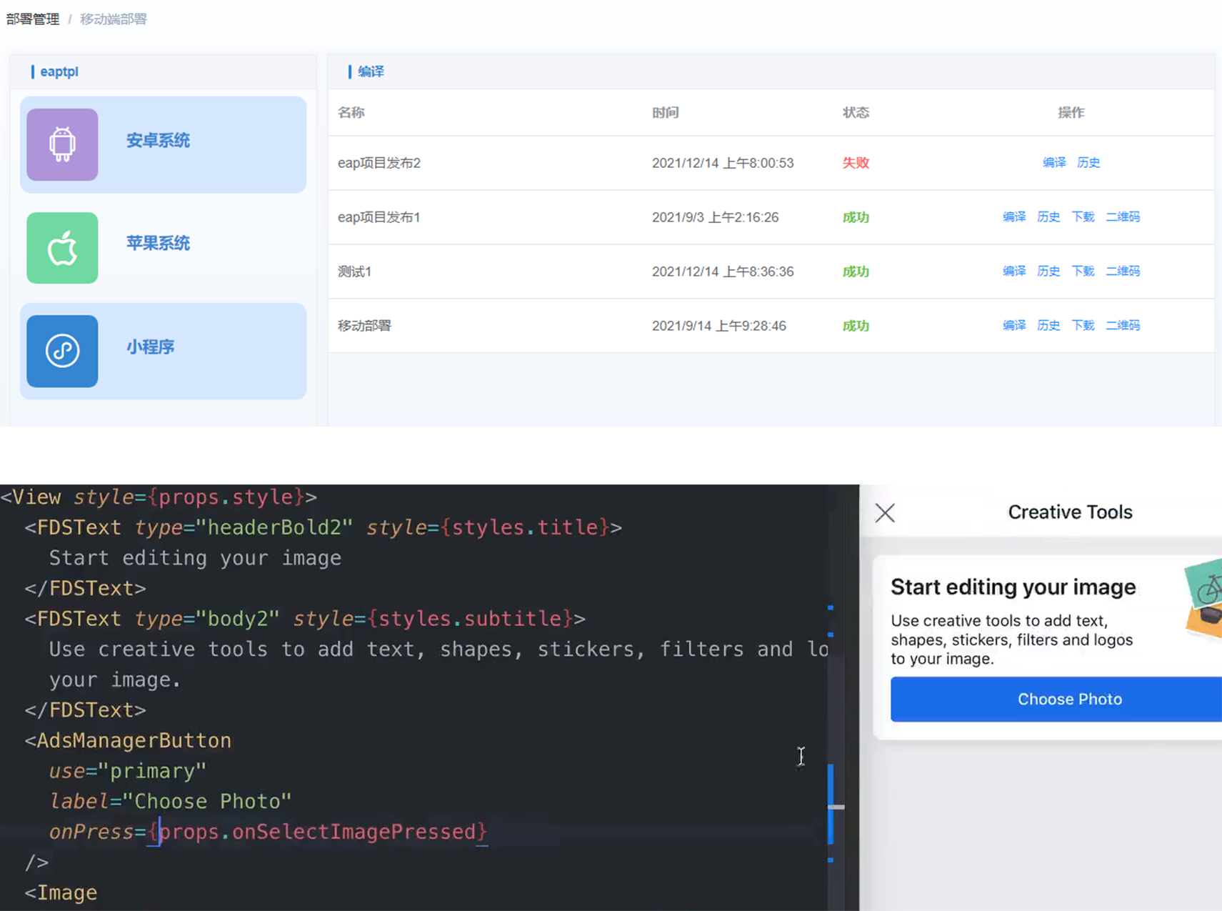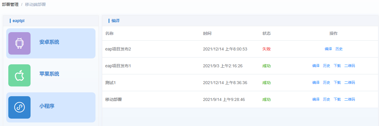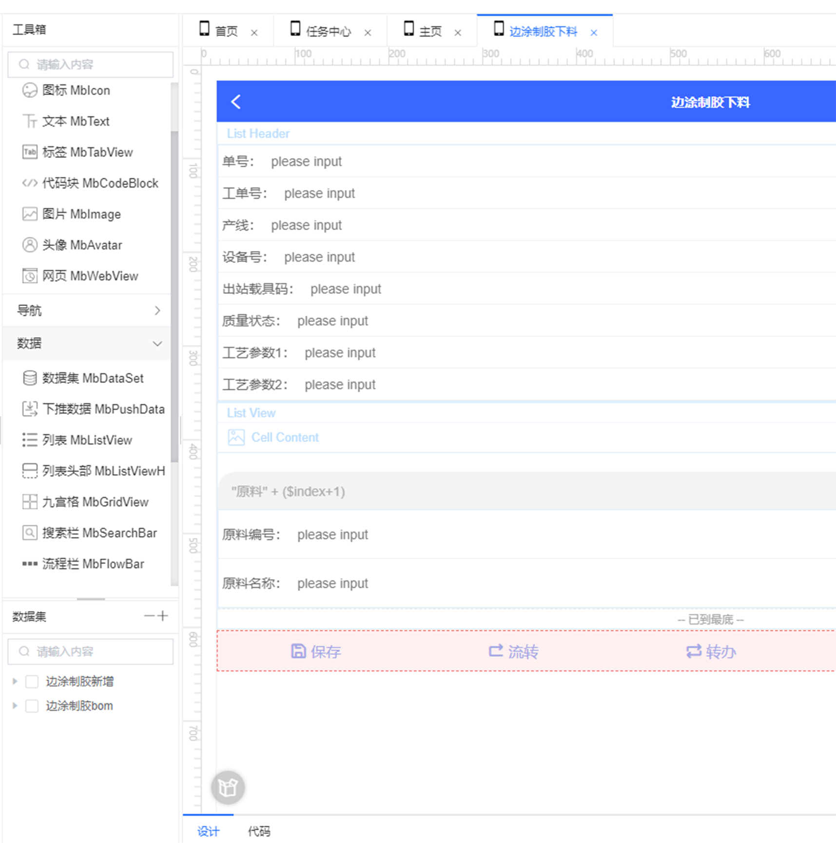 ## EAP-Moblile 移动平台 EAP-Moblile 提供的移动开发平台是“所见即所得”的可视化设计工具,支持拖拽式自定义表单界面,快速实现移动业务数据与页面元件的数据绑定,可进行小程序、移动 APP、H5 应用的开发,并提供一键打包部署。     ### 降低移动开发门槛,降低人员技术要求 所见即所得的可视化设计工具,支持拖拽式自定义业务界面,通过简单的拖拉拽将需要的元件拖拽到设计上,快速实现移动端业务数据与页面元件的数据绑定,同时整合MES、巡检、设备管理等,支持企业内部通讯,自由式打包部署等。大大降低了移动开发门槛,降低人员的技术要求,从而降低移动开发成本。   ### 可视化开发,适配多种移动设备 可视化设计器工具,简化面对各种移动设备的开发复杂度,支持一套代码、多平台运行。通过采用跨平台应用容器与 React Native 技术,完美解决跨平台开发技术难题,实现移动应用对 Android、iOS 等移动操作系统的支持,支持PDA和大屏设备。  ### 丰富的组件库、模板库、API,无需重复开发 提供强大的移动组件库、模板库及API等,丰富平台功能,对接市面主流业务场景,主要包括:常规组件、表单组件、导航组件、数据组件、布局组件、图表组件、社交分享组件、NFC、离线存储、地理位置、蓝牙、二维码组件API等技术组件和丰富的行业模板等平台解决方案,从而使开发人员实现组件资产复用,提高开发效率。   ### 一次 APP 配置,多平台通用 简化面对各种移动设备的开发复杂度,一次配置,多平台运行。通过采用跨平台应用容器与 React Native 技术,完美解决跨平台开发技术难题,实现移动应用对 Android、iOS 等移动操作系统的支持。     ### 布局方式,灵活搭配,所见即所得 可视化设计器有多种布局组件、模板,可灵活布局,页面搭建更加灵活,开发者可以选择最适合的方式搭建自己的页面和程序,提高灵活性的同时也提高了平台的效率。  ### 提供统一的移动门户功能 提供统一的移动门户功能,内置应用管理、消息中心、任务中心、通讯录、流程支撑、组织机构、IM 即时通讯等功能,应用统一管理、统一入口(常规登录、第三放登录、短信登录、扫码登录 ,生物识别),降低移动应用的管理成本。