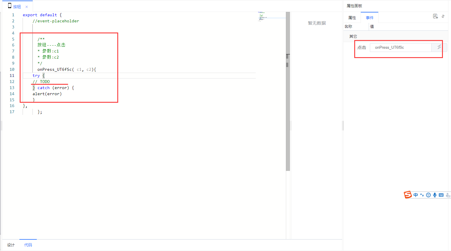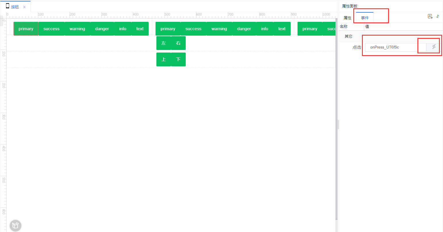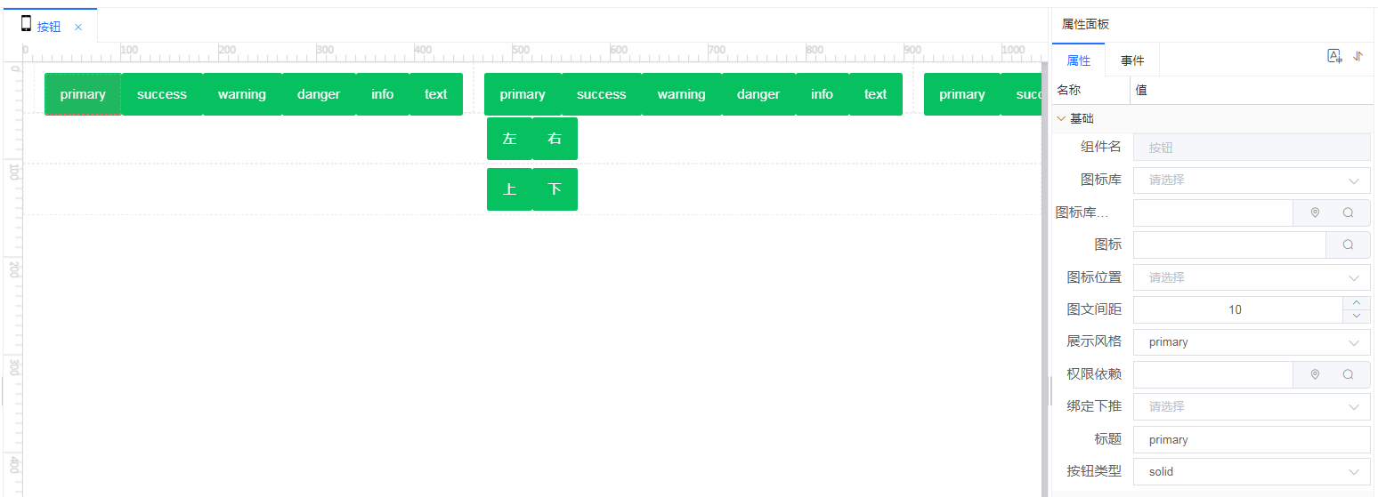 ## MbButton 按钮 按钮,可以显示文字、图标或两者结合,可配置文字和图标的相对位置,可绑定下推,可编写点击事件  ### 属性  | 属性名 | 必填 | 默认值 | 说明 | |------|----|---------|------------------------------------------------| | 图标库 | 否 | | 选择图标库 | | 图标 | 否 | | 填入图标名 | | 图标位置 | 否 | 靠左 | 选择图标位置:靠左、靠右、靠上、靠下 | | 图文间距 | 否 | 10 | 如果配置了图标和文字,该属性表示图标与文字之间的间距 | | 展示风格 | 是 | primary | 展示风格(primary/success/warning/info/danger/text) | | 权限依赖 | 否 | | 如果配置了权限,没有该权限的用户,该按钮隐藏 | | 绑定下推 | 否 | | 绑定下推,点击执行下推 | | 标题 | 否 | | 按钮的文字 | | 按钮类型 | 是 | clear | solid、clear、block三种类型 | ### 事件   在TODO底下编写事件代码 ### 函数 | 函数名 | 说明 | 参数 | |-------------|---------|-------------------| | setDisabled | 设置可用不可用 | true 不可用 false 可用 |