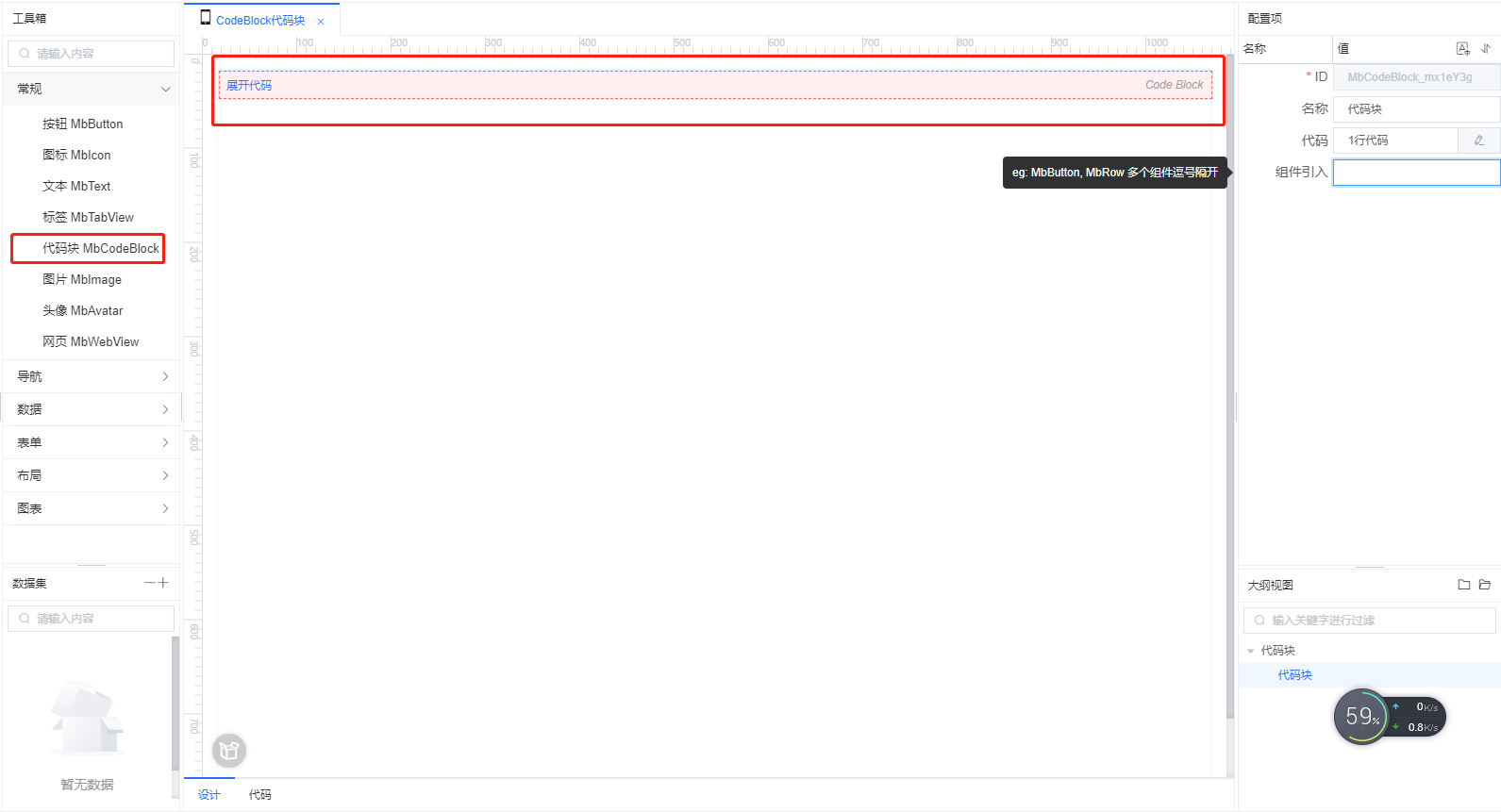 ## MbCodeBlock 代码块  ### 属性 | 属性 | 说明 | 类型 | 默认值 | |------|------------------------------------|--------|-----| | 代码 | 点击打开代码编辑器 | string | 空 | | 组件引入 | 引入要使用的组件(MbButton, MbRow 多个组件逗号隔开) | string | 空 | ### 事件 无 ### 函数 无