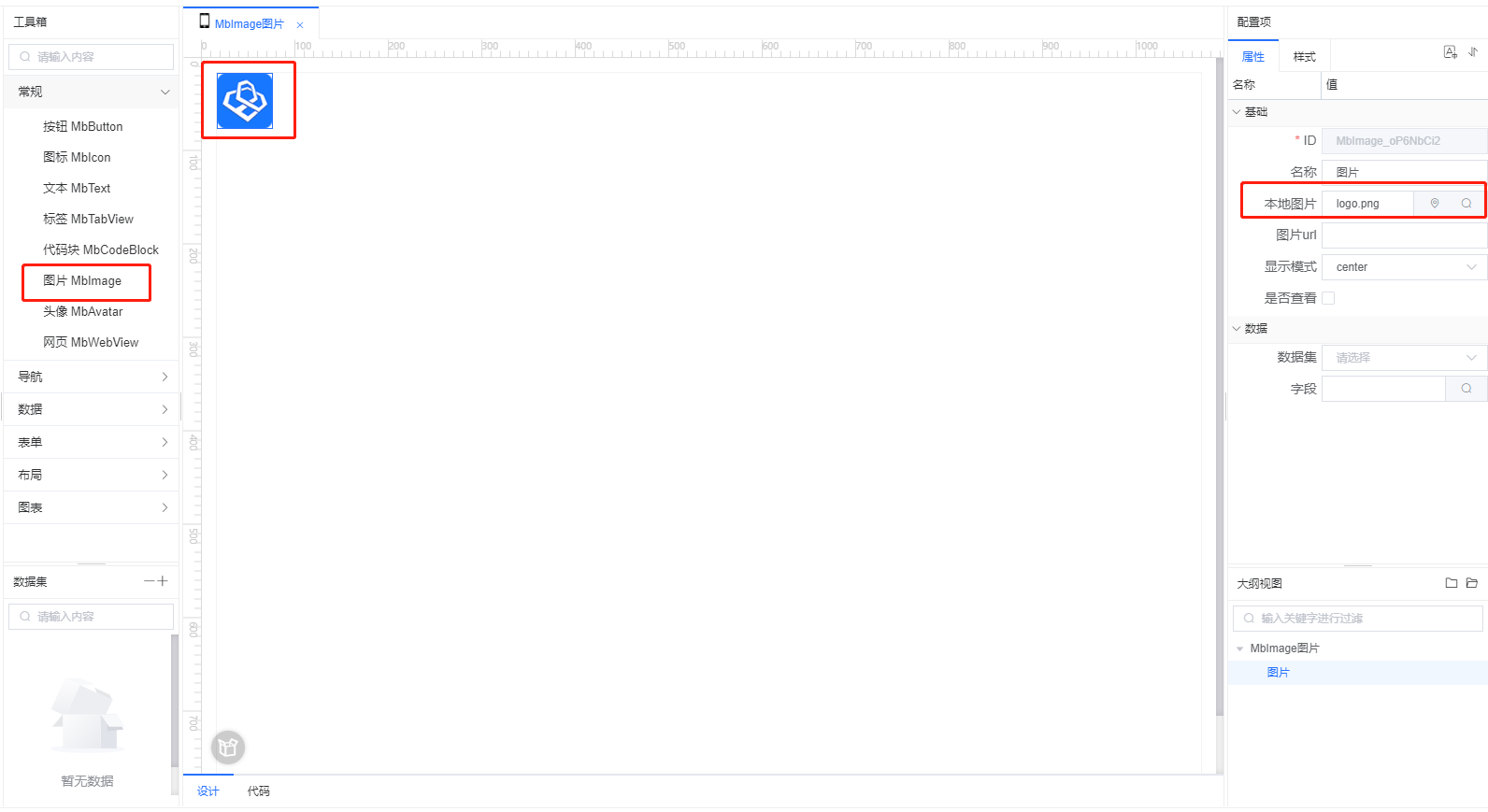 ## MbImage 图片 用于图片显示。可显示本地图片、网络图片、数据集中的附件图片等,可设置图片显示的方式,支持点击放大展示。  ### 属性 | 属性 | 说明 | 类型 | 默认值 | |-------|-------------------------------------------|-----------|--------| | 本地图片 | 可从本地选取要显示的图片 | require对象 | 无 | | 图片url | 网络图片 | url地址 | 无 | | 显示模式 | enum(cover,contain,stretch,repeat,center) | string | center | | 是否查看 | 点击放大查看 | boolean | false | | 数据集 | 选择数据集 | string | 无 | | 字段 | 选择图片附件字段 | string | 无 | ### 事件 无 ### 函数 无