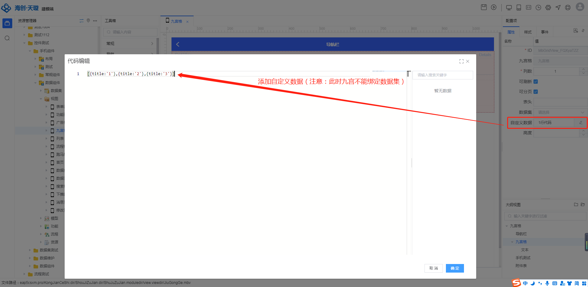 ## MbGridView 列表组件 ### 1、添加九宫格  ### 2、九宫格属性 - 列数:手机端数据显示列数 - 可刷新:勾选后手机端能通过下拉方式刷新数据 - 可分页:勾选后手机端加载数据时,按分页加载方式加载 - 表头:有添加列表头部组件时,绑定列表头部组件的ID值 - 自定义数据:自定义在九宫格中显示的数据,需为数组或数组对象格式数据 ,如['a','b','c'];[object,object,object];需在九宫格中拉入其他组件引用,引用时,数组用:$item 数组对象用:$item.key(如:$item.list) ### 3、九宫格添加内容  ### 4、自定义及非自定义数据配置及效果展示 #### 4.1、自定义数据配置   效果展示  #### 4.2、非自定义数据配置  效果展示(注:为方便查看,此处文本字段有加背景色)